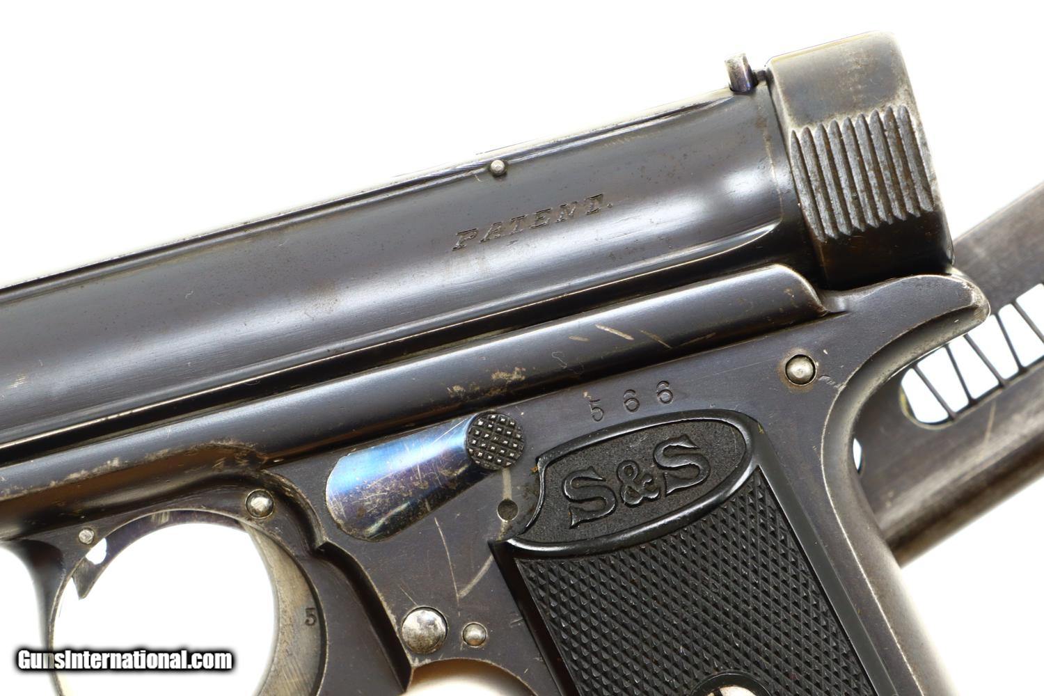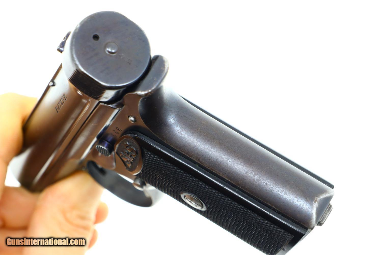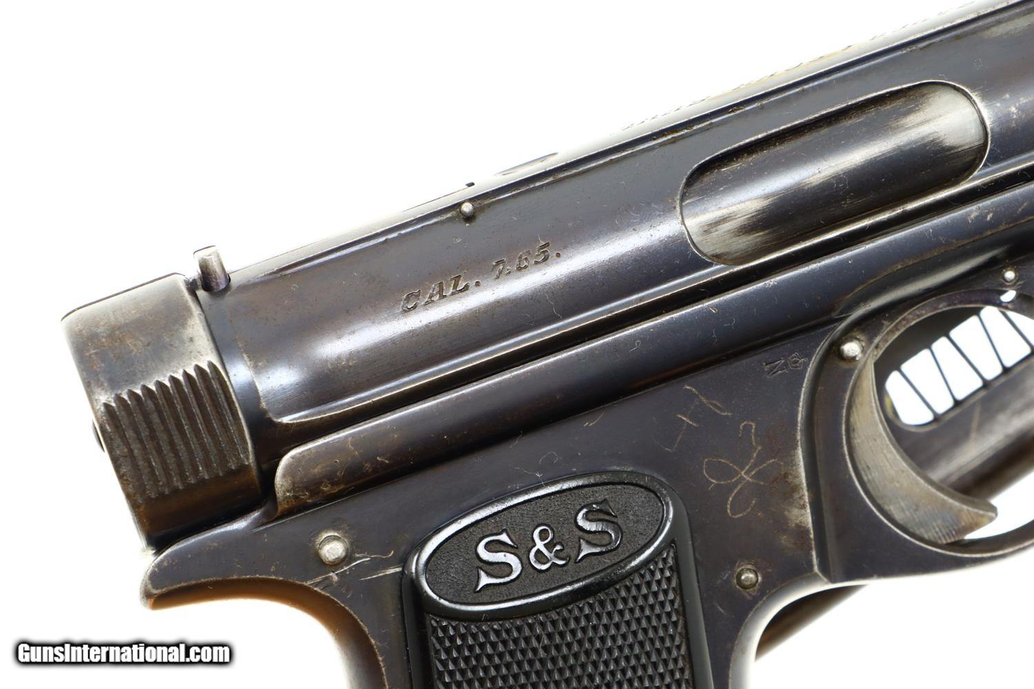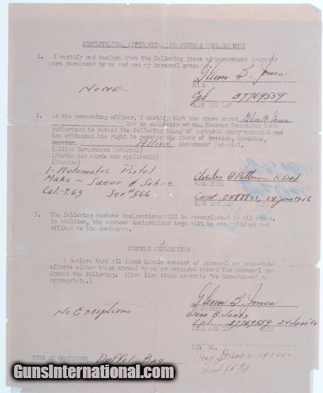 Description: Standard configuration Sauer & Sohn 1913, first variation, with fixed front and rear sights, the latter used as a stop for the firing pin retention knob. Top of slide is manufacturer marked with the left side marked “Patent” and the right side with the caliber. Full serial number on left frame that has been fitted with a push button behind the trigger guard cutout. Only the first variation pistols had this button that requires depression to fire. Crown/N proofing in usual locations. Lightly scribed “FH” on right frame. Black plastic grips with the S&S logo surmounting a checkered bordered field. Original magazine with two oval windows on each side and an unmarked fixed base. Complete with original capture paper showing SN of pistol, dated 24 June 1946, and noted to be in “Duffel Bag”. Synopsis: Super early Sauer M1913, first variation with trigger safety button, crisp original grips, correct magazine and original WWII capture paper. Condition: VG+ bright, original rust blue finish with holster wear in expected places and slight speckling/toning of the gripstraps. Crisp original grips. Bright bore with sharp rifling. Perfect manual mechanics. Capture paper with folds and minor edge losses as photographed. A super rare Sauer in its own right, even better with crisp original capture paper! A HISTORIC INVESTMENT! ~~Insured shipping fee of $65; most packages shipped using FedEx 2nd Day.~~ SOLD Manufacturer: Sauer & Sohn Serial Number: 566 Caliber Info: 7.65 mm |