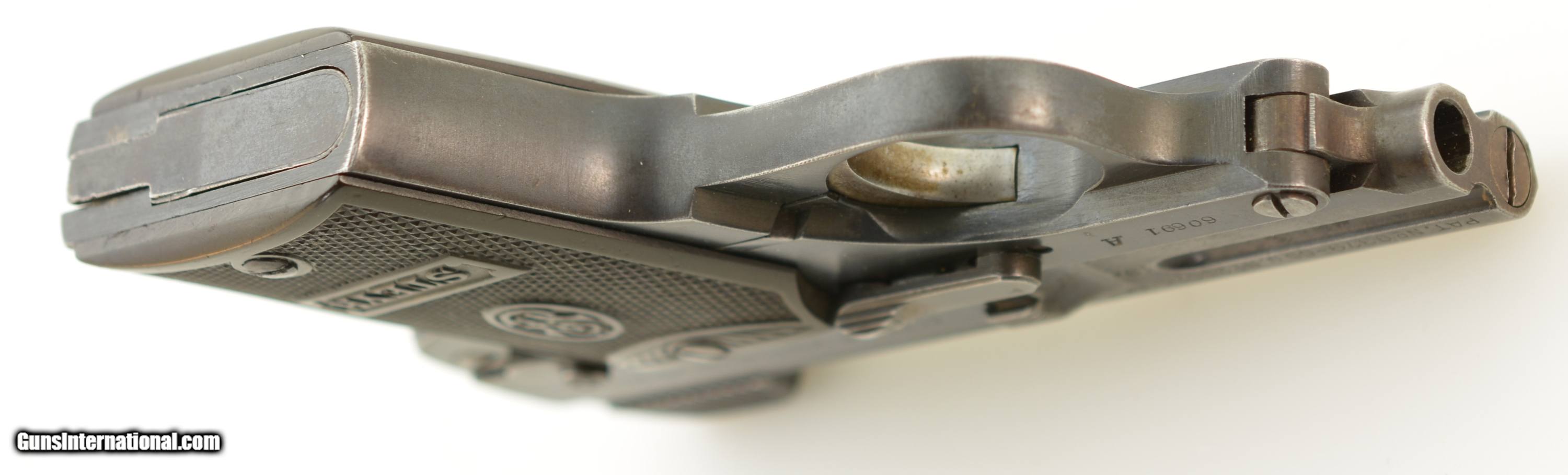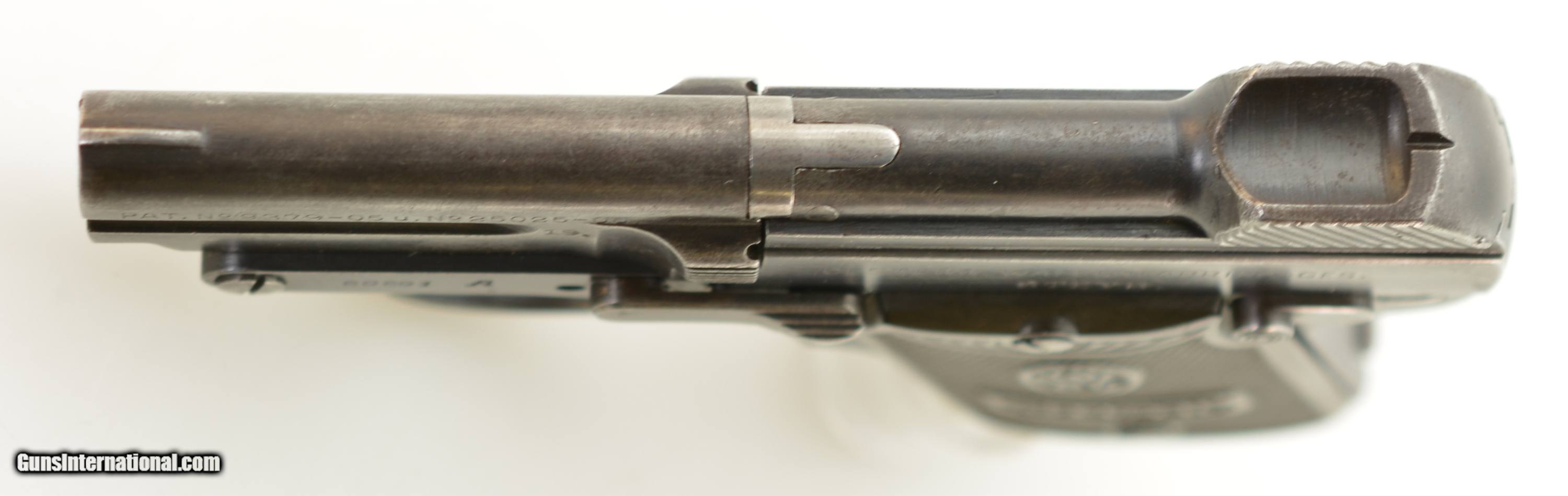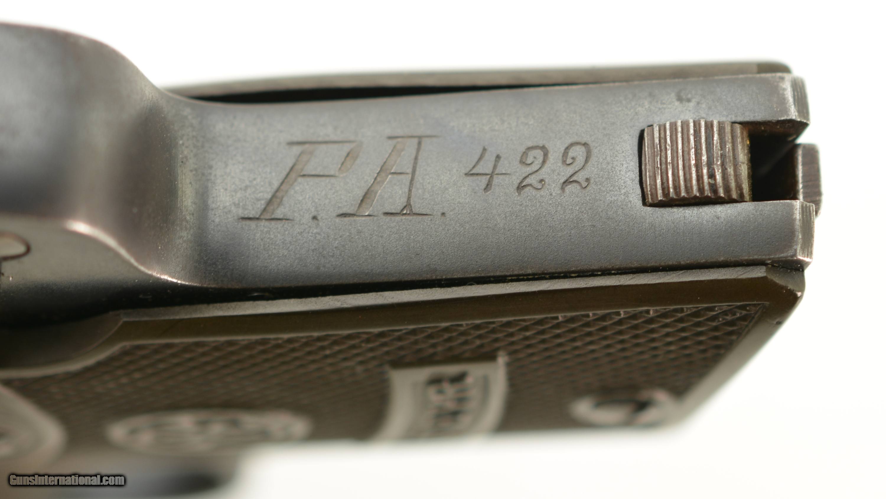 Description: Serial #60691, 6.35mm (.25 ACP), 2" barrel with a fine, bright bore. This is a handsome little, Steyr-marked pistol that has retained 85-90% of the original blue finish that has silvered along the exposed edges, and has some mild surface freckling along the top of the tip-up barrel. The checkered hard rubber grips are in very good-fine shape with some flattening of the points, and a single original magazine is included. The pistol has two Austro-Hungarian unit markings: one on the right side of the frame: “Kr. 63" (Croatian 63rd regiment); and “P.A. 422" on the backstrap (unknown, possibly Czech artillery, or a Pionier unit); and rates fine condition overall. FFL or C&R SOLD Curio/Relic: Yes Manufacturer: Pieper Model: 1908 Serial Number: 60691 Caliber Info: .25 ACP Gauge Info: .25 ACP |