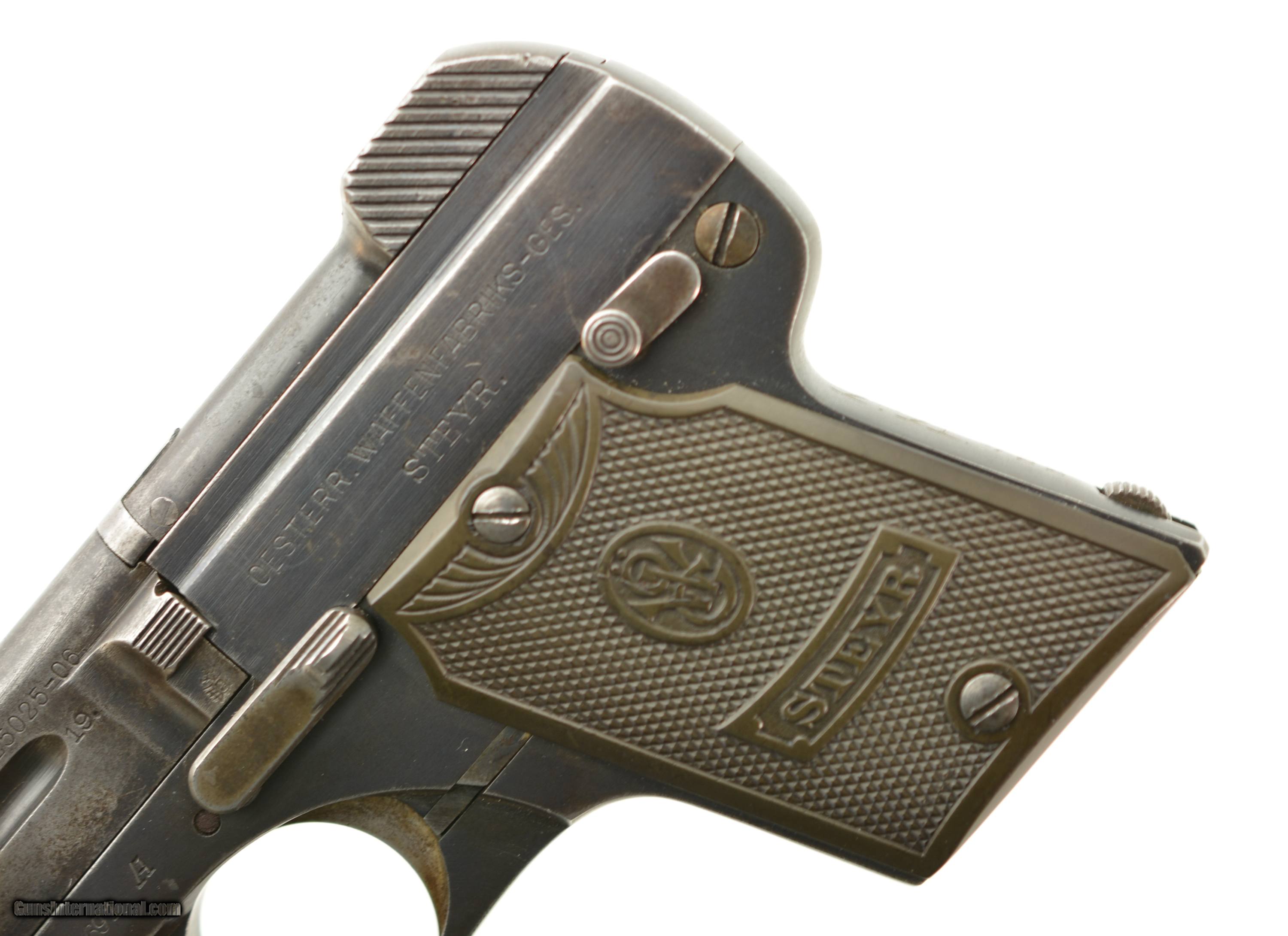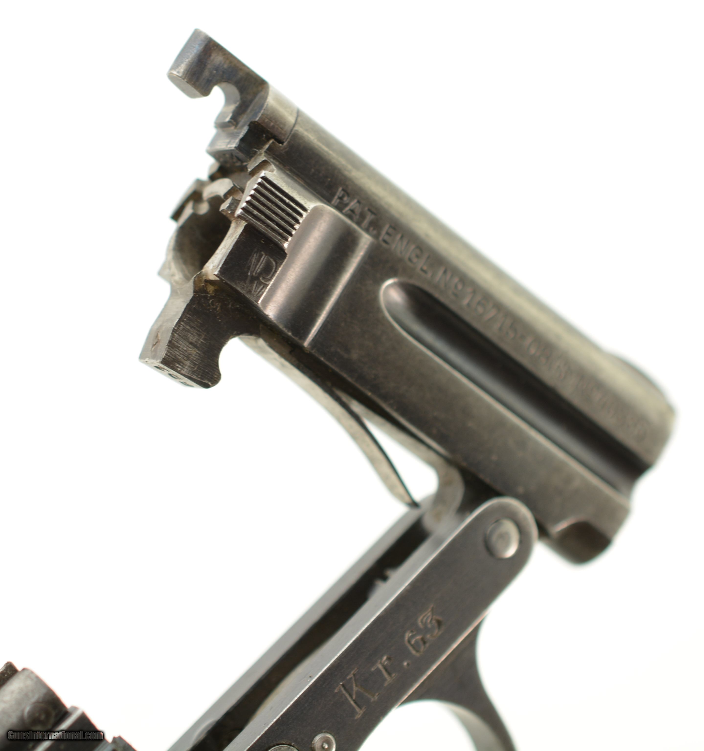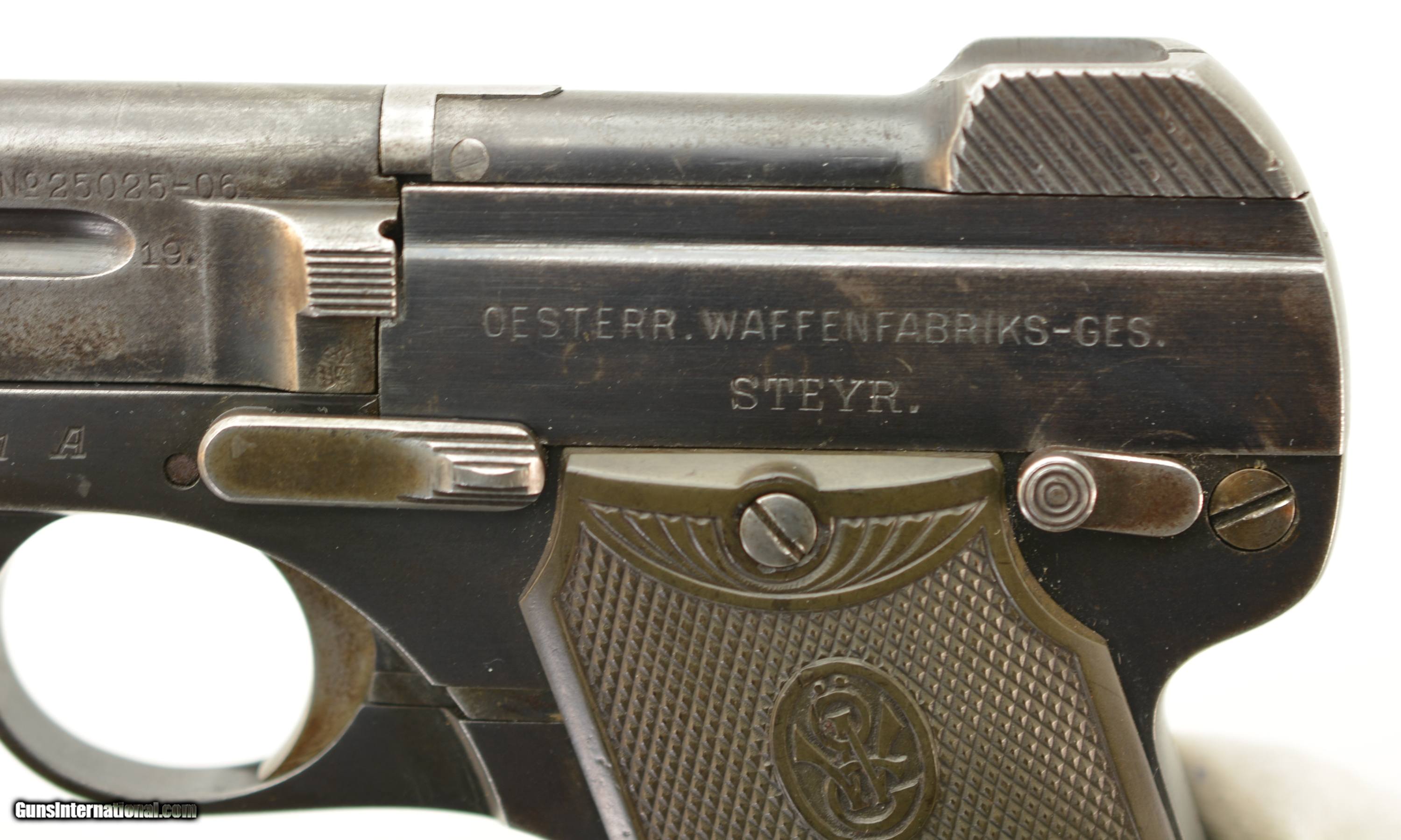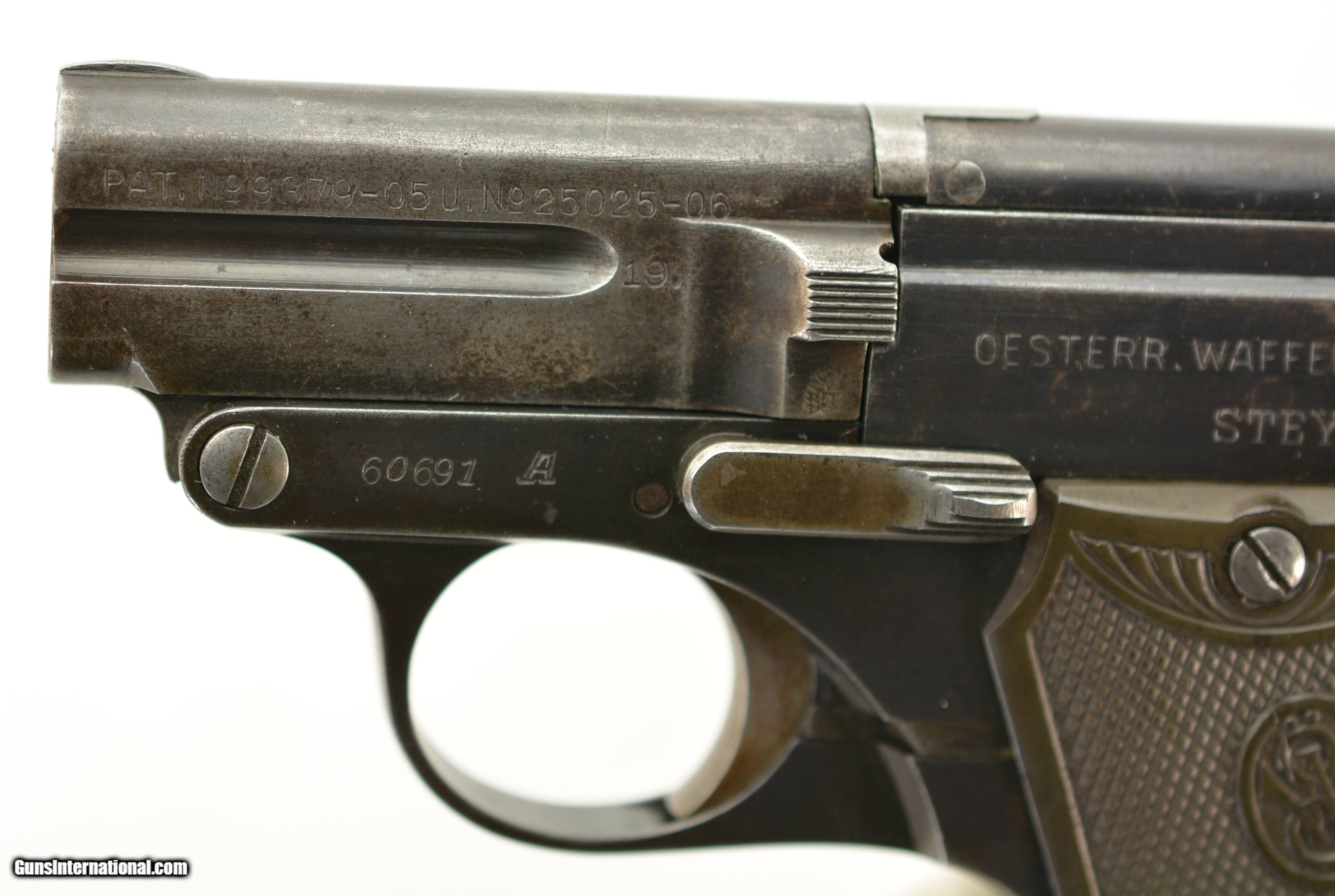 Description: Serial #60691, 6.35mm (.25 ACP), 2" barrel with a fine, bright bore. This is a handsome little, Steyr-marked pistol that has retained 85-90% of the original blue finish that has silvered along the exposed edges, and has some mild surface freckling along the top of the tip-up barrel. The checkered hard rubber grips are in very good-fine shape with some flattening of the points, and a single original magazine is included. The pistol has two Austro-Hungarian unit markings: one on the right side of the frame: “Kr. 63" (Croatian 63rd regiment); and “P.A. 422" on the backstrap (unknown, possibly Czech artillery, or a Pionier unit); and rates fine condition overall. FFL or C&R SOLD Curio/Relic: Yes Manufacturer: Pieper Model: 1908 Serial Number: 60691 Caliber Info: .25 ACP Gauge Info: .25 ACP |