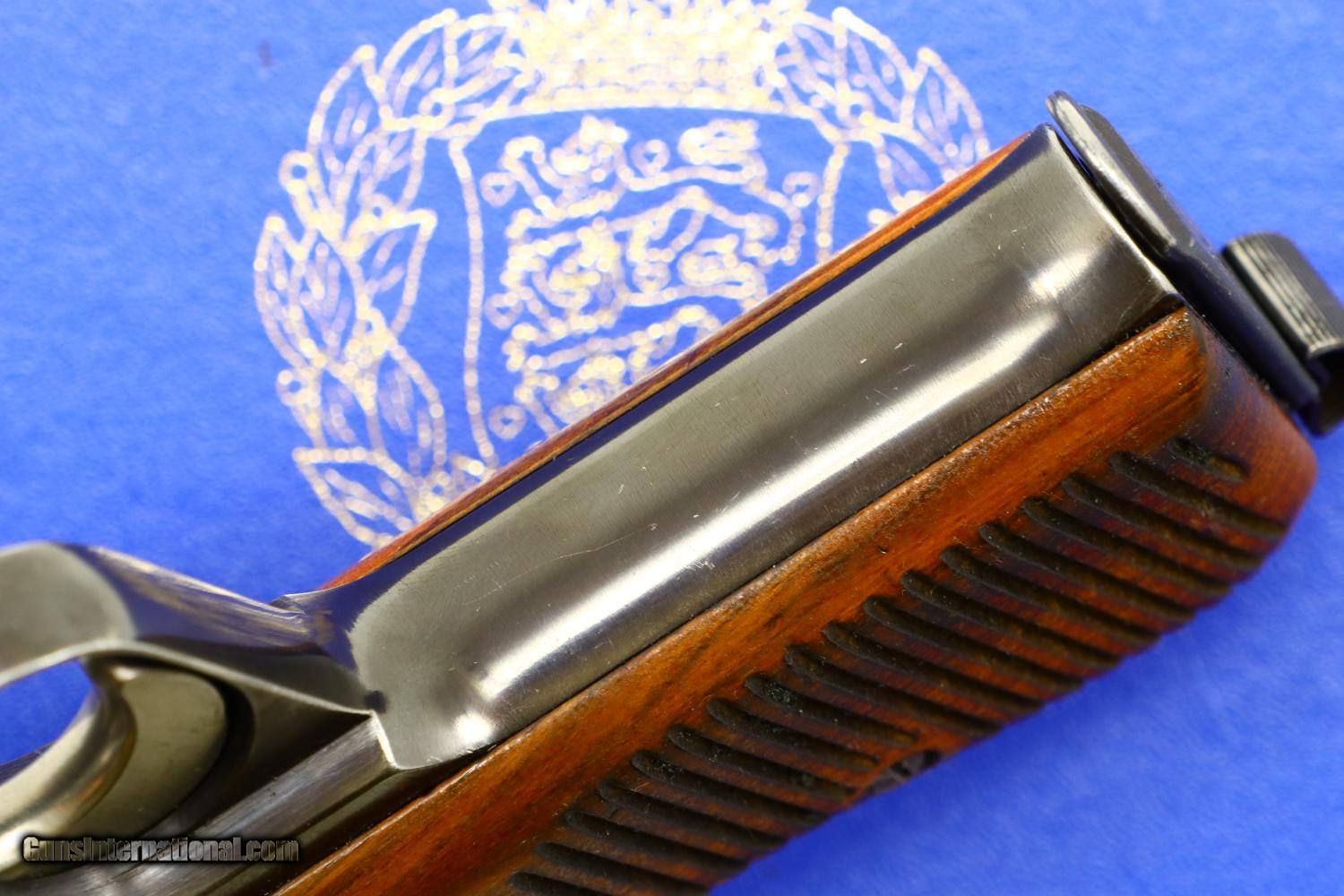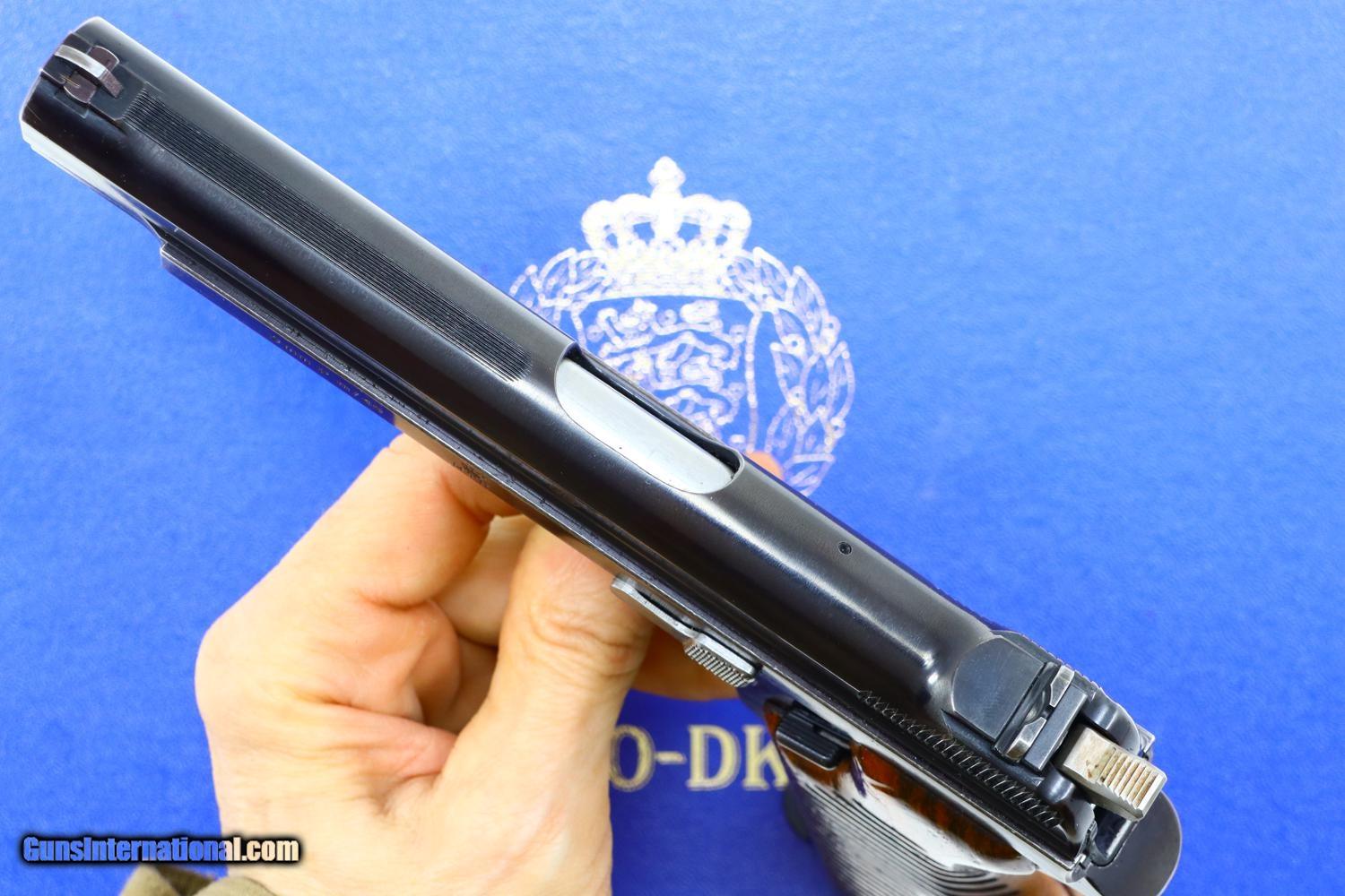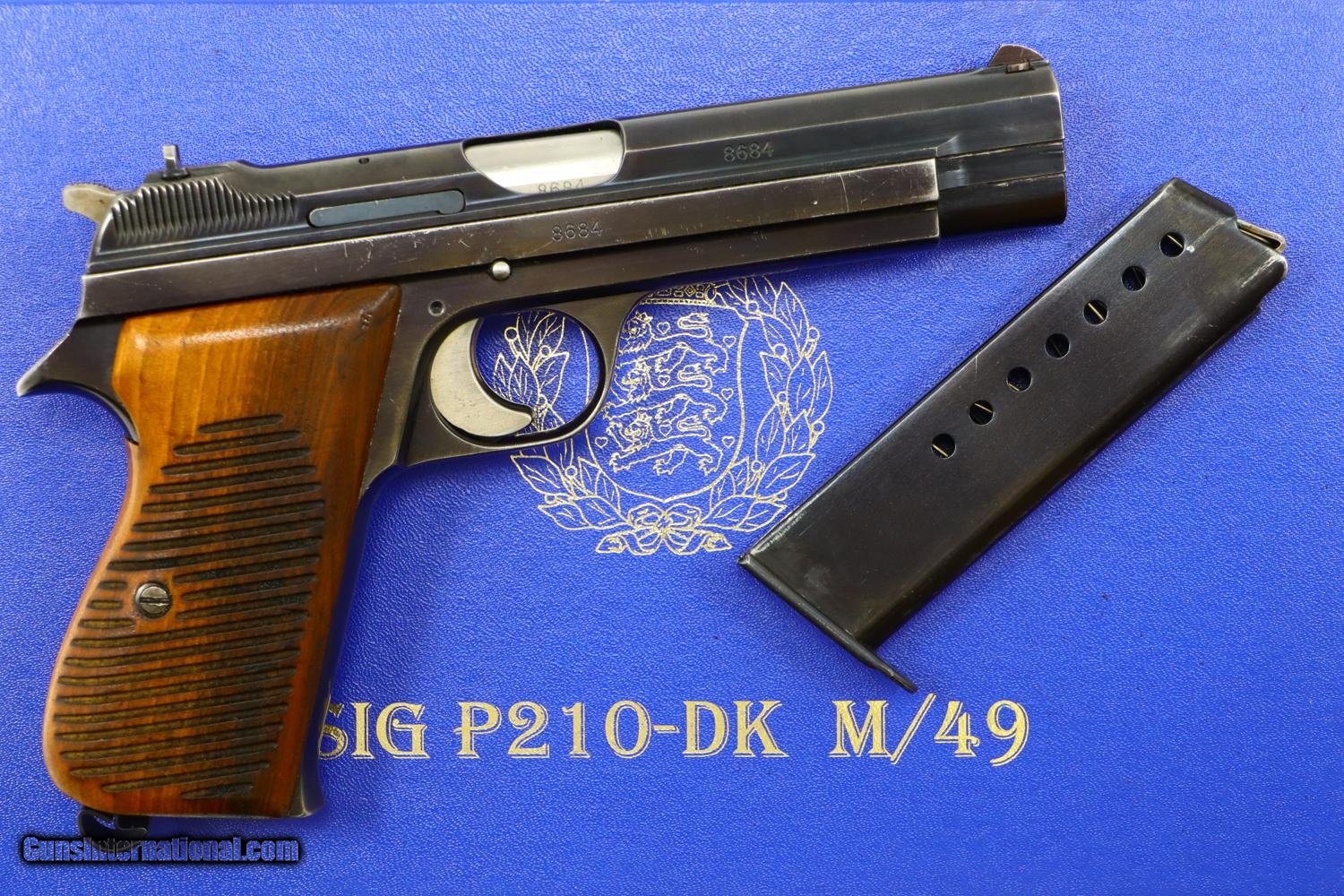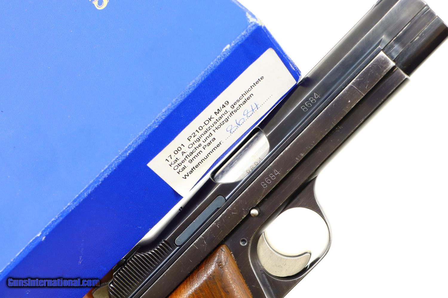 Description: Relatively scarce first variation Danish contract M49, high polish blue with drift adjustable front and rear sights, serial range 1-16607 made between 1948-1951. Left side of slide with SIG logo. Left frame is marked with the cal, model reference, and crown/HTK. The full serial number is on the right side of the barrel, slide, frame, and original hammer group with no half cock. Wood serrated grips secured with a single transverse fire blued screw. Lanyard ring present. Correct high polish magazine. Complete with matching shipping box that references this pistol as “Category A” and a multilingual factory booklet. Synopsis: SIG manufactured M49, first Danish contract, original condition, early production, in matching shipping box with booklet. Condition: VG + with sharp edge and holster wear in usual locations for a pistol that has seen moderate use. Comparable condition grips with scattered handling dings, staining, and discolorations. Near excellent high polish magazine and crisp shipping box. Mirror bore. Perfect manual mechanics. ~~Insured shipping fee of $75; most packages shipped using FedEx 2nd Day.~~ SOLD Manufacturer: SIG Serial Number: 8684 Caliber Info: 9mmP |