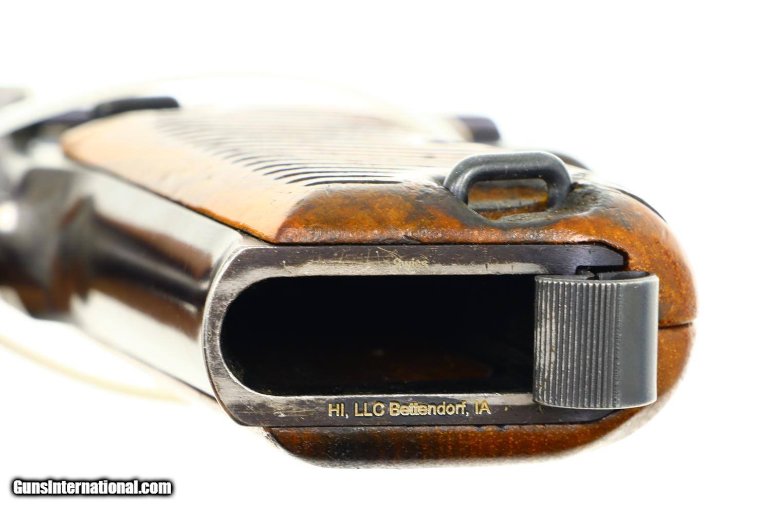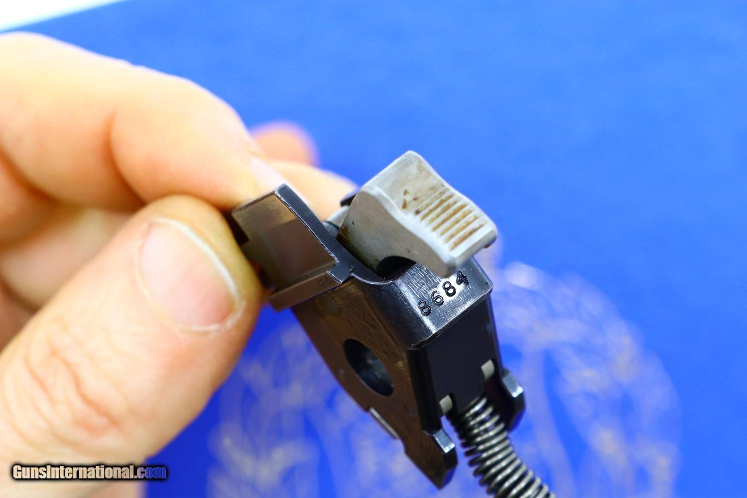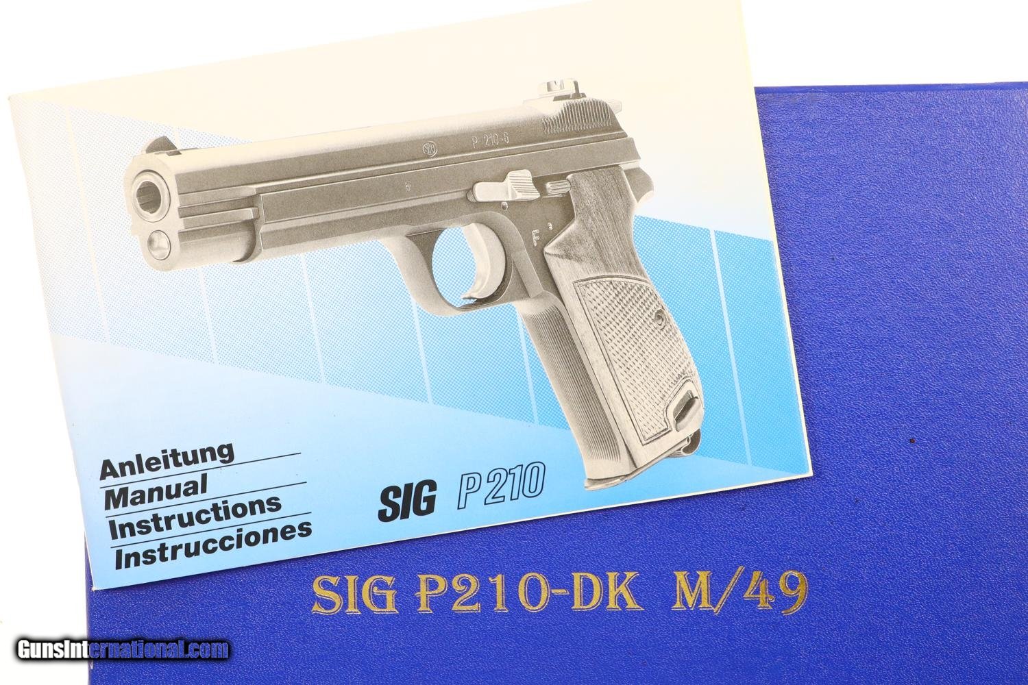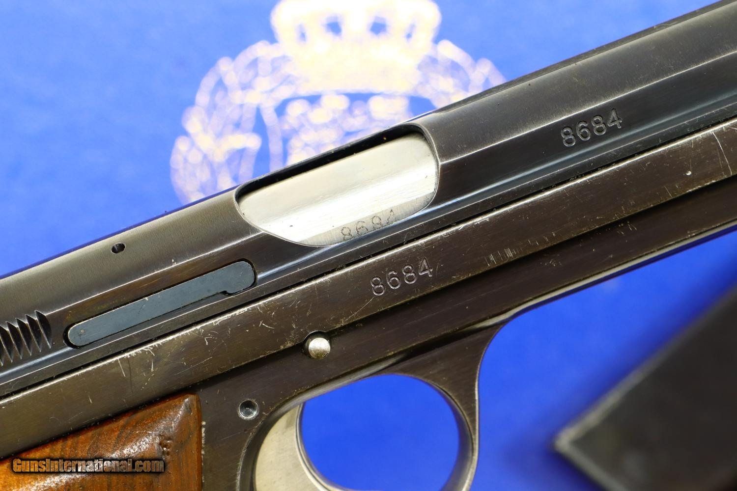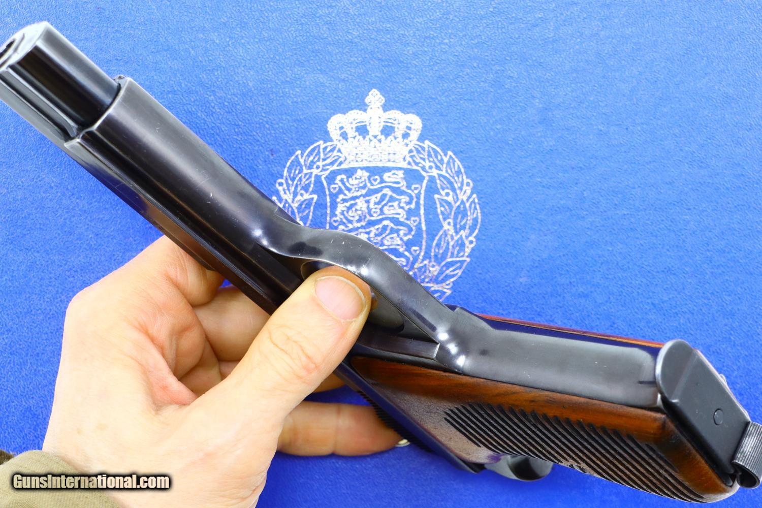 Description: Relatively scarce first variation Danish contract M49, high polish blue with drift adjustable front and rear sights, serial range 1-16607 made between 1948-1951. Left side of slide with SIG logo. Left frame is marked with the cal, model reference, and crown/HTK. The full serial number is on the right side of the barrel, slide, frame, and original hammer group with no half cock. Wood serrated grips secured with a single transverse fire blued screw. Lanyard ring present. Correct high polish magazine. Complete with matching shipping box that references this pistol as “Category A” and a multilingual factory booklet. Synopsis: SIG manufactured M49, first Danish contract, original condition, early production, in matching shipping box with booklet. Condition: VG + with sharp edge and holster wear in usual locations for a pistol that has seen moderate use. Comparable condition grips with scattered handling dings, staining, and discolorations. Near excellent high polish magazine and crisp shipping box. Mirror bore. Perfect manual mechanics. ~~Insured shipping fee of $75; most packages shipped using FedEx 2nd Day.~~ SOLD Manufacturer: SIG Serial Number: 8684 Caliber Info: 9mmP |