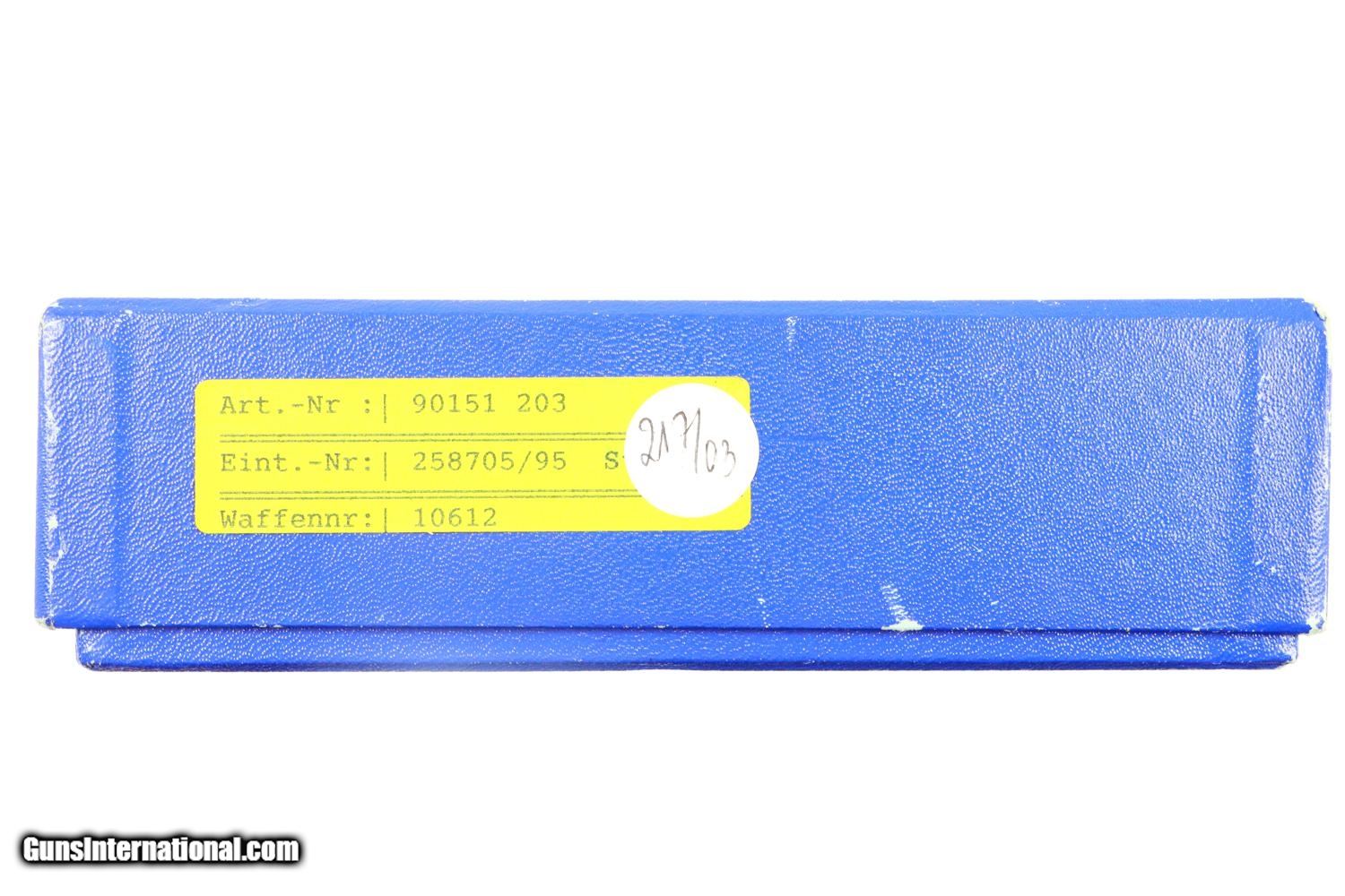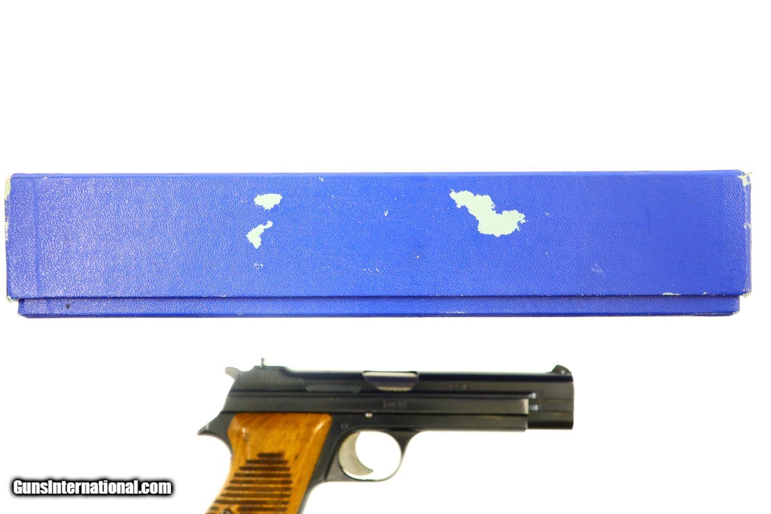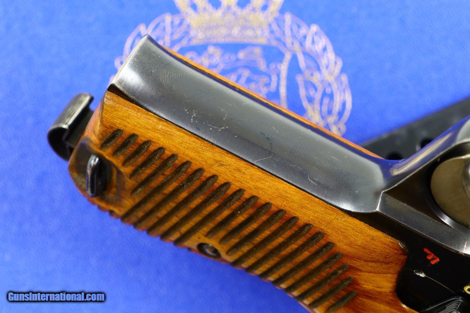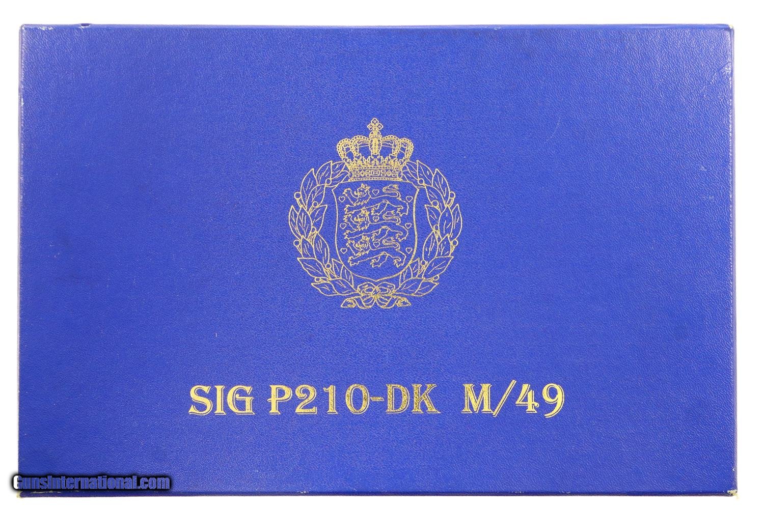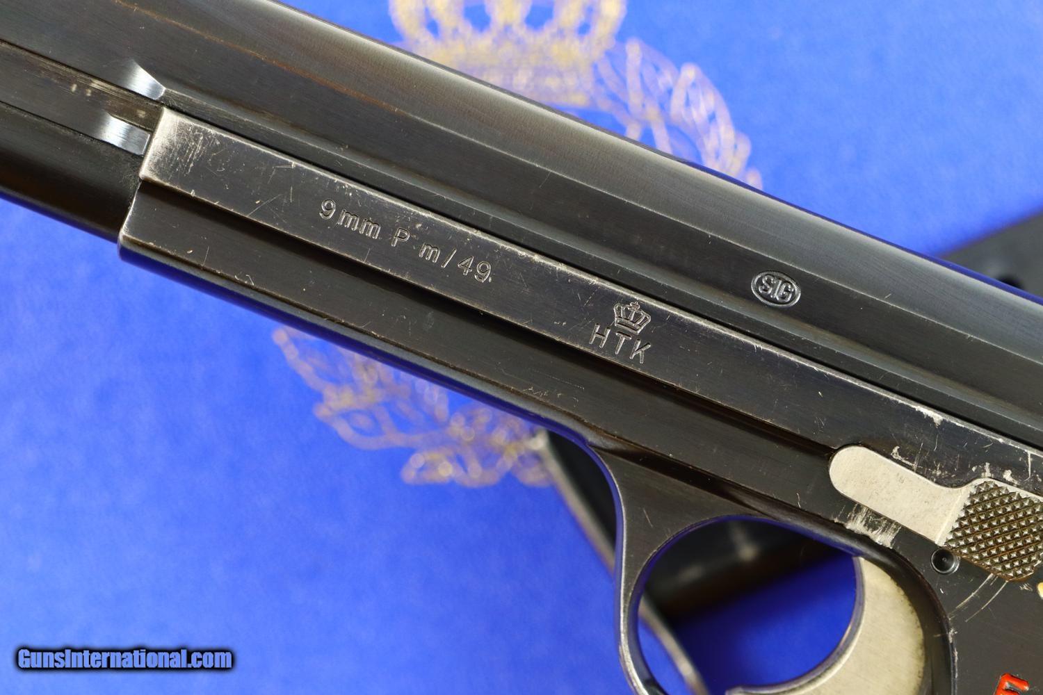 Description: Synopsis: SIG, M49, Danish Military, Boxed. 9mmP, 10612, FB00896 Description: Relatively scarce first variation Danish contract M49, high polish blue with drift adjustable front and rear sights, serial range 1-16607 made between 1948-1951. Left side of slide with SIG logo. Left frame is marked with the cal, model reference, and crown/HTK. The full serial number is on the right side of the barrel, slide, frame, and original hammer group with no half cock. Wood serrated grips secured with a single transverse fire blued screw. Lanyard ring present. Blued magazine with a reworked floorplate. Complete with an original shipping box whose grey foam lined interior, that typically disintegrates, has been removed. Condition: VG+ with sharp edge and holster wear in usual locations for a pistol that has seen light-moderate use. Comparable condition magazine, floorplate reworked and retention button polished. Grips with scattered handling dings, staining, and discolorations. Bright bore sharp rifling. Perfect manual mechanics. Crisp shipping box with a few superficial losses as photographed. ~~Insured shipping fee of $75; most packages shipped using FedEx 2nd Day.~~ SOLD Manufacturer: SIG Serial Number: 10612 Caliber Info: 9mmP |
