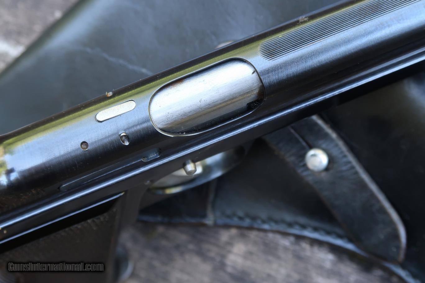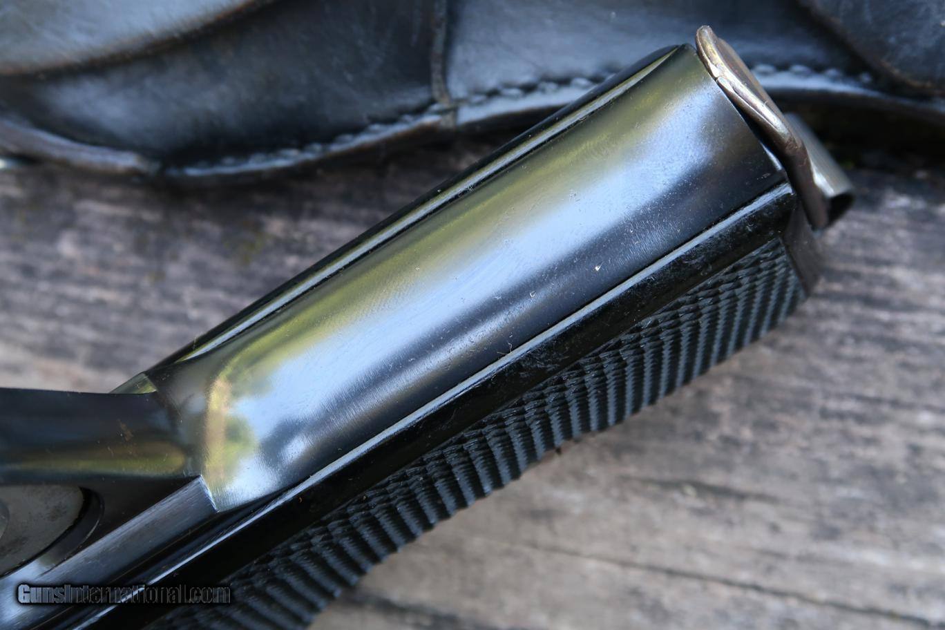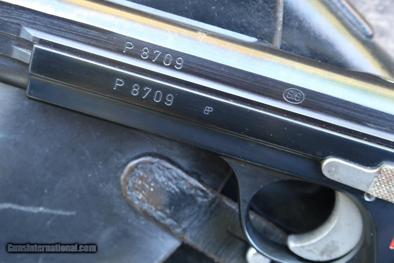 Near excellent bright blue with slide showing holster wear in the usual locations. Frame is likely factory reworked, for while the blue is a perfect match and era correct, the proofing on the frame shallow and without cratering/halo. Excellent original condition magazine and grips. Same excellent condition applies to holster. One of the scarcer P210 series pistols, in a separate 8000 serial range, that were largely used by the Basel or Lausanne police.