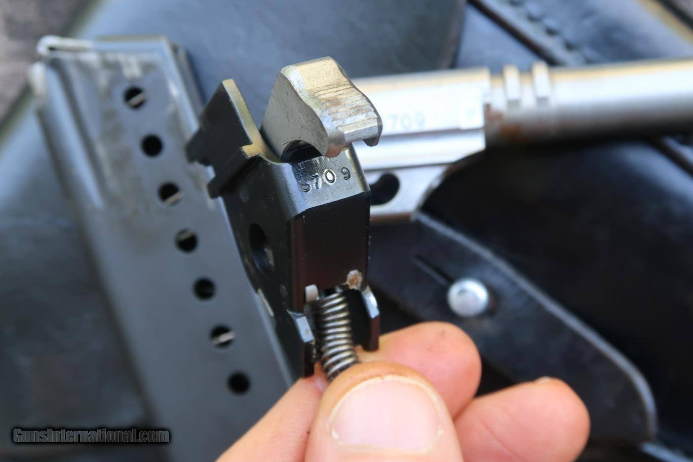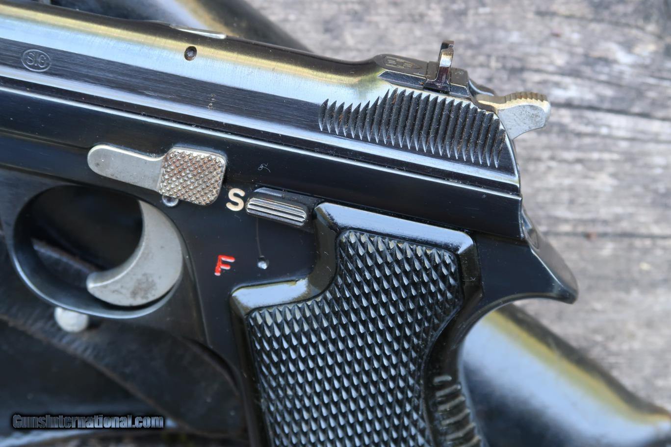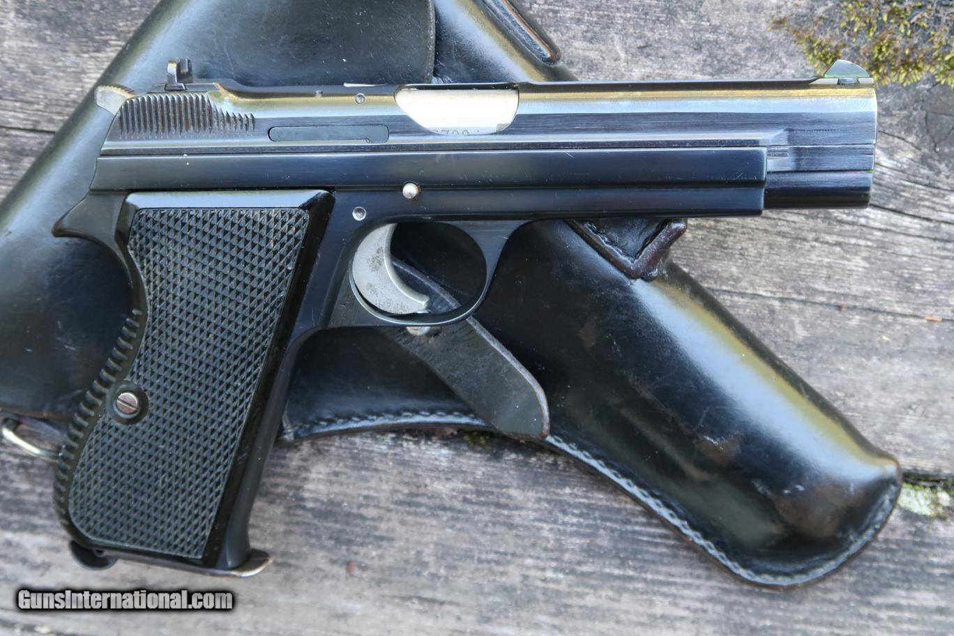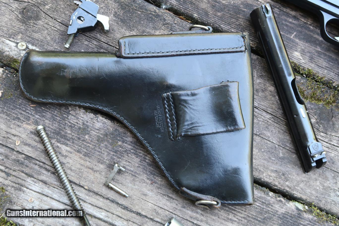 Near excellent bright blue with slide showing holster wear in the usual locations. Frame is likely factory reworked, for while the blue is a perfect match and era correct, the proofing on the frame shallow and without cratering/halo. Excellent original condition magazine and grips. Same excellent condition applies to holster. One of the scarcer P210 series pistols, in a separate 8000 serial range, that were largely used by the Basel or Lausanne police.