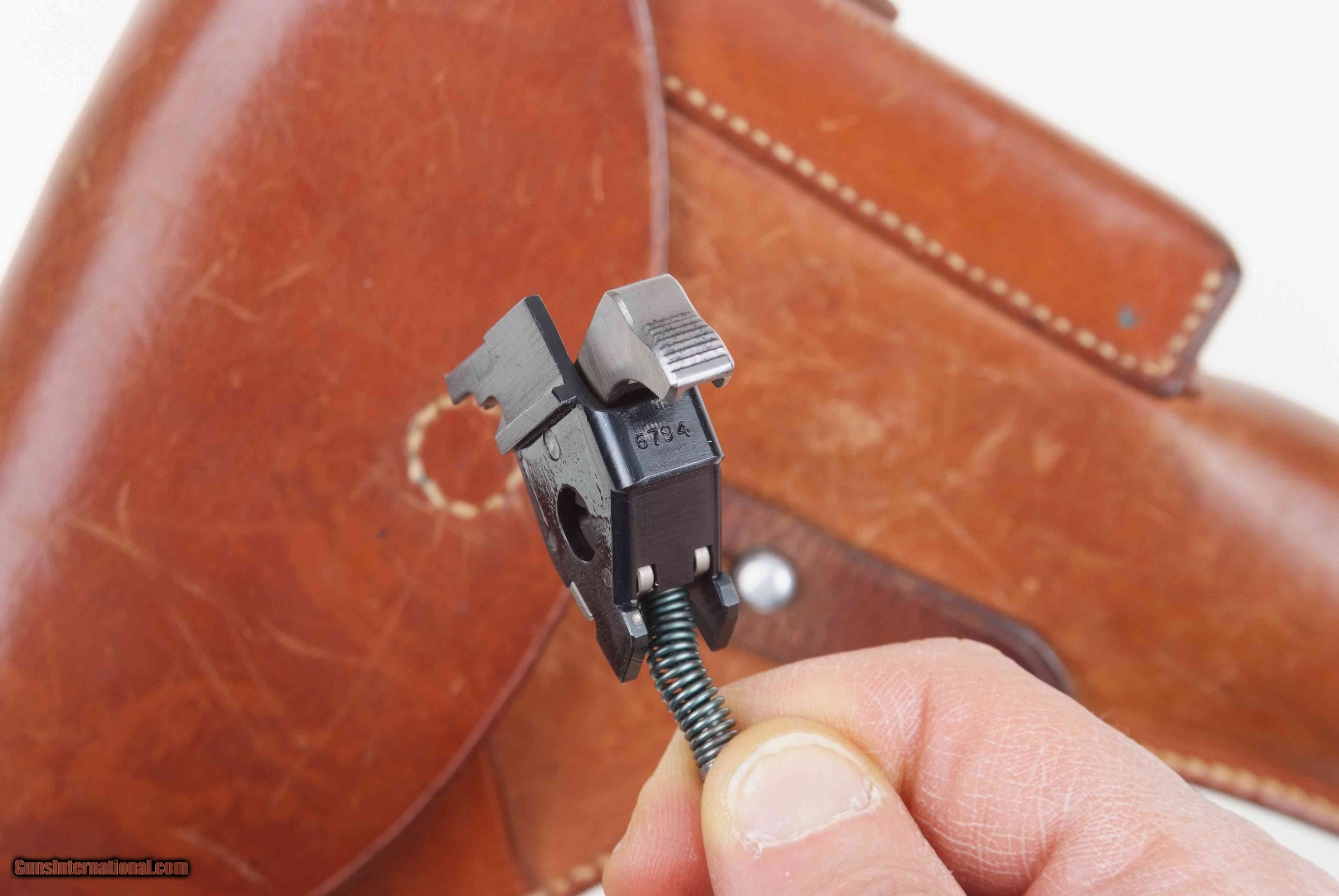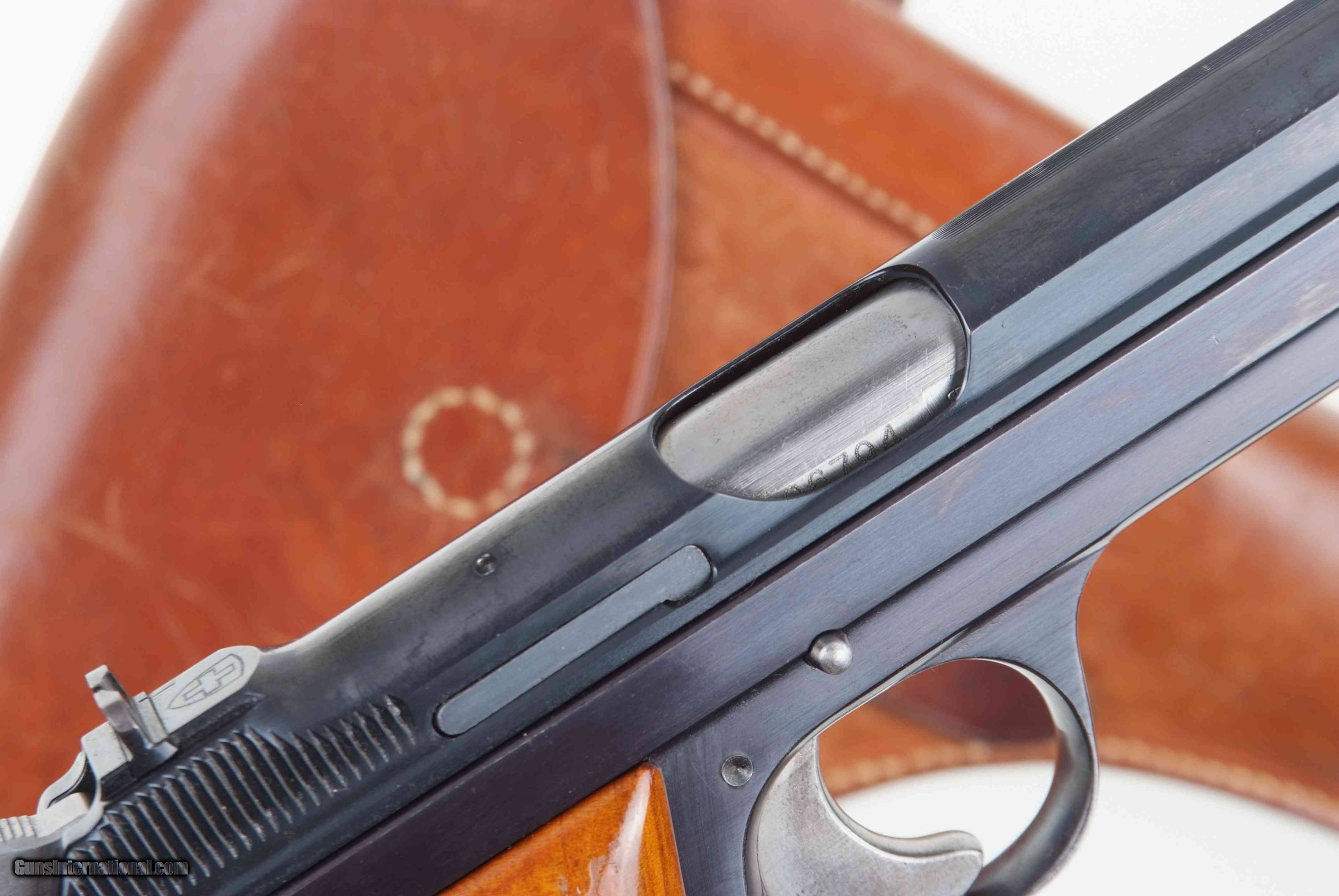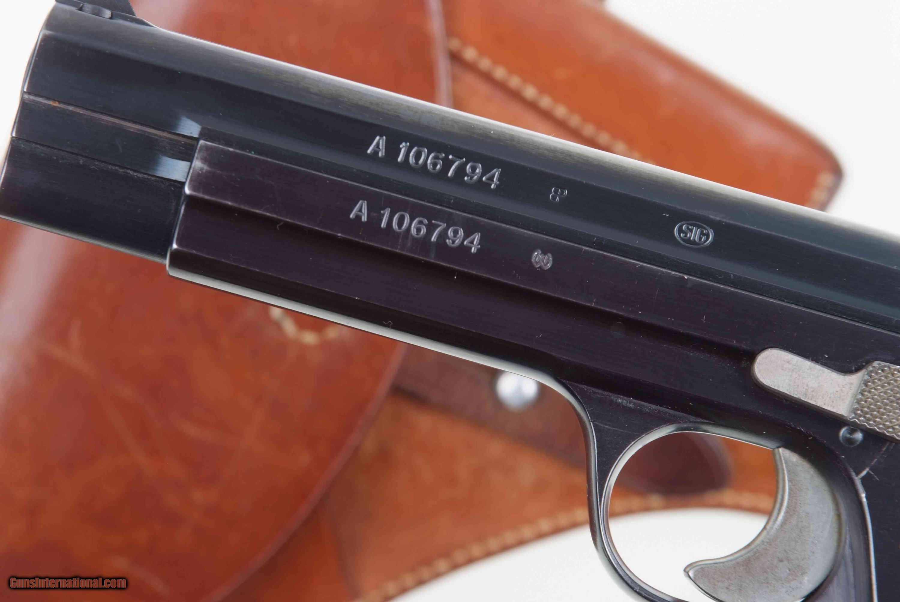 Description: Standard configuration single action pistol with 4.75” barrel and drift adjustable front and rear sight. The left side of the slide and frame are proofed and marked with the full serial number that is repeated on the right side of the barrel hood. Safety detents are marked with an “S” in white and “F” in red. “P” release on the front of trigger guard. Disassembly shows a matching, original hammer group with no half cock. Fitted with serrated walnut grips secured with fire blued screw. Fixed lanyard ring. Complete with an early, high-polished magazine and a correctly dated "52" Swiss military holster. Synopsis: Exceptional, original, and all matching, first contract, second delivery, SIG P49 Swiss military pistol with correct holster. Condition: 98-99% bright, original salt blue with holster wear as expected from a pistol that has seen minimal field use. No suggestion of touch-up. Comparable condition grips, and original finish magazine. Mirror bright bore. Perfect manual mechanics. VG-excellent holster with scattered scuffs and minimal staining as photographed. Very nicely manufacturer marked and dated. A super condition, high polish military P49, with its matching, original hammer group and issue dated holster. ~~Insured shipping fee of $75; most packages shipped using FedEx 2nd Day.~~ SOLD Manufacturer: SIG Serial Number: A106794 Caliber Info: 9mmP |