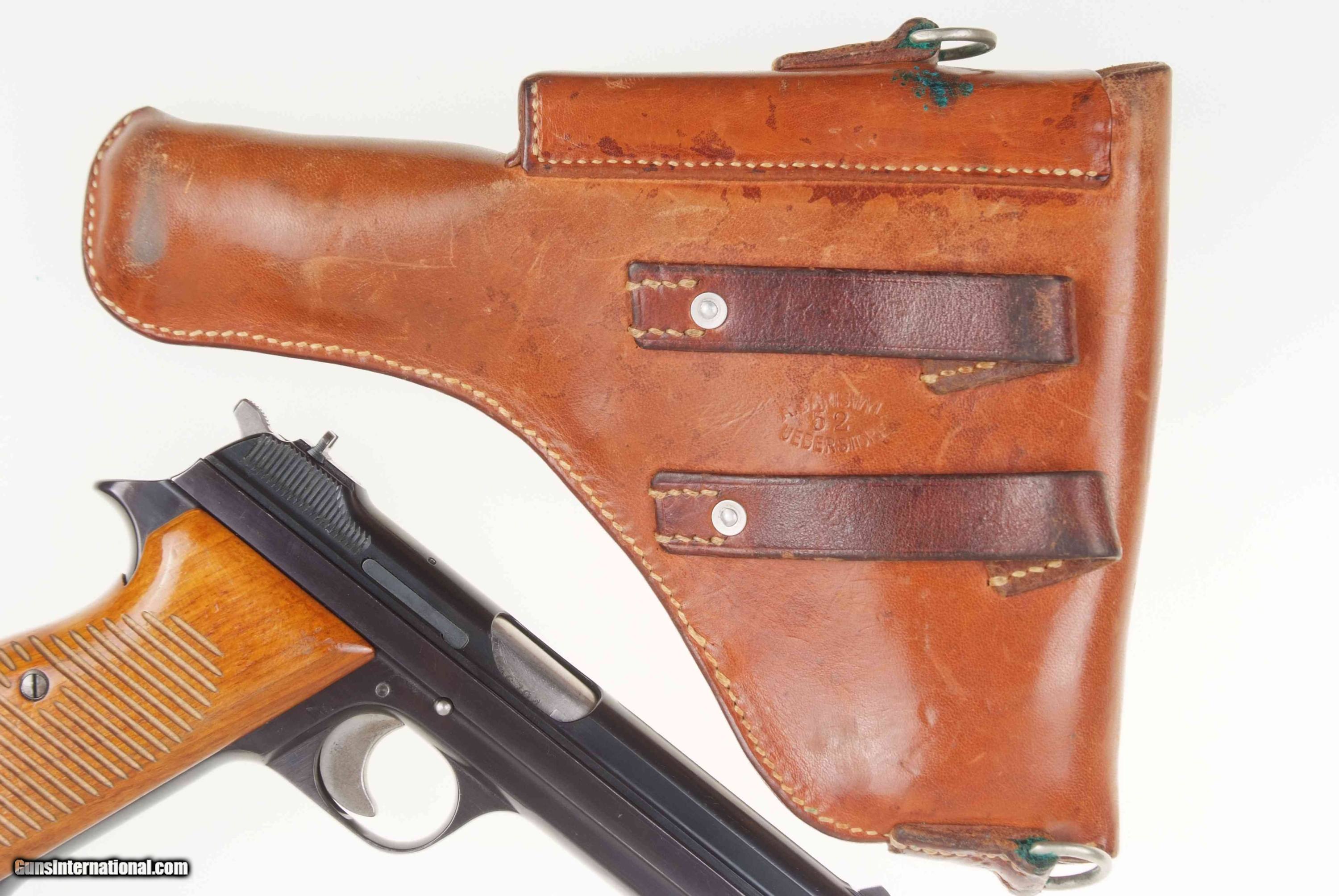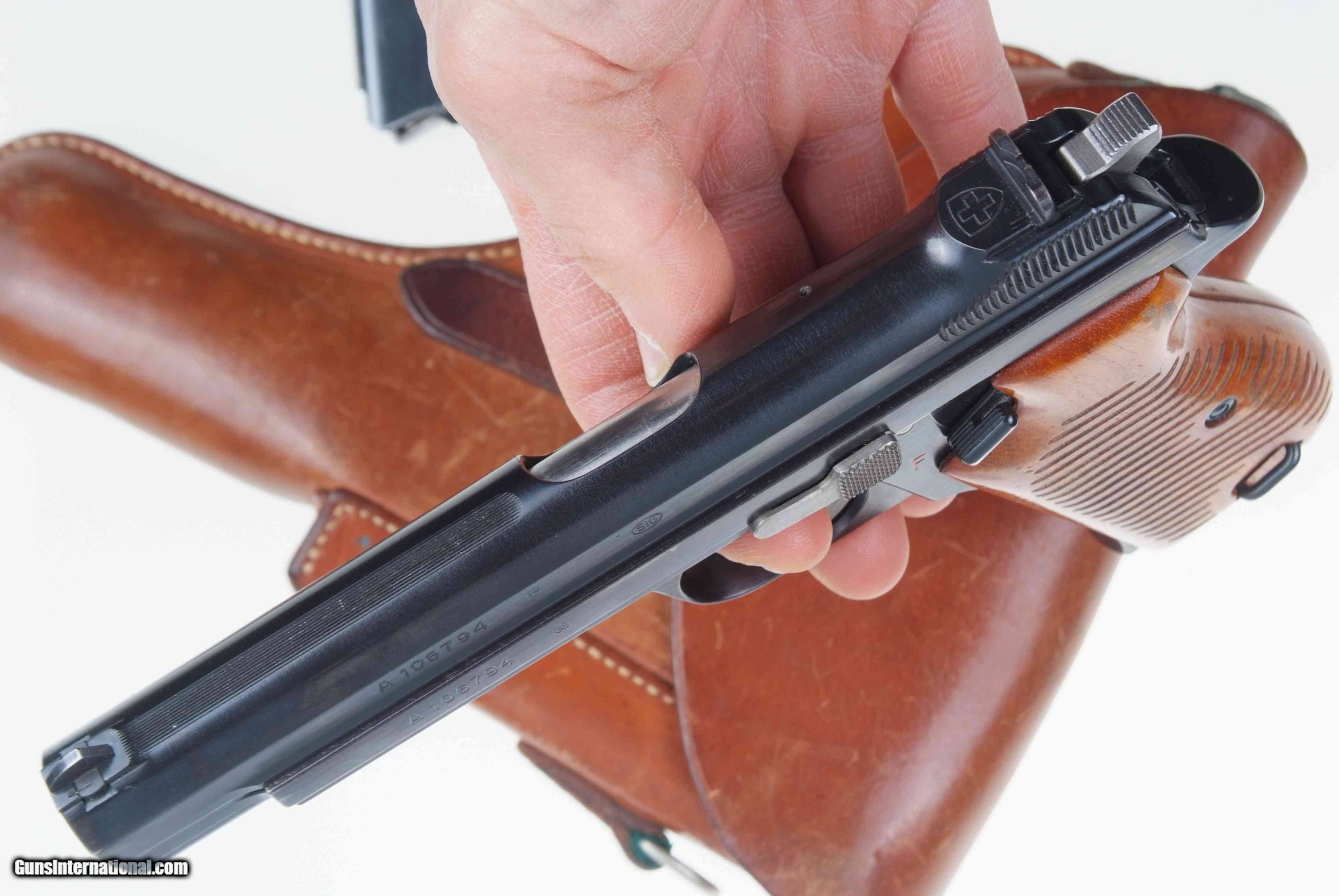 Standard configuration single action pistol with 4.75” barrel and drift adjustable front and rear sight. The left side of the slide and frame are proofed and marked with the full serial number that is repeated on the right side of the barrel hood. Safety detents are marked with an “S” in white and “F” in red. “P” release on the front of trigger guard. Disassembly shows a matching, original hammer group with no half cock. Fitted with serrated walnut grips secured with fire blued screw. Fixed lanyard ring. Complete with an early, high-polished magazine and a correctly dated "52" Swiss military holster.