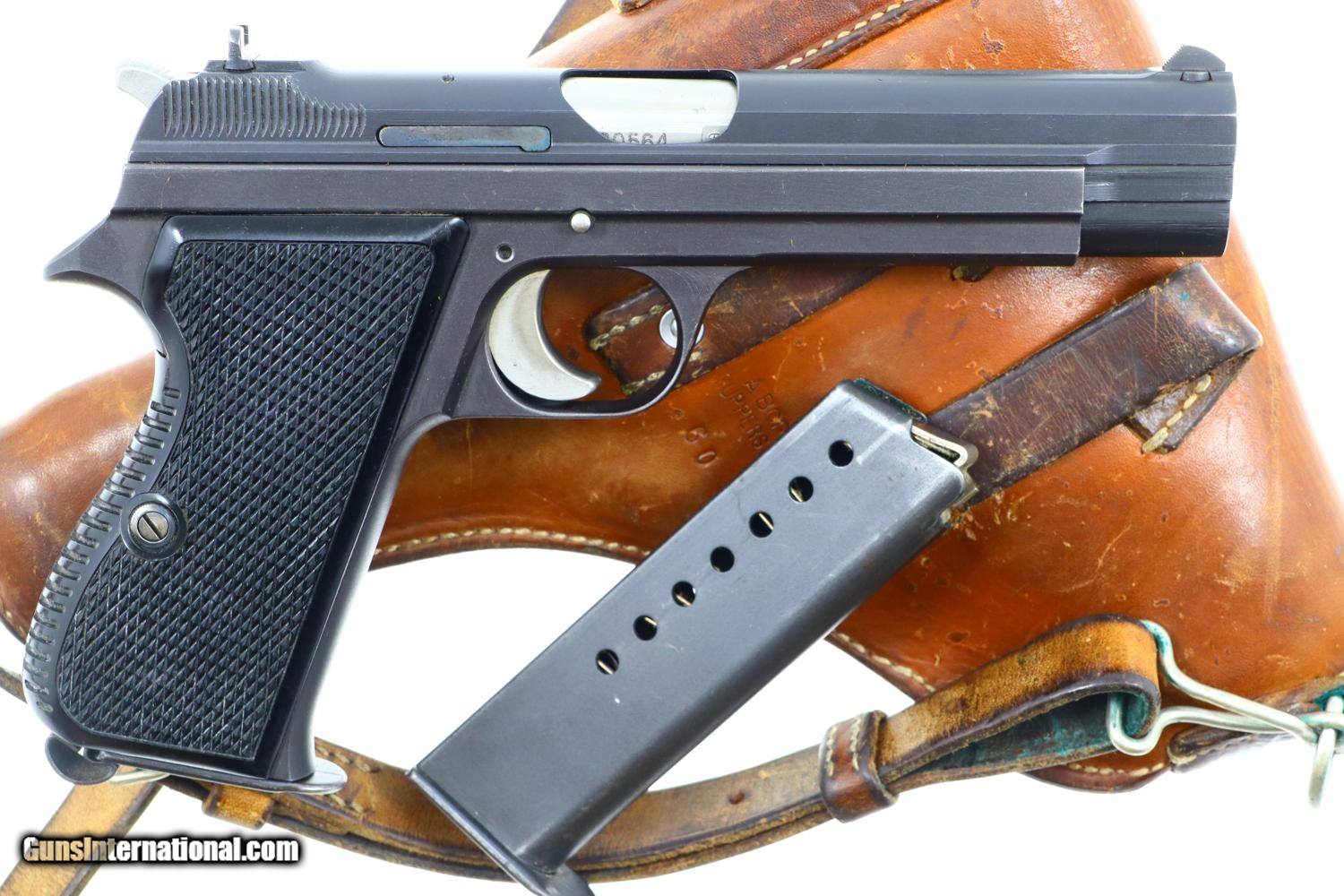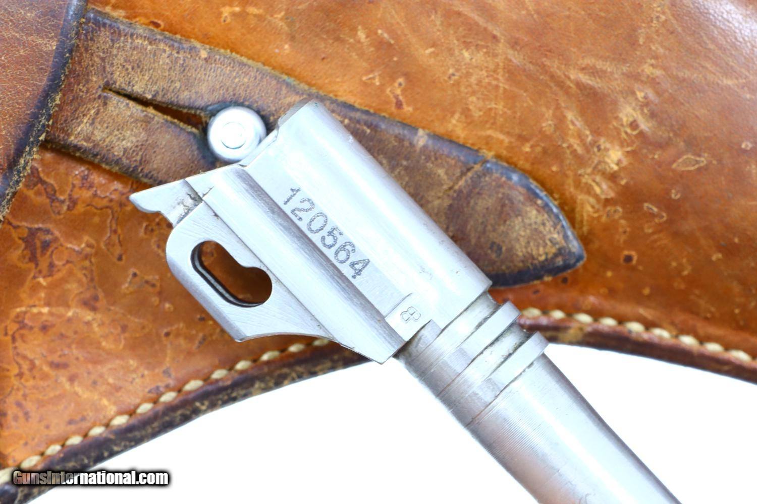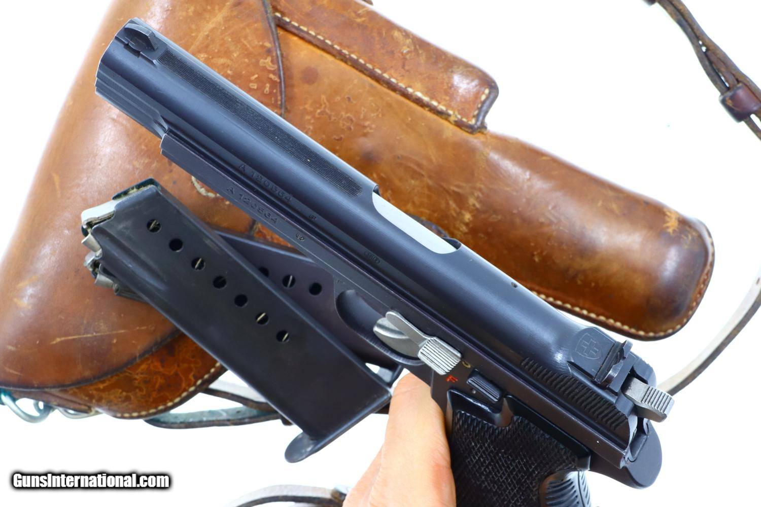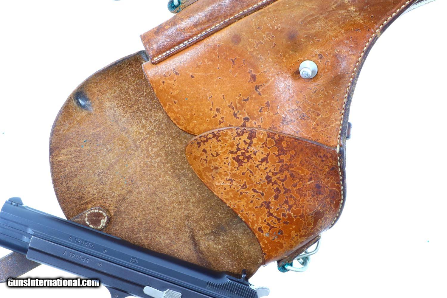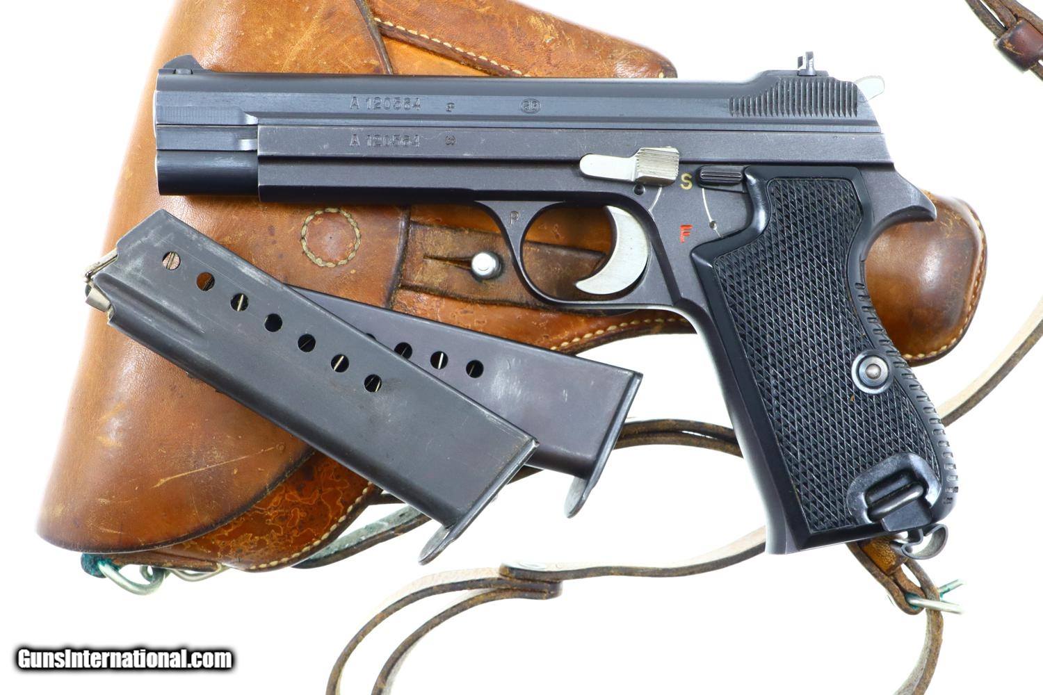 Description: Standard configuration SIG P49 late military pistol, single action, in 9mmP, with 4.75" barrel and drift adjustable front and rear sight. The left side of the slide and frame are proofed and marked with the full serial number that is repeated on the right side of the barrel hood. Safety detentes are marked with an "S" in white and "F" in red. "P" release marked on left side of trigger guard and discreetly applied import marking on base of frame where covered by the magazine floorplate. Disassembly shows a matching hammer group with the usual half cock. Fitted with checkered black plastic grips, integral escutcheons, secured with a single transverse screw. Fixed lanyard ring. Complete with two correct matte finish magazines. Original holster manufacturer marked and dated "60” on obverse surface, date of shoulder strap not discernable. Synopsis: Attractive, original, Swiss military SIG P49, all matching, matte finish rig with correct holster and strap. Condition: VG+ original finish with sharp edge wear and staining of the trigger as photographed. Comparable condition grips and correct matte finish magazines. Bright bore with sharp rifling. Perfect manual mechanics. Holster and strap VG, stitching showing no repair. A very attractive and complete rig that should satisfy the most discerning shooter/collector. ~~Insured shipping fee of $65; most packages shipped using FedEx 2nd Day.~~ SOLD Manufacturer: SIG Serial Number: A120564 Caliber Info: 9mmP |