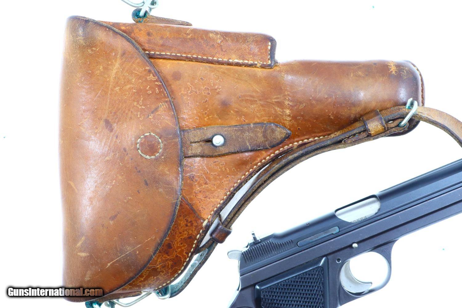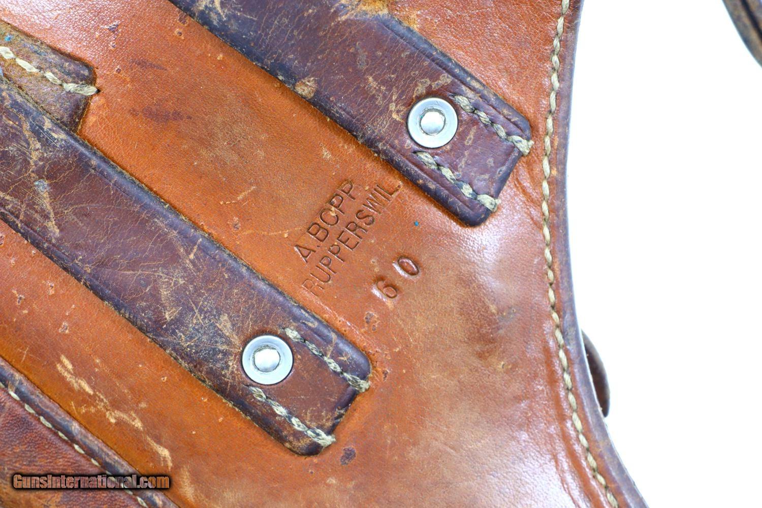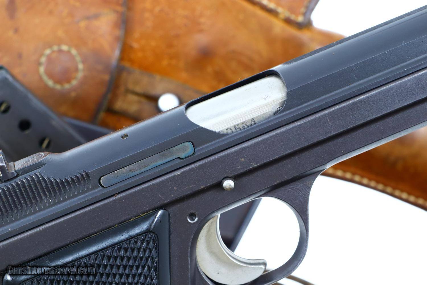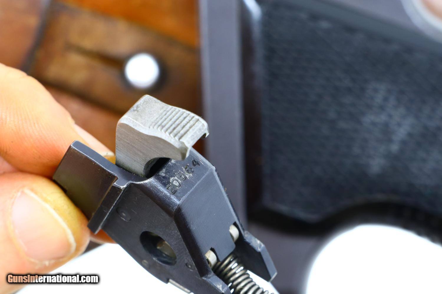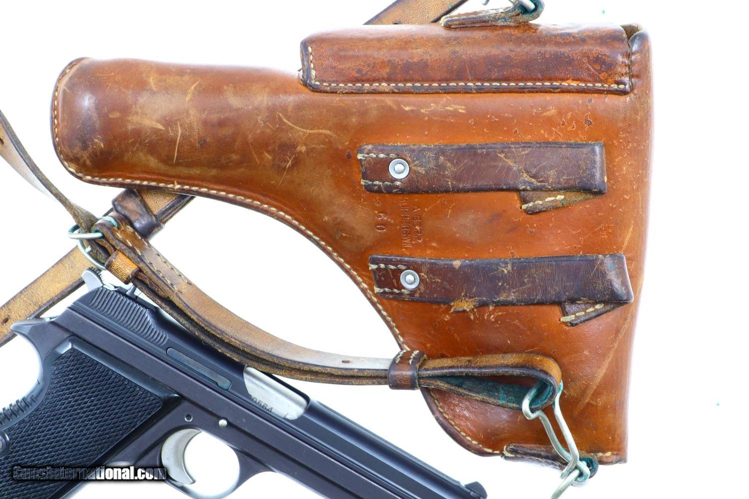 Description: Standard configuration SIG P49 late military pistol, single action, in 9mmP, with 4.75" barrel and drift adjustable front and rear sight. The left side of the slide and frame are proofed and marked with the full serial number that is repeated on the right side of the barrel hood. Safety detentes are marked with an "S" in white and "F" in red. "P" release marked on left side of trigger guard and discreetly applied import marking on base of frame where covered by the magazine floorplate. Disassembly shows a matching hammer group with the usual half cock. Fitted with checkered black plastic grips, integral escutcheons, secured with a single transverse screw. Fixed lanyard ring. Complete with two correct matte finish magazines. Original holster manufacturer marked and dated "60” on obverse surface, date of shoulder strap not discernable. Synopsis: Attractive, original, Swiss military SIG P49, all matching, matte finish rig with correct holster and strap. Condition: VG+ original finish with sharp edge wear and staining of the trigger as photographed. Comparable condition grips and correct matte finish magazines. Bright bore with sharp rifling. Perfect manual mechanics. Holster and strap VG, stitching showing no repair. A very attractive and complete rig that should satisfy the most discerning shooter/collector. ~~Insured shipping fee of $65; most packages shipped using FedEx 2nd Day.~~ SOLD Manufacturer: SIG Serial Number: A120564 Caliber Info: 9mmP |