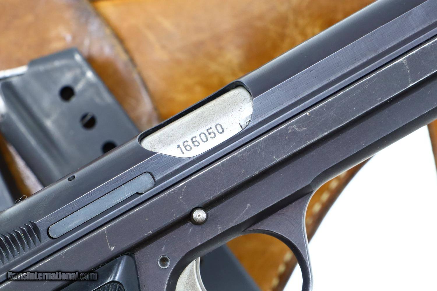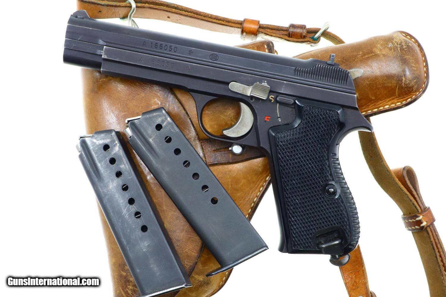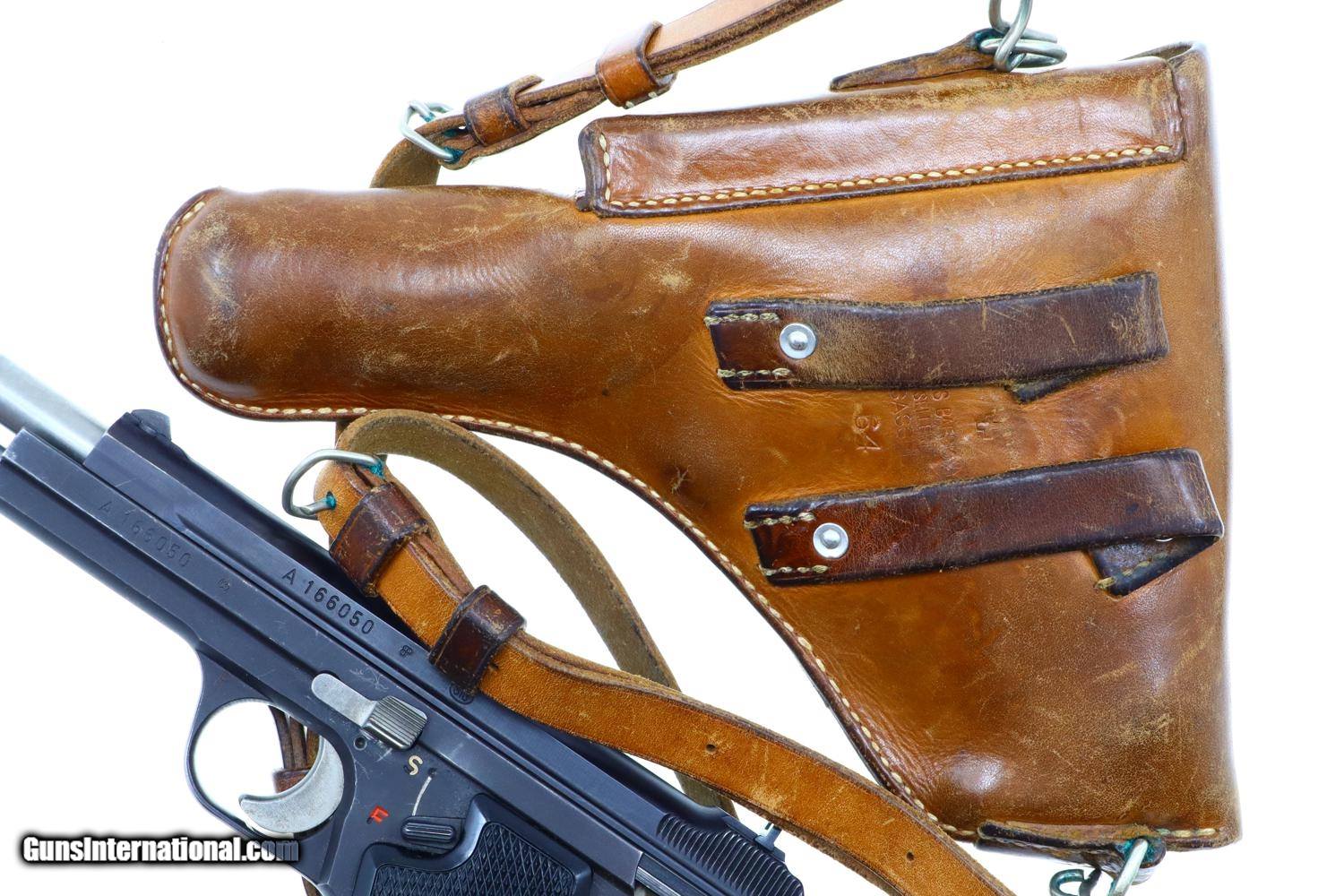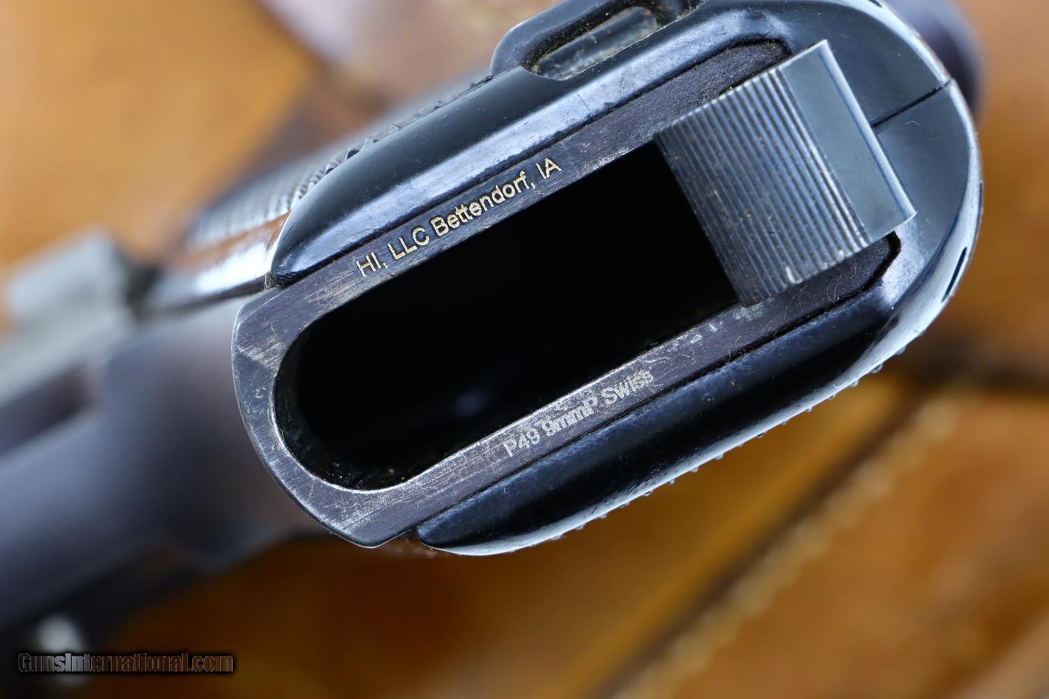 Description: Standard configuration SIG P49 late military pistol, single action, in 9mmP, with 4.75" barrel and drift adjustable front and rear sight. The left side of the slide and frame are proofed and marked with the full serial number that is repeated on the right side of the barrel hood. Safety detentes are marked with an "S" in white and "F" in red. "P" release marked on left side of trigger guard and discreetly applied import marking on base of frame where covered by the magazine floorplate. Disassembly shows a matching hammer group with the usual half cock. Fitted with checkered black plastic grips, integral escutcheons, secured with a single transverse screw. Fixed lanyard ring. Complete with two correct matte finish magazines. Original holster manufacturer marked and dated "64” on obverse surface, with military strap dated “68”. Synopsis: Attractive, original, Swiss military SIG P49, all matching, matte finish rig. Condition: VG+ original finish with sharp edge wear and staining of the trigger as photographed. Comparable condition grips and correct matte finish magazines. Bright bore with sharp rifling. Perfect manual mechanics. Holster and strap VG, stitching showing no repair. A very attractive and complete rig that should satisfy the most discerning shooter/collector. ~~Insured shipping fee of $65; most packages shipped using FedEx 2nd Day.~~ SOLD Manufacturer: SIG Serial Number: A166050 Caliber Info: 9mmP |