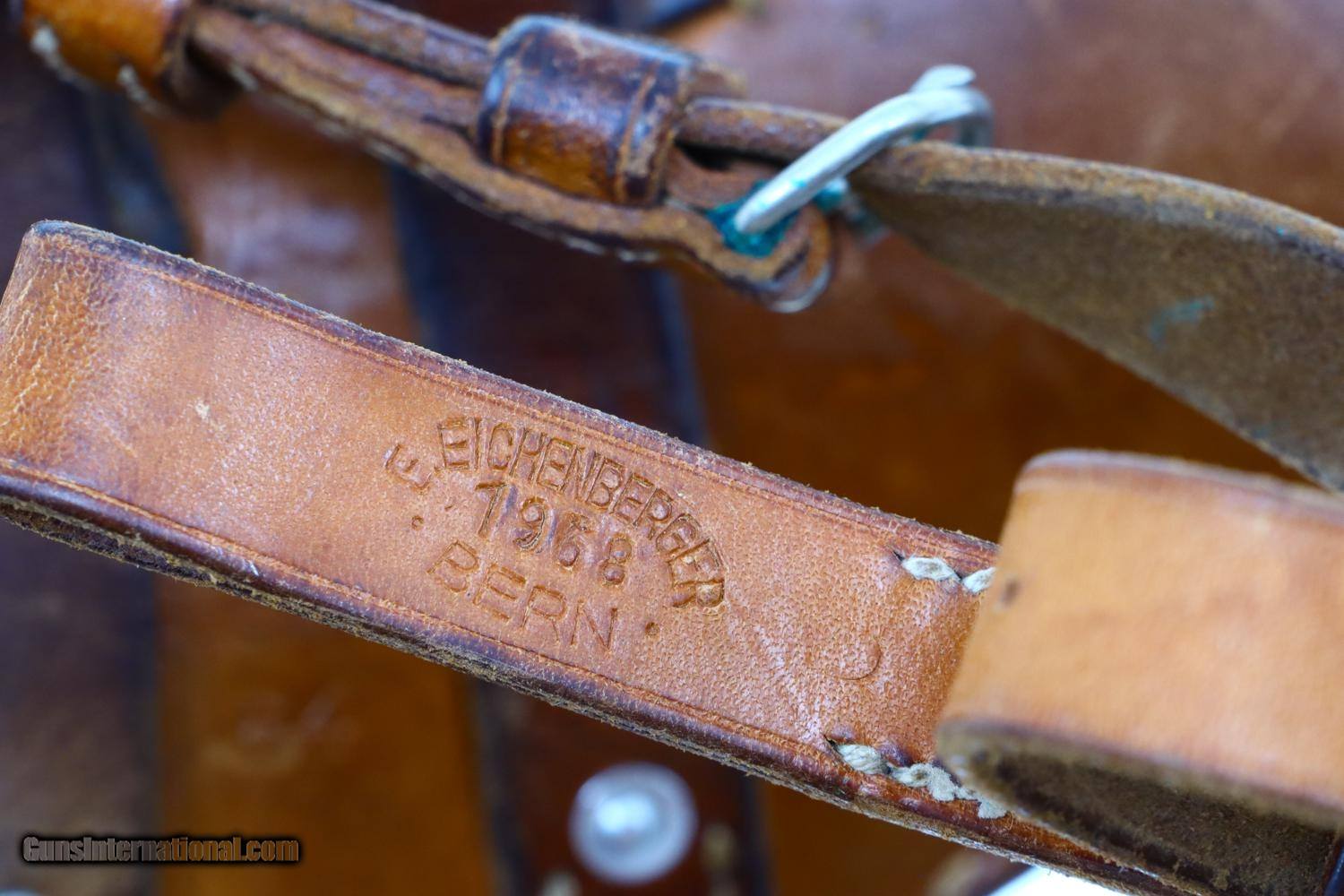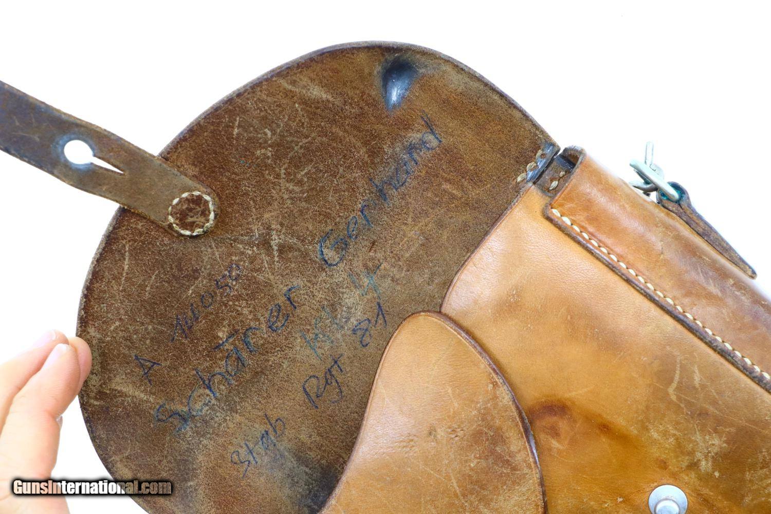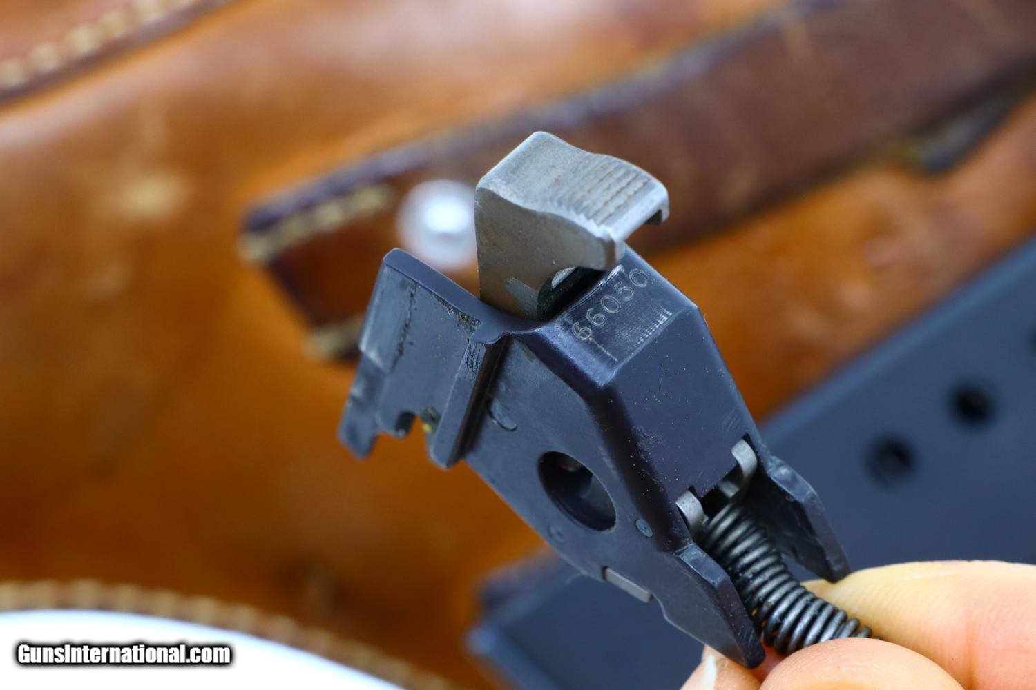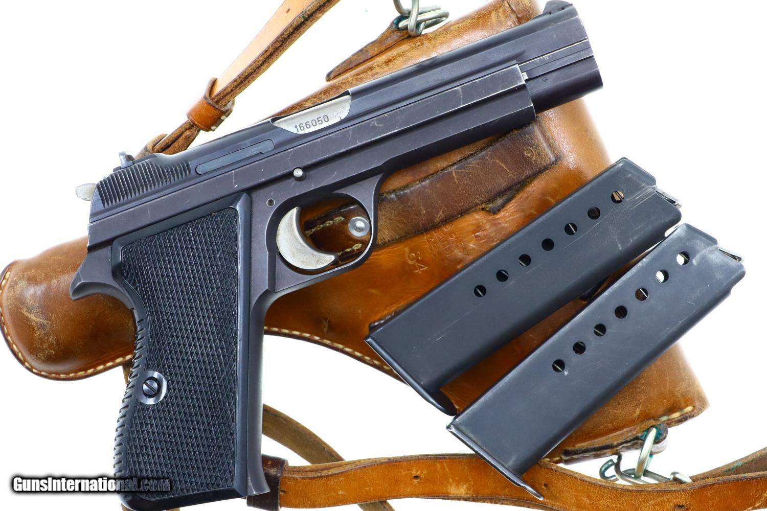 Description: Standard configuration SIG P49 late military pistol, single action, in 9mmP, with 4.75" barrel and drift adjustable front and rear sight. The left side of the slide and frame are proofed and marked with the full serial number that is repeated on the right side of the barrel hood. Safety detentes are marked with an "S" in white and "F" in red. "P" release marked on left side of trigger guard and discreetly applied import marking on base of frame where covered by the magazine floorplate. Disassembly shows a matching hammer group with the usual half cock. Fitted with checkered black plastic grips, integral escutcheons, secured with a single transverse screw. Fixed lanyard ring. Complete with two correct matte finish magazines. Original holster manufacturer marked and dated "64” on obverse surface, with military strap dated “68”. Synopsis: Attractive, original, Swiss military SIG P49, all matching, matte finish rig. Condition: VG+ original finish with sharp edge wear and staining of the trigger as photographed. Comparable condition grips and correct matte finish magazines. Bright bore with sharp rifling. Perfect manual mechanics. Holster and strap VG, stitching showing no repair. A very attractive and complete rig that should satisfy the most discerning shooter/collector. ~~Insured shipping fee of $65; most packages shipped using FedEx 2nd Day.~~ SOLD Manufacturer: SIG Serial Number: A166050 Caliber Info: 9mmP |