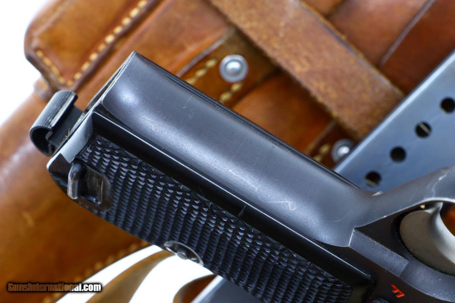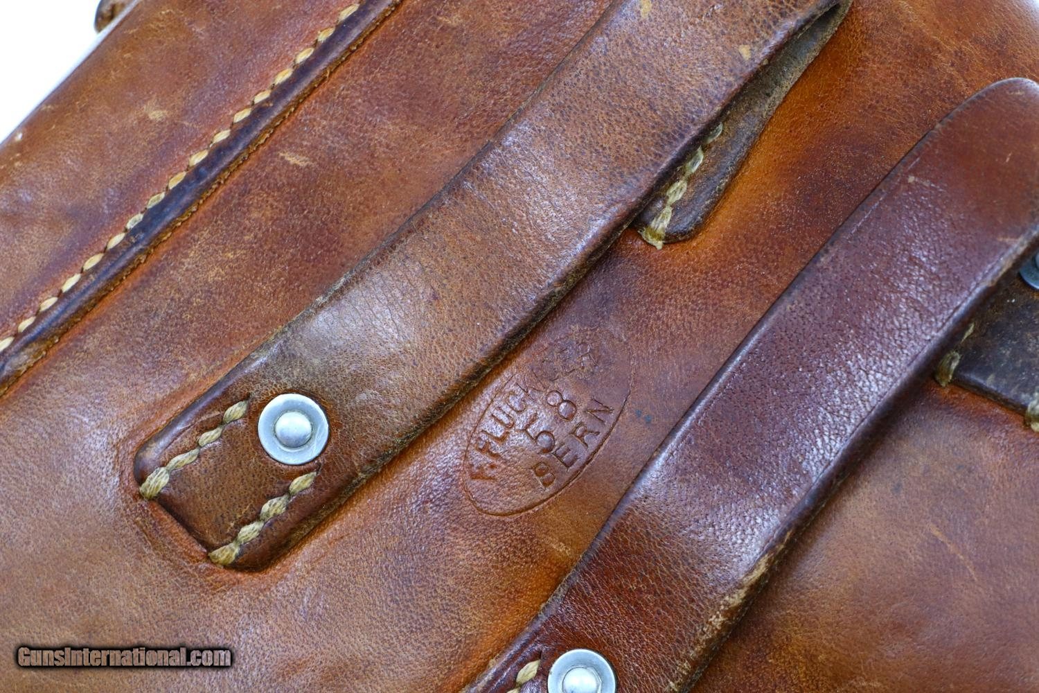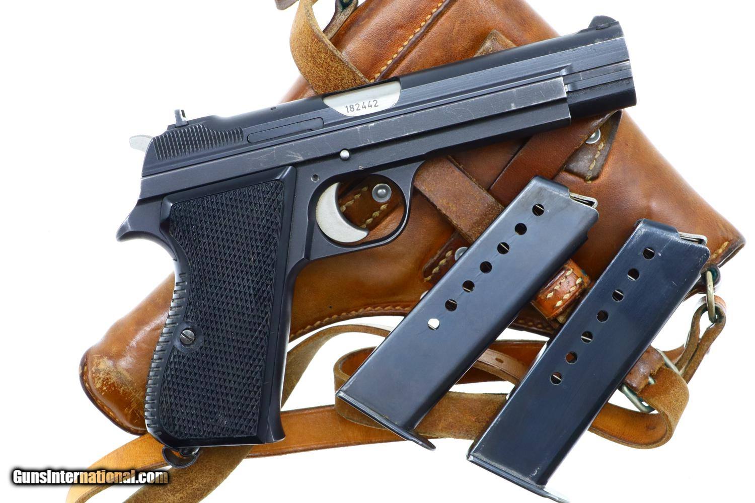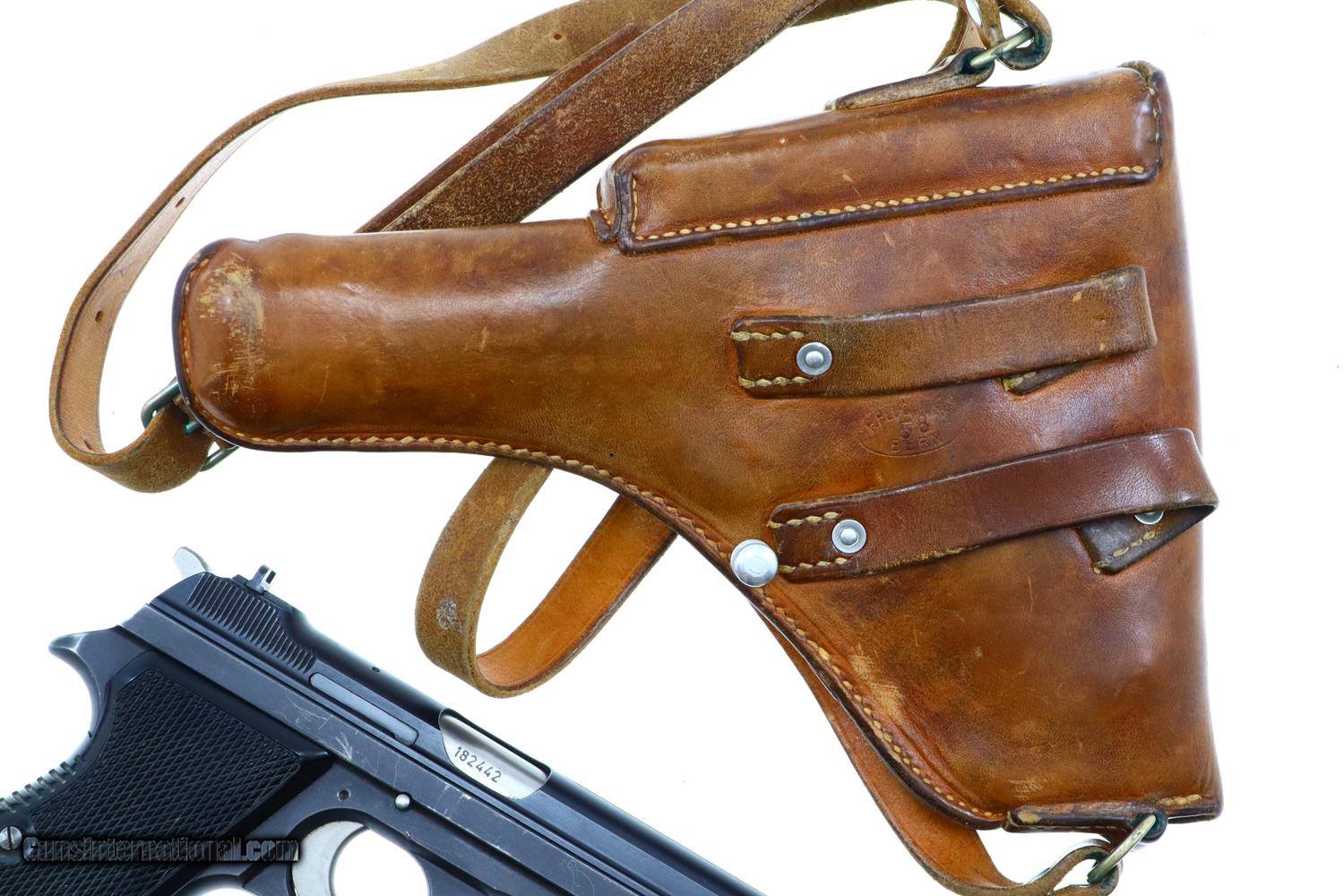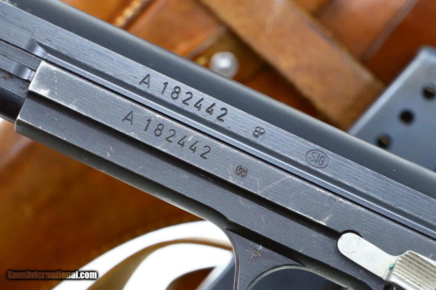 Description: Standard configuration SIG P49 late military pistol, single action, in 9mmP, with 4.75" barrel and drift adjustable front and rear sight. The left side of the slide and frame are proofed and marked with the full serial number that is repeated on the right side of the barrel hood. Safety detentes are marked with an "S" in white and "F" in red. "P" release marked on left side of trigger guard and discreetly applied import marking on base of frame where covered by the magazine floorplate. Disassembly shows a matching hammer group with the usual half cock. Fitted with checkered black plastic grips, integral escutcheons, secured with a single transverse screw. Fixed lanyard ring. Complete with two magazines; one correct matte finish, the other an earlier reblued high polish magazine. Original holster with battle ready stud, manufacturer marked and dated "58” on obverse surface, with military strap dated “76”. Synopsis: Swiss military SIG P49, all matching, later production, matte finish rig. Condition: VG+ original finish with sharp edge wear and scuffs as photographed. Comparable condition grips and matte finish magazine. Spare reblued magazine in similar condition. Bright bore with sharp rifling. Perfect manual mechanics. Holster and strap VG+ stitching showing no repair. A very attractive and representative rig with an all matching pistol. ~~Insured shipping fee of $65; most packages shipped using FedEx 2nd Day.~~ SOLD Manufacturer: SIG Serial Number: A182442 Caliber Info: 9mmP |