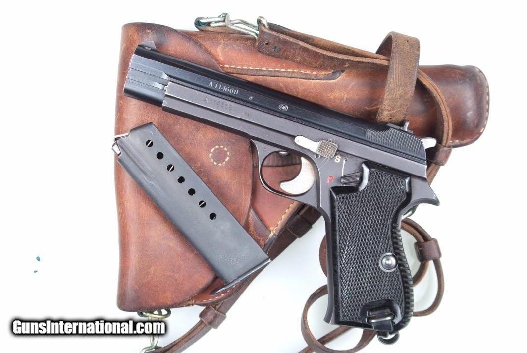 Standard configuration single action pistol with 4.75” barrel and drift adjustable front and rear sight. The left side of the slide and frame are proofed and marked with the full serial number that is repeated on the right side of the barrel hood. Safety detentes are marked with an “S” in white and “F” in red. “P” release marked on the left side of the trigger guard and discretely applied import marking on base of frame. Disassembly shows a matching hammer assembly with the usual half cock. Fitted with checkered black plastic grips, separate escutcheons, secured with a single transfer screw. Fixed lanyard ring. Complete with a matte finish magazine. Leather military holster, dated “55” with an earlier dated “52” strap.