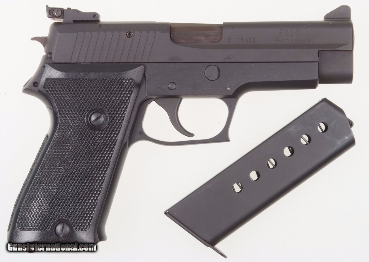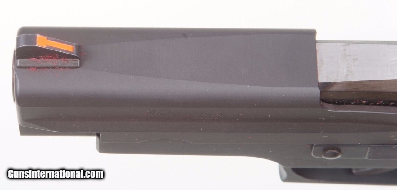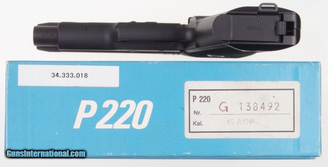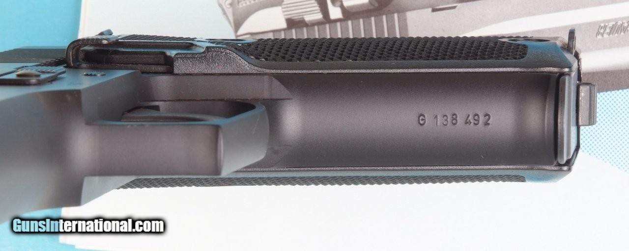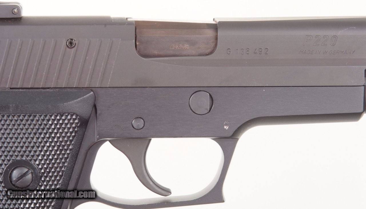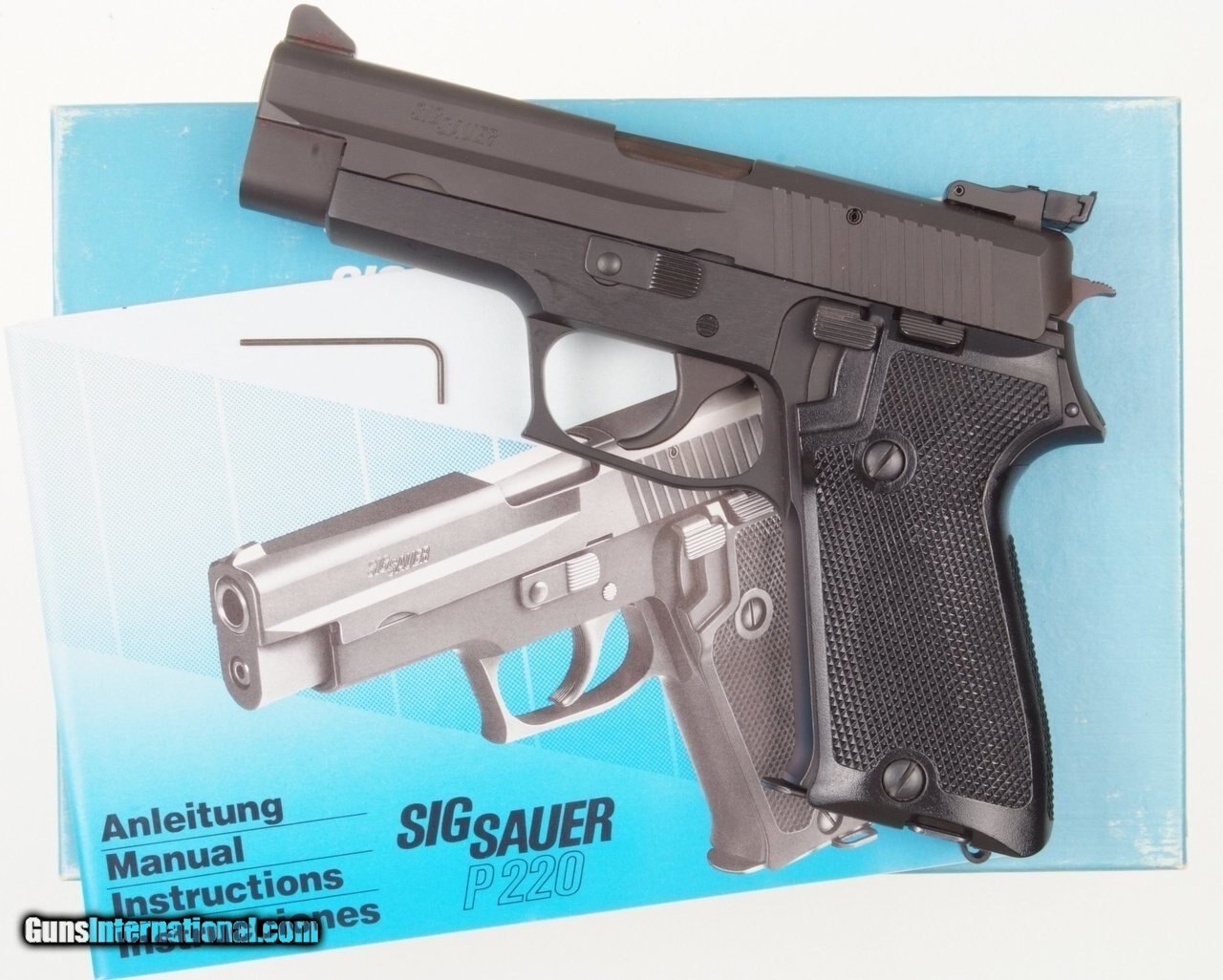 Description: SIG SAUER P220 Sport in .45 ACP, early configuration with European heel-mounted magazine release, NIB with test target and booklet. SN: G138492. Cal: .45ACP. Standard configuration SIG P220 made for sport/informal competition shooting, now with red insert front sight and microadjustable white highlighted rear sight. Slide with standard marking.45 Auto marked on right side of chamber. Full serial number on right side of slide and repeated on the front strap. Two piece checkered black plastic grips with three panels of checkering. Heel mounted magazine release. Magazine with six indicator holes and floorplate marked “.45 Auto.” Complete in crisp original factory box with instruction booklet, test target, and Allen head wrench for rear sight adjustment. Model, serial number and caliber marked on end label. Condition: Virtually new with only the most minute marks consistent with disassembly. There is no leading edge wear, the front strap, screws and even the magazine are virtually new. Comparable condition instruction booklet that has no staining or dog ears. A great, early, SIG SAUER P220 Sport with heel magazine release, nearly as shipped from the factory! A HISTORIC INVESTMENT! Buyer responsible for a flat shipping fee of $55 (Fed Ex 2nd day). SOLD Curio/Relic: Yes |
