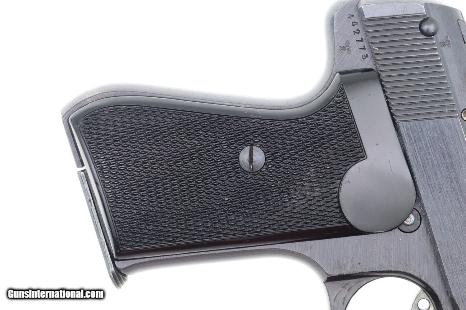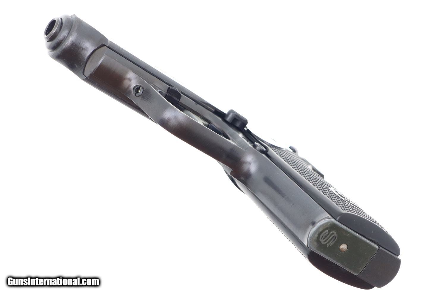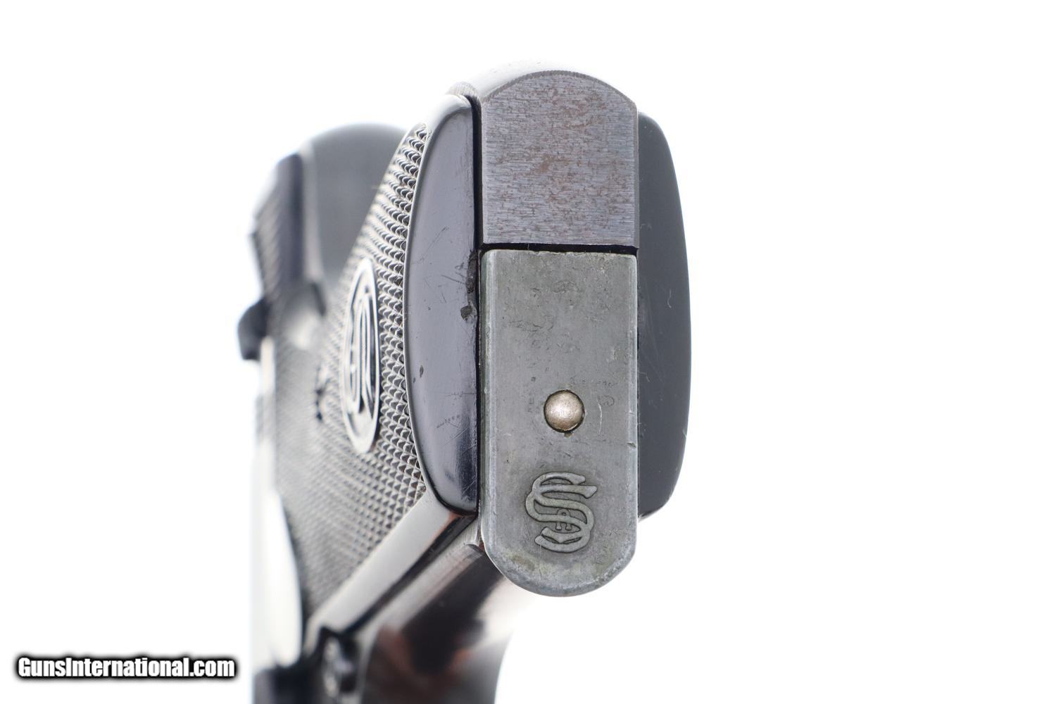 Manufactured by J.P. Sauer & Sohn, this compact semi-automatic handgun gained prominence during World War II. Serving as a sidearm for various German military and police units, the Sauer 38H played a role in the arsenal of firearms used by these forces. This late war, rough milled pistol has fixed front sight and drift adjustable rear sight. Usual late abbreviated address on left side of slide, simply referencing the caliber. Military Eagle/37 marking on left upper trigger guard web. Usual Eagle/N proofing on slide and frame. Full serial number on frame, with last 4 digits on matching slide. Original grips, with the left panel molded to have the intertwined SS. Correct magazine with 7 indicator holes and removable floorplate with the SS logo.