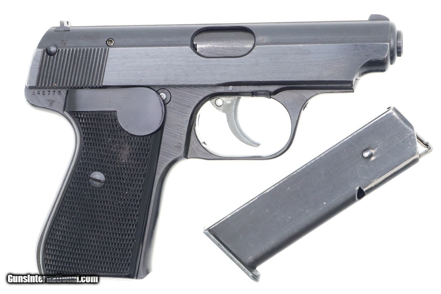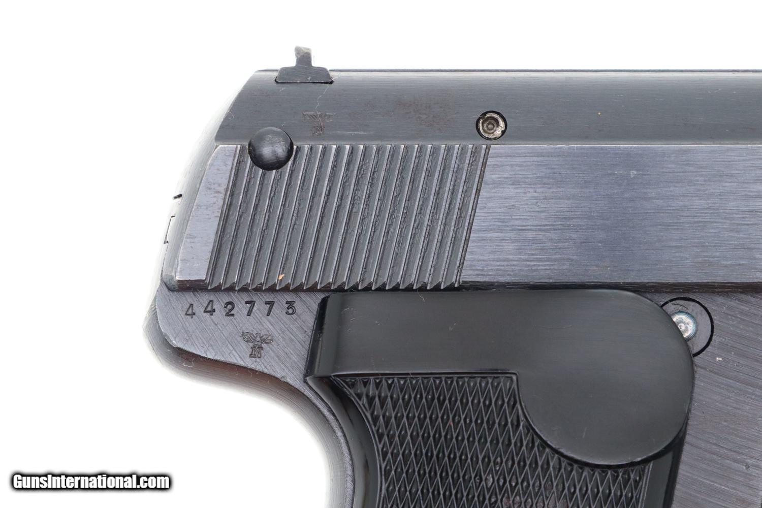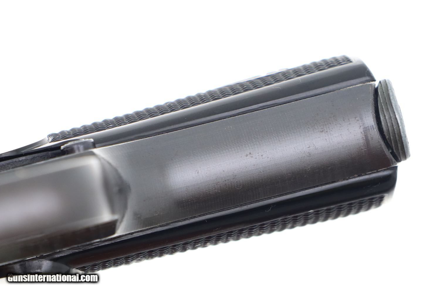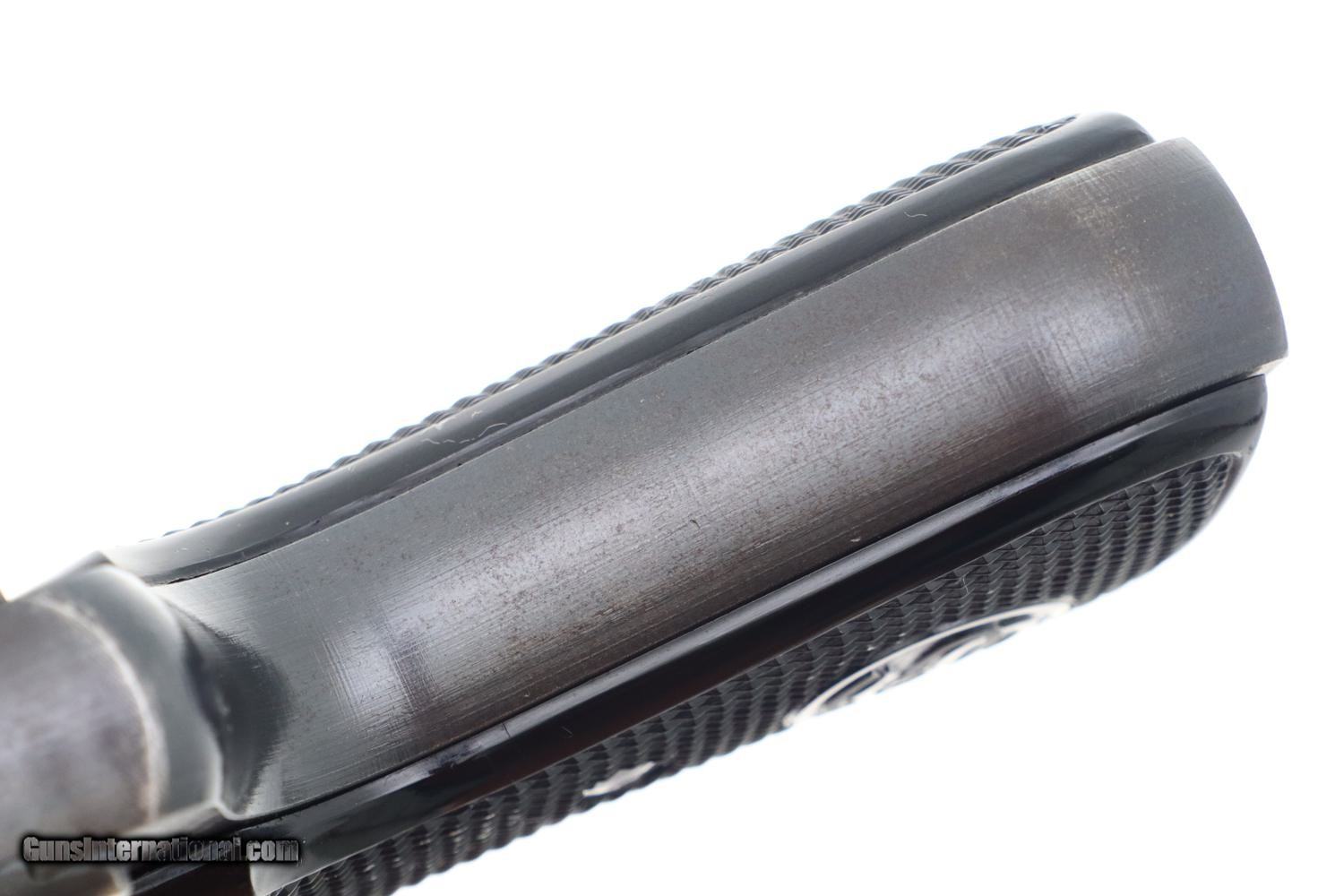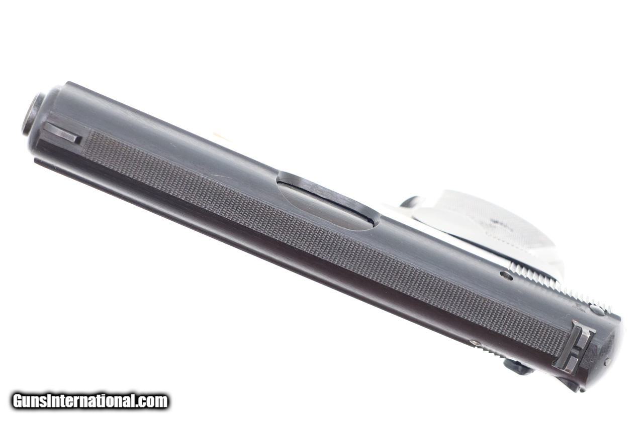 Crisp 99+% original blue with only the most minimal sharp edge wear at muzzle and back of tang. Even the front and back straps are truly excellent, as are the grips and grip screws. VG+ magazine, with fading as imaged. Mirror bore, perfect manual mechanics. It would be difficult to improve upon this late war German Army issue pistol.