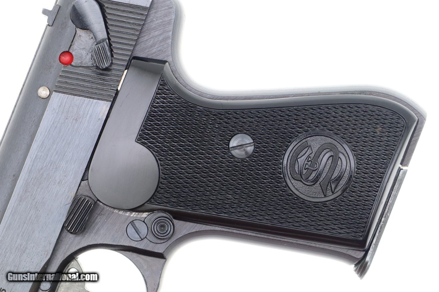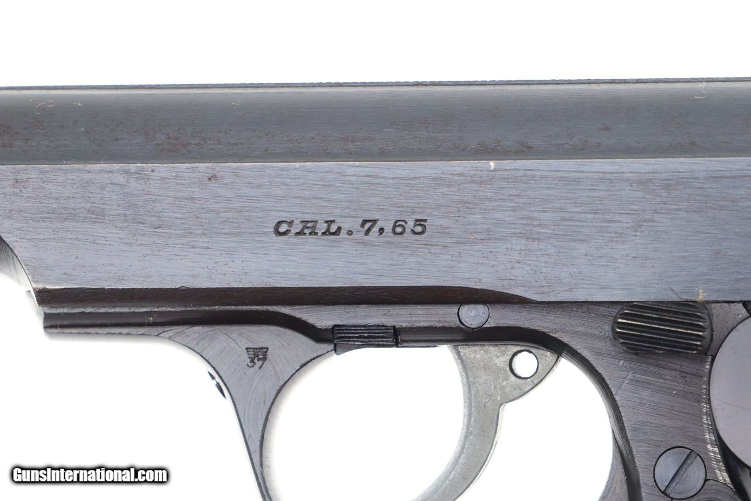Description: Synopsis: Super attractive, high condition, late WWII, German Na*i Army issue Sauer 38H with original grips and correct magazine. Description: Manufactured by J.P. Sauer & Sohn, this compact semi-automatic handgun gained prominence during World War II. Serving as a sidearm for various German military and police units, the Sauer 38H played a role in the arsenal of firearms used by these forces. This late war, rough milled pistol has fixed front sight and drift adjustable rear sight. Usual late abbreviated address on left side of slide, simply referencing the caliber. Military Eagle/37 marking on left upper trigger guard web. Usual Eagle/N proofing on slide and frame. Full serial number on frame, with last 4 digits on matching slide. Original grips, with the left panel molded to have the intertwined SS. Correct magazine with 7 indicator holes and removable floorplate with the SS logo. Condition: Crisp 99+% original blue with only the most minimal sharp edge wear at muzzle and back of tang. Even the front and back straps are truly excellent, as are the grips and grip screws. VG+ magazine, with fading as imaged. Mirror bore, perfect manual mechanics. It would be difficult to improve upon this late war German Army issue pistol. Curio/Relic: Yes Manufacturer: Sauer Model: 38H Serial Number: 442773 Caliber Info: 7.65mm Condition: EXC Price: $1,695.00 Contact Seller |