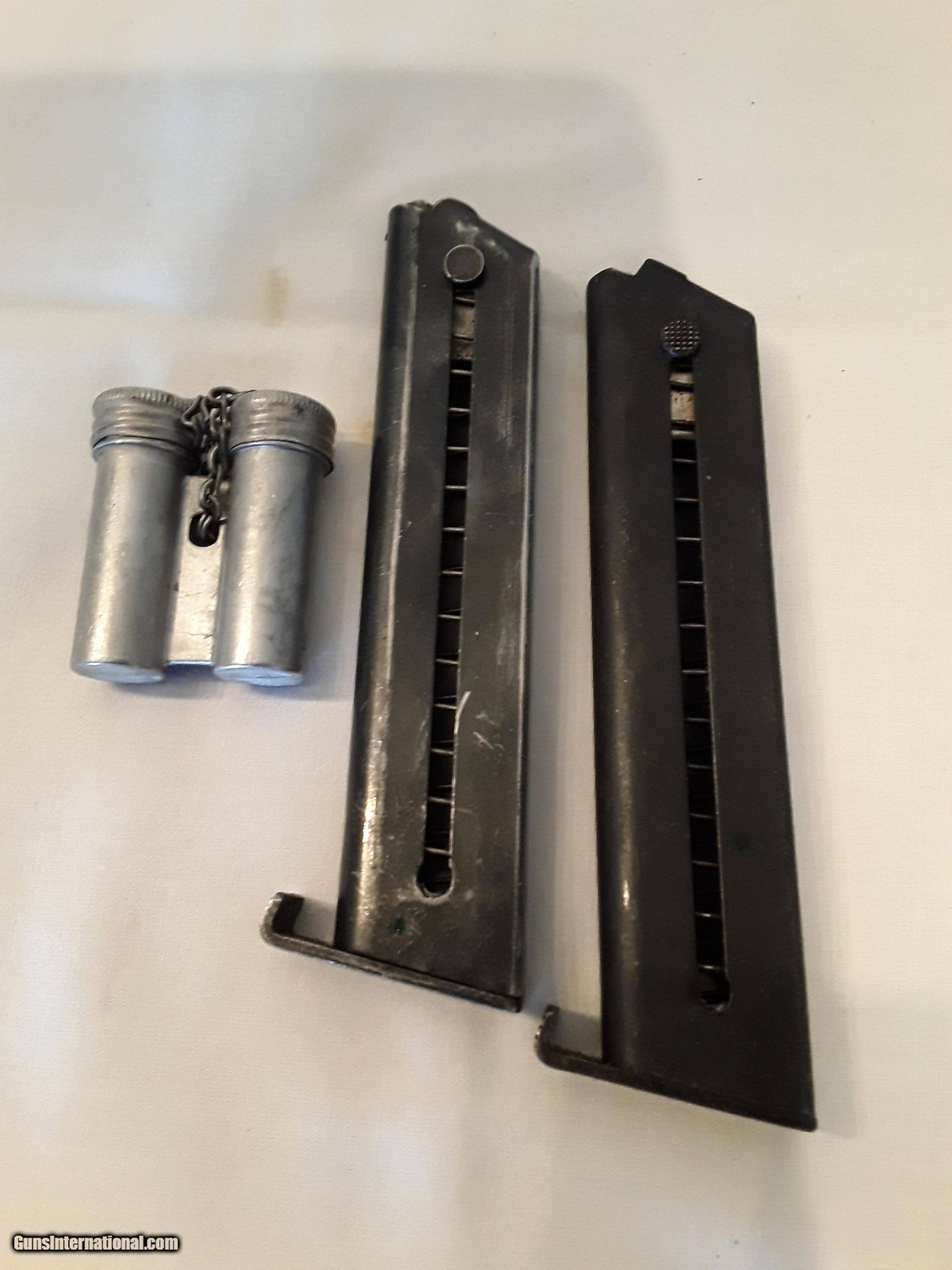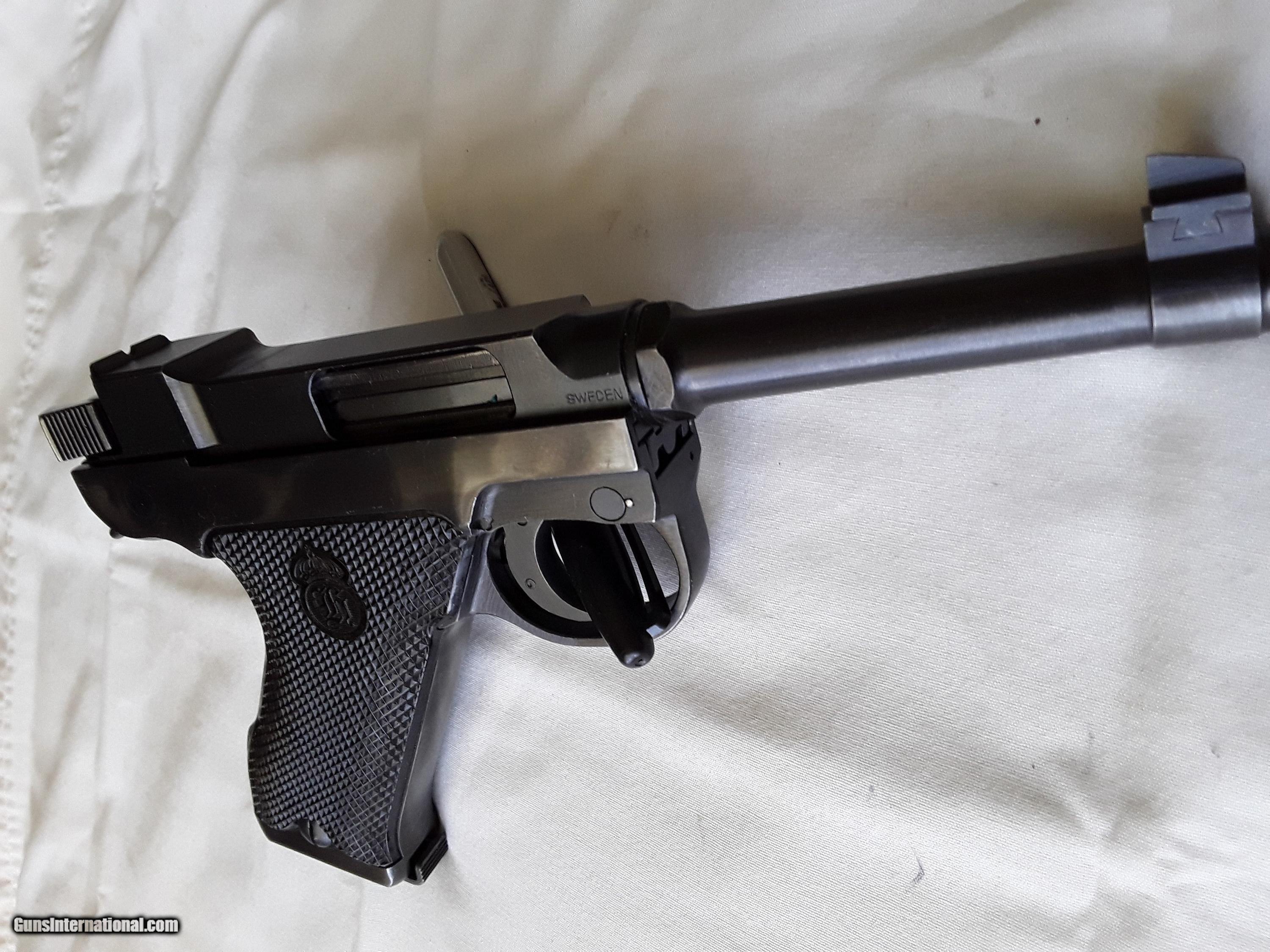 Description: This is a Swedish Mod. 40 9mm Lahti. It is in excellent condition with about 95% original blue. The pistol comes with the holster, 4 mags, loading tool, cleaning rod, lanyard and oiler. The price is $1,695.00 plus $25.00 shipping and insurance. If you have questions, give me a call. SOLD |