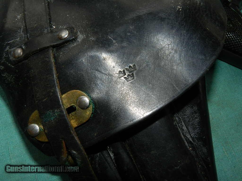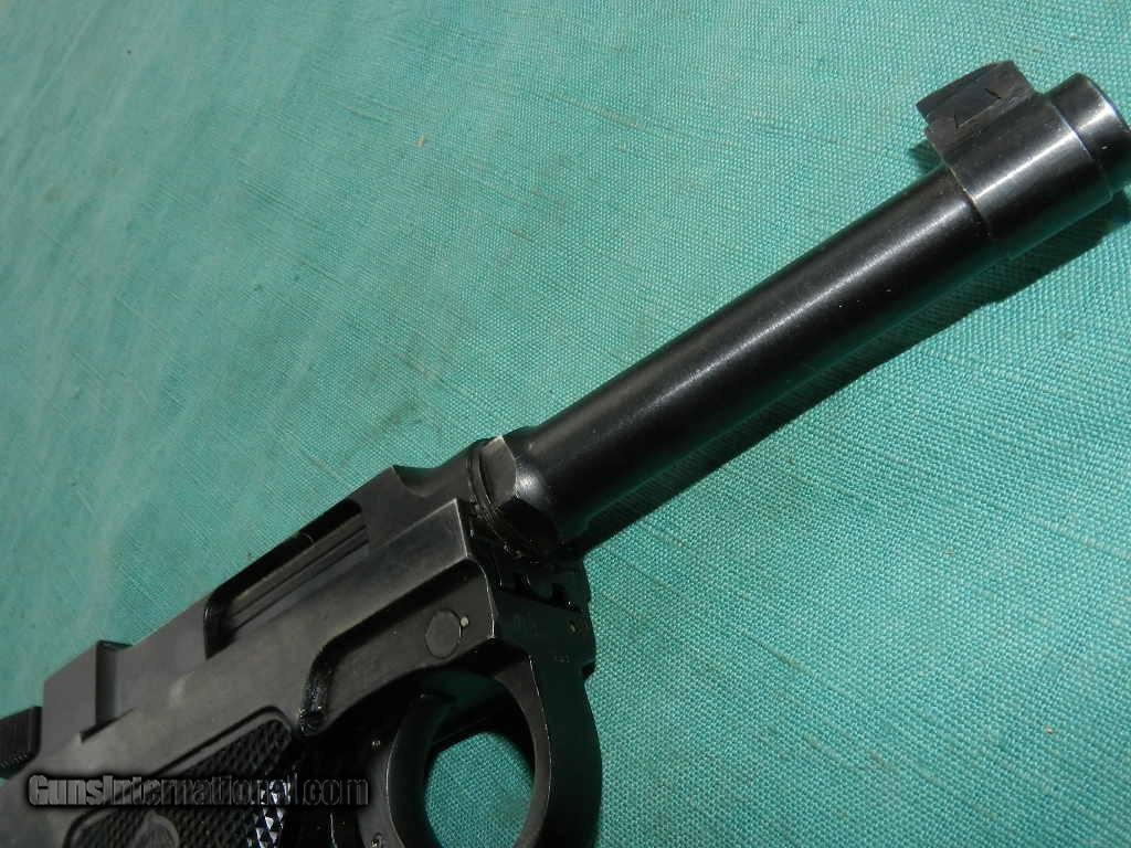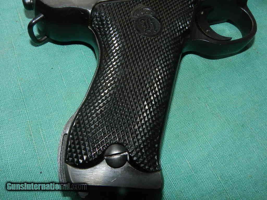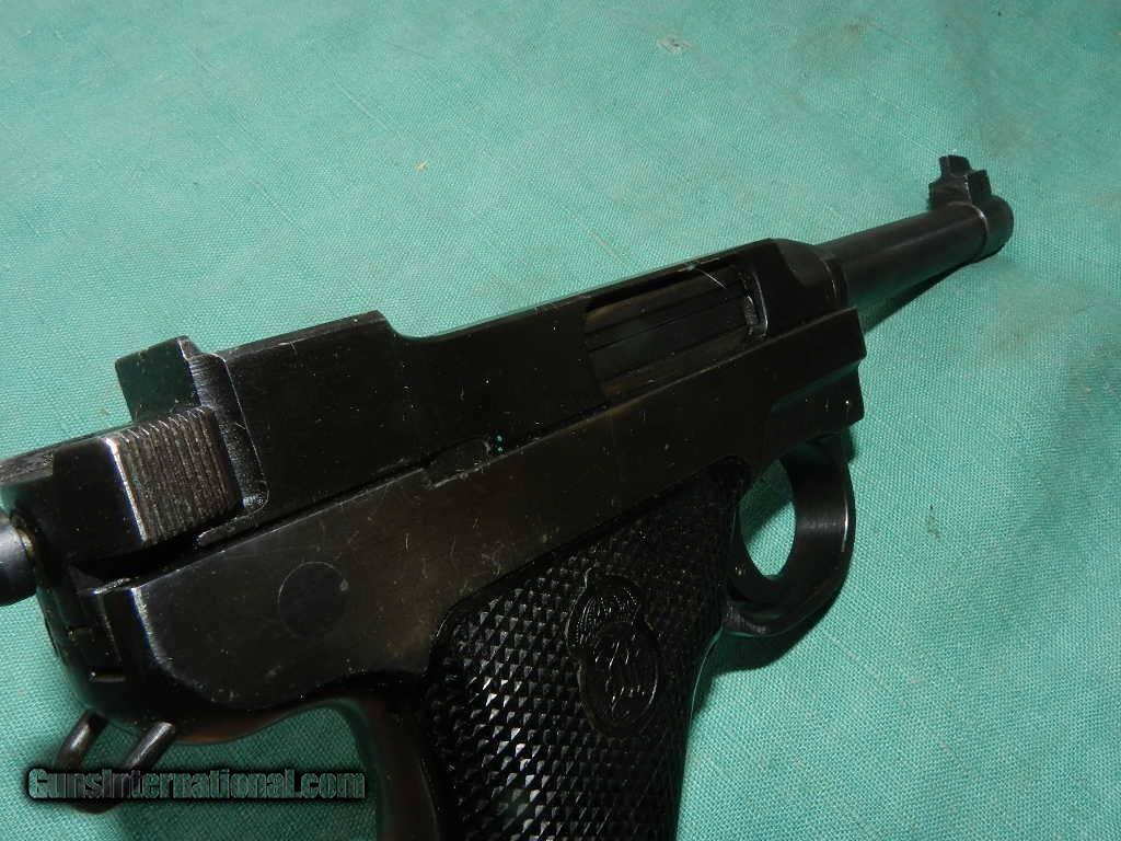 Description: <<<SOLD>>> A Swedish M40 Husqvarna rig, Military, with black leather holster compartmentalized for two magazines, cleaning rod and take down tool. SN:D13053 Cal: 9mmP. Standard configuration Husqvarna M40 with 4.5” barrel, drift adjustable front and fixed rear sight. Left side of barrel extension with manufacturer marking and full serial number that is repeated immediately below on the left side of frame. Rear of frame with acceptance Crown/HV. Black plastic grips with Husqvarna logo within a pressed checkered field, each panel secured with a single screw. Discreet import marking on bottom of frame. Rig comes complete with black, well marked holster, one spare magazines, takedown tool and cleaning rod. Condition: Approximately 96% bright original salt blue with sharp edge wear as expected from a holstered sidearm. Surprisingly little wear on front and backstrap. Mirror bore. Perfect manual mechanics. Very good holster and accessories. An attractive M40, with full rig excepting one magazine (readily available), that presents very nicely.Check my inventory of rare grips, unusual gun parts, barrels and holsters. Shipping may be higher than stated as shippers raise their prices twice year without notice! When buying a gun always have it examined by a competent gunsmith before shooting. To buy a gun from me you must get a direct email for me, with details, and shipping cost. We don’t have a web site .I prefer money orders or a check. Item ships when funds come in. If you can only pay with a card let me know. I try to keep guns affordable, which means I make less money than most dealers. You won’t get altitude sickness, or nose bleed, with my prices! I consistently have the best selection of older guns If you attempt to buy, you must still contact us for details . Best to email to buy. Sometimes a local person can stop buy and purchase before the gun is removed. Sometimes not home to get calls. Some guns are required shipment to a gun dealer near you for a transfer to you when it arrives. Otherwise many older or black powder guns ship to your door. With the widest selection of older guns at great prices, We don’t have a store, and sell on the internet only. I’m easy to get along with. Thank You. SOLD Curio/Relic: Yes Manufacturer: Husqvarna Model: M40 Serial Number: 13053 Caliber Info: 9mm |