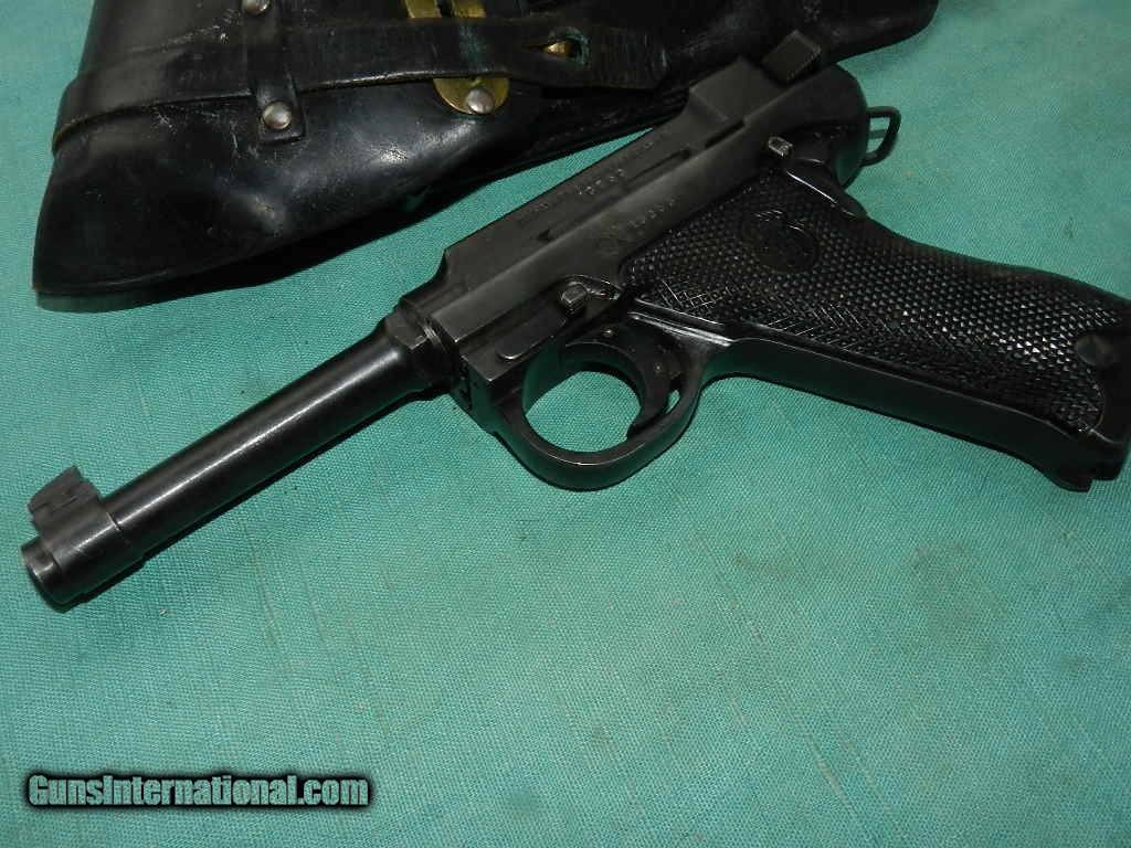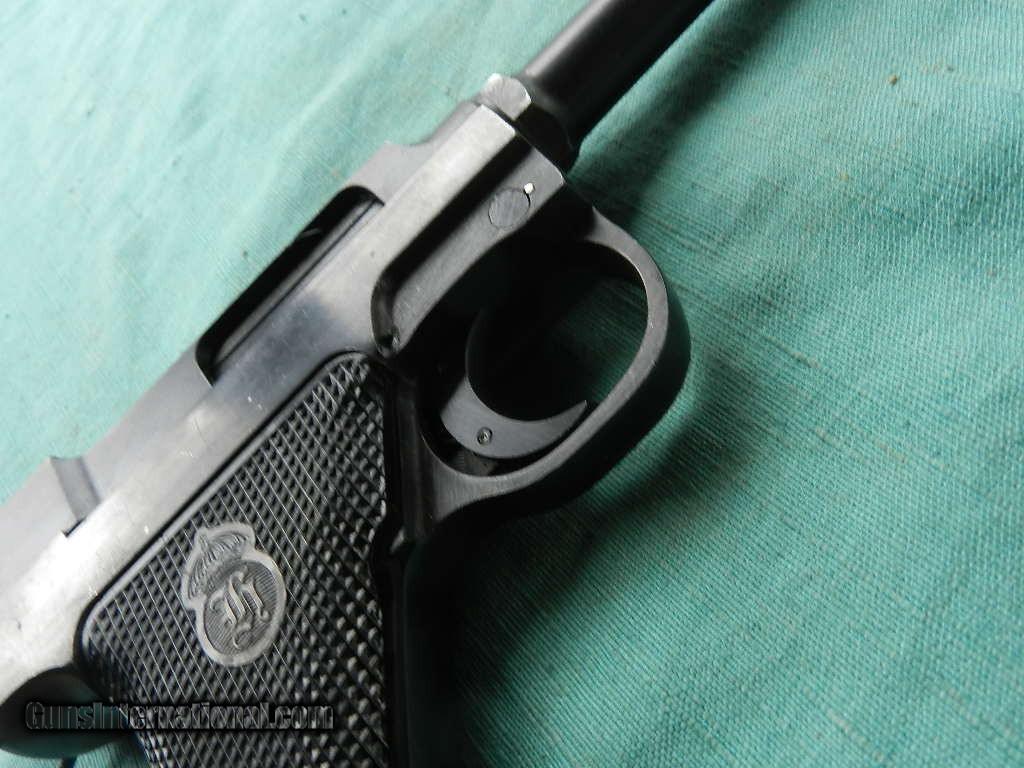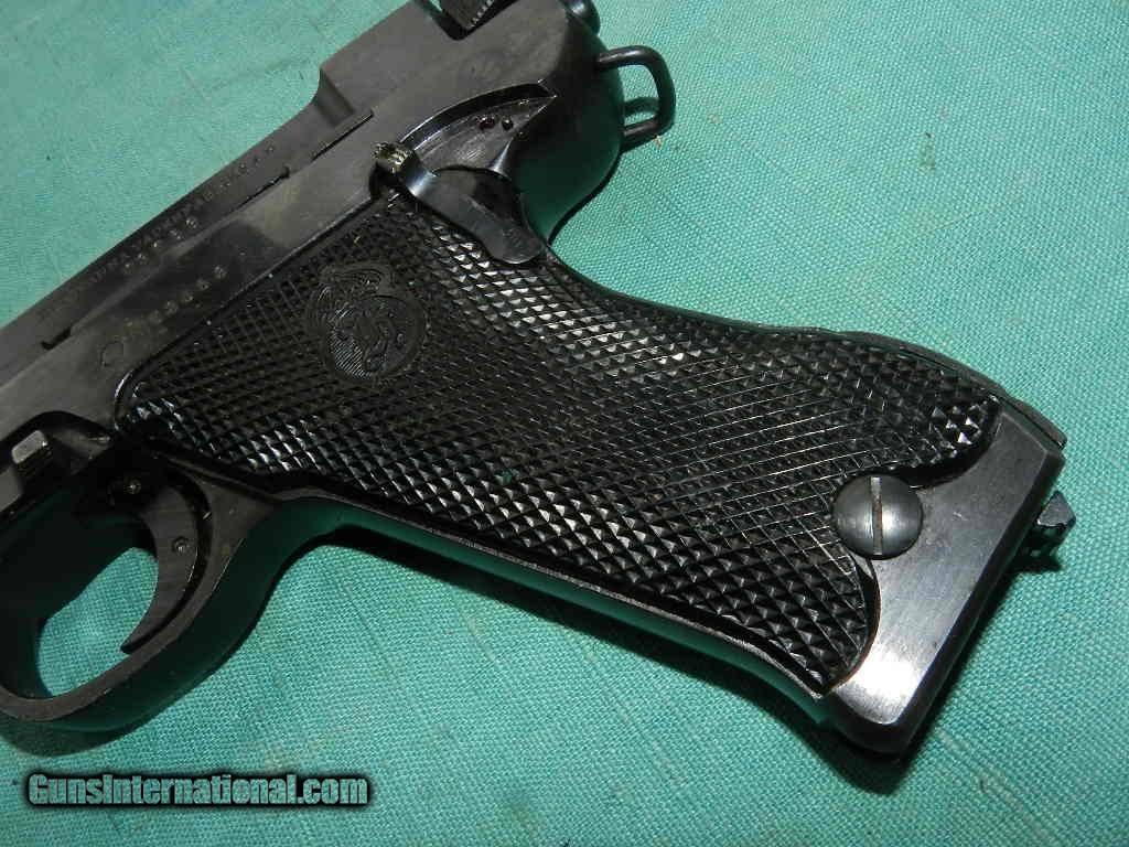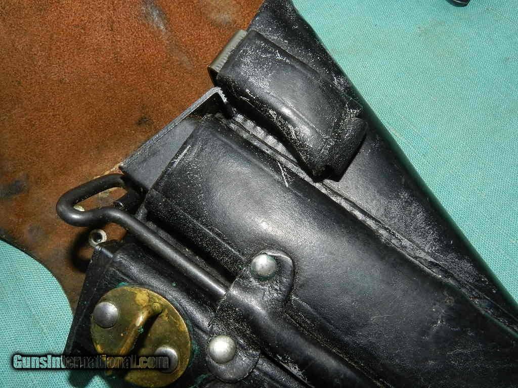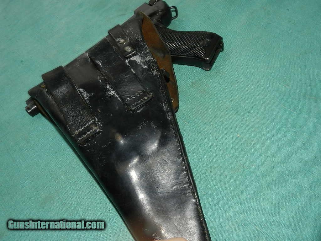Description: <<<SOLD>>> A Swedish M40 Husqvarna rig, Military, with black leather holster compartmentalized for two magazines, cleaning rod and take down tool. SN:D13053 Cal: 9mmP. Standard configuration Husqvarna M40 with 4.5” barrel, drift adjustable front and fixed rear sight. Left side of barrel extension with manufacturer marking and full serial number that is repeated immediately below on the left side of frame. Rear of frame with acceptance Crown/HV. Black plastic grips with Husqvarna logo within a pressed checkered field, each panel secured with a single screw. Discreet import marking on bottom of frame. Rig comes complete with black, well marked holster, one spare magazines, takedown tool and cleaning rod. Condition: Approximately 96% bright original salt blue with sharp edge wear as expected from a holstered sidearm. Surprisingly little wear on front and backstrap. Mirror bore. Perfect manual mechanics. Very good holster and accessories. An attractive M40, with full rig excepting one magazine (readily available), that presents very nicely.Check my inventory of rare grips, unusual gun parts, barrels and holsters. Shipping may be higher than stated as shippers raise their prices twice year without notice! When buying a gun always have it examined by a competent gunsmith before shooting. To buy a gun from me you must get a direct email for me, with details, and shipping cost. We don’t have a web site .I prefer money orders or a check. Item ships when funds come in. If you can only pay with a card let me know. I try to keep guns affordable, which means I make less money than most dealers. You won’t get altitude sickness, or nose bleed, with my prices! I consistently have the best selection of older guns If you attempt to buy, you must still contact us for details . Best to email to buy. Sometimes a local person can stop buy and purchase before the gun is removed. Sometimes not home to get calls. Some guns are required shipment to a gun dealer near you for a transfer to you when it arrives. Otherwise many older or black powder guns ship to your door. With the widest selection of older guns at great prices, We don’t have a store, and sell on the internet only. I’m easy to get along with. Thank You. SOLD Curio/Relic: Yes Manufacturer: Husqvarna Model: M40 Serial Number: 13053 Caliber Info: 9mm |