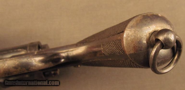 Description: Serial #633, 7.5mm Swedish, 4 1/2” octagon barrel with an excellent, bright bore. This is a handsome revolver, made circa 1900, that has 85-90% of its original bright rust-blued finish remaining with some light fading and silvering along the edges of the barrel and unit marked frame (“L No. 3724”). Additionally, there are some small areas of freckling and pinprick pitting visible on the trigger, hammer, and loading gate spring which retain much of their original dark but brilliant straw color and the cylinder, which has a light turn-ring and mild fading at the edges. The checkered wooden grips are in very good-fine condition and exhibit some minor flattening of the points with light handling marks at the butt on either side. The revolver locks up tightly and the mechanism functions flawlessly and is housed in an original dark brown leather flap holster with double belt loops and black enameled snap fastener. This is a great “Husky” in fine overall condition that would make a nice addition to any collection. FFL or C&R SOLD Curio/Relic: Yes Manufacturer: Swedish Model: 1887 Serial Number: 633 Caliber Info: 7.5mm Gauge Info: 7.5mm |