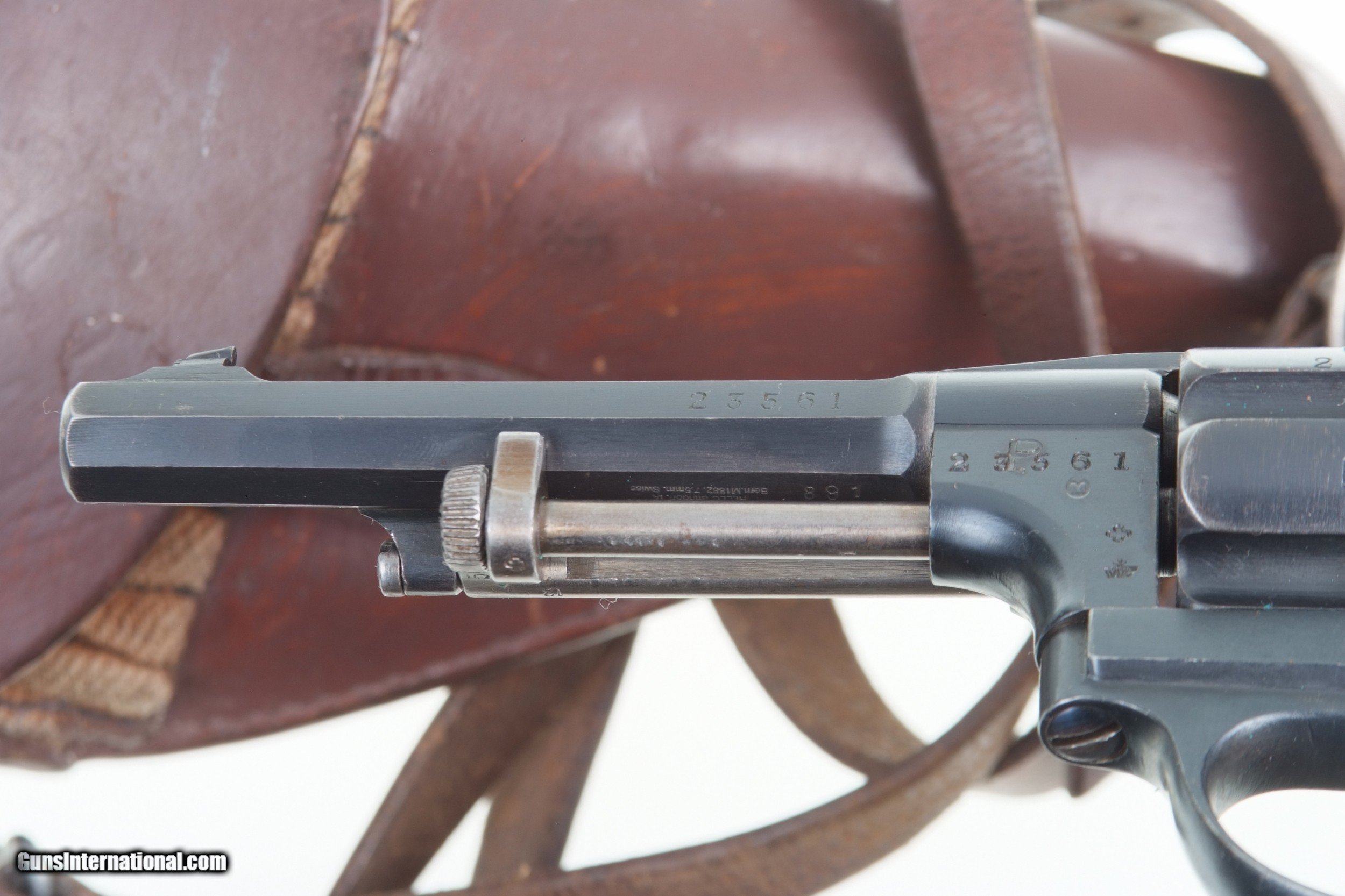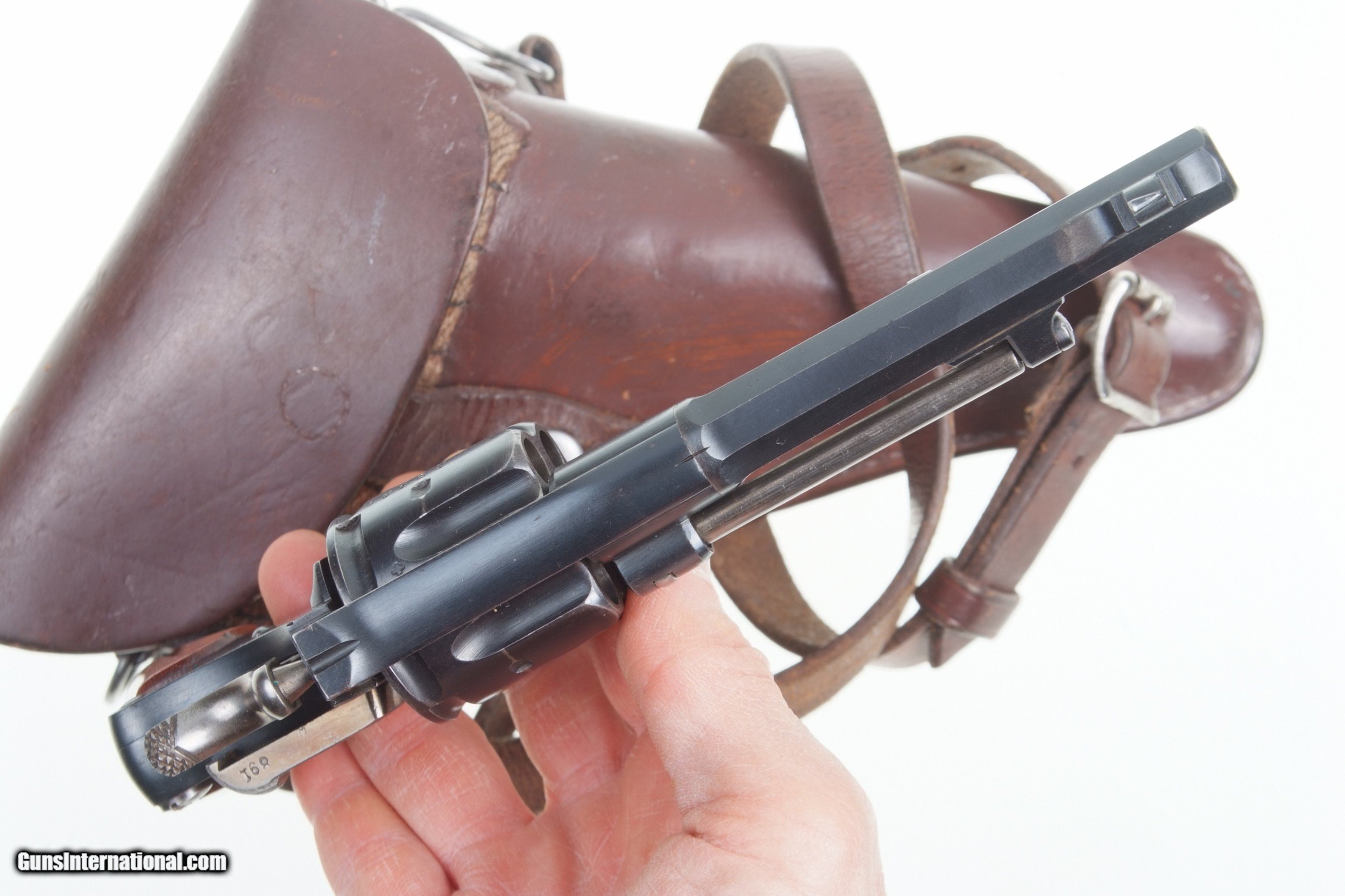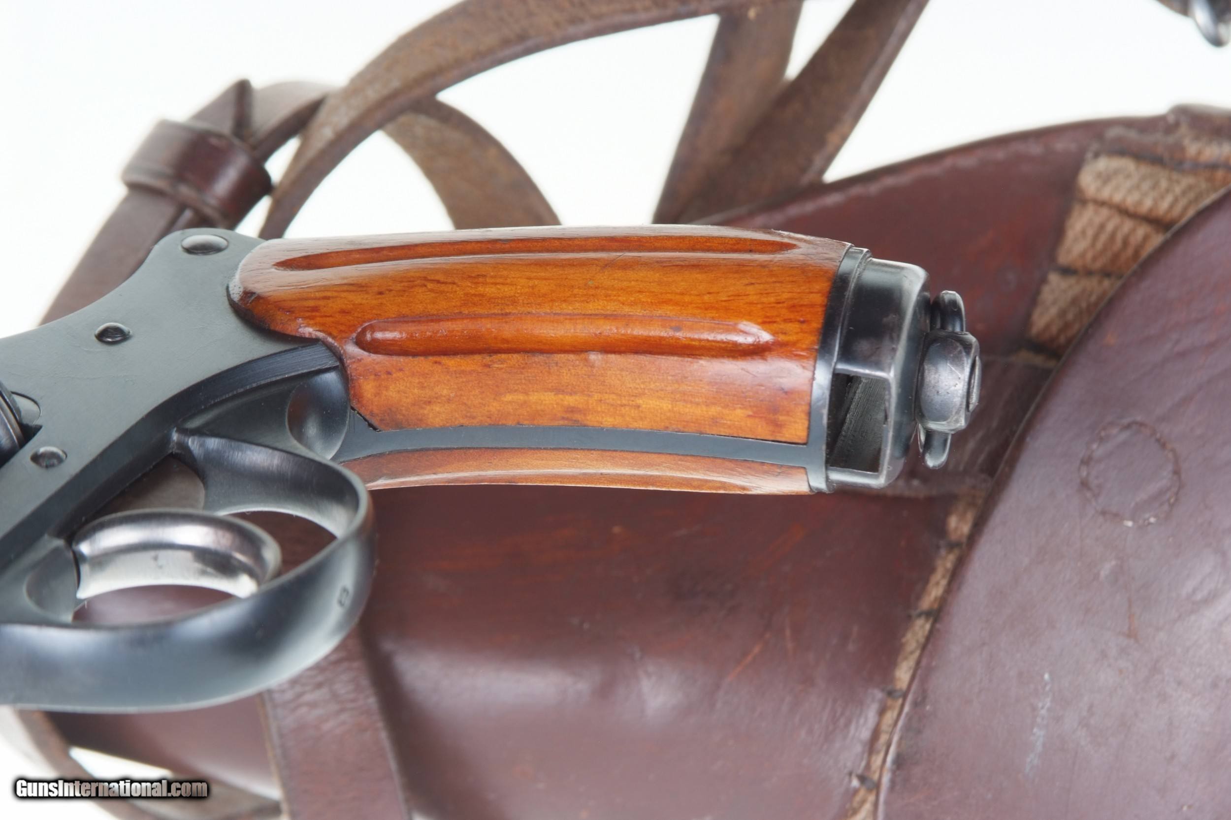 Description: Excellent, original finish, Swiss M1882 Revolver, fully matching, with holster and strap. SN: 23561. Cal: 7.5mm. Standard configuration M1882 SA/DA revolver with 4.5” barrel having fixed front and rear sights. All matching parts including barrel, frame, cylinder, hammer, trigger, loading gate, cylinder pin, ejector, etc. Discrete import marking on barrel under cylinder pin. Major parts are rust blued with strawed small parts. Varnished, fluted wood grips. Butt with rotatable lanyard ring. Military holster and strap with minor oil staining. Obverse side of holster manufacturer marked and dated “31”. Strap is unmarked. Condition: Approximately 97-98% bright original rust blue finish with minor sharp edge wear from careful use. Comparable condition strawed parts showing no evidence of enhancement. Grips with original varnish having scattered handling dings. Wear around butt cap from contact with holster. Mirror bright bore. Perfect manual mechanics. Holster and strap in VG+ condition showing no evidence of re-stitching or repair. An extremely nice mid production M1882 Swiss military revolver with a later dated holster and strap. A HISTORIC INVESTMENT! # I-475 Buyer pays $40.00 shipping SOLD Curio/Relic: Yes Manufacturer: Waffenfabrik Bern Model: 1882 |
