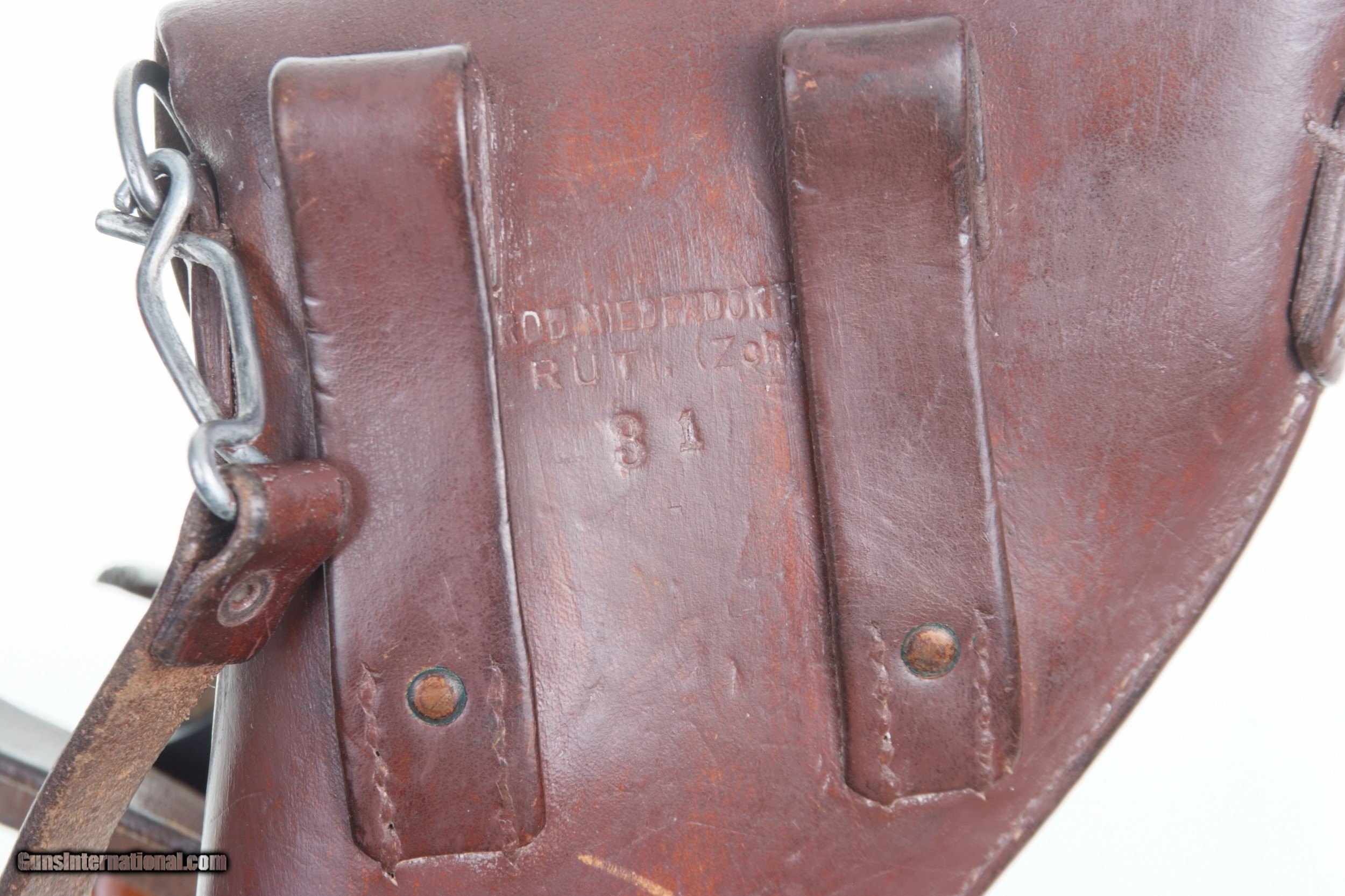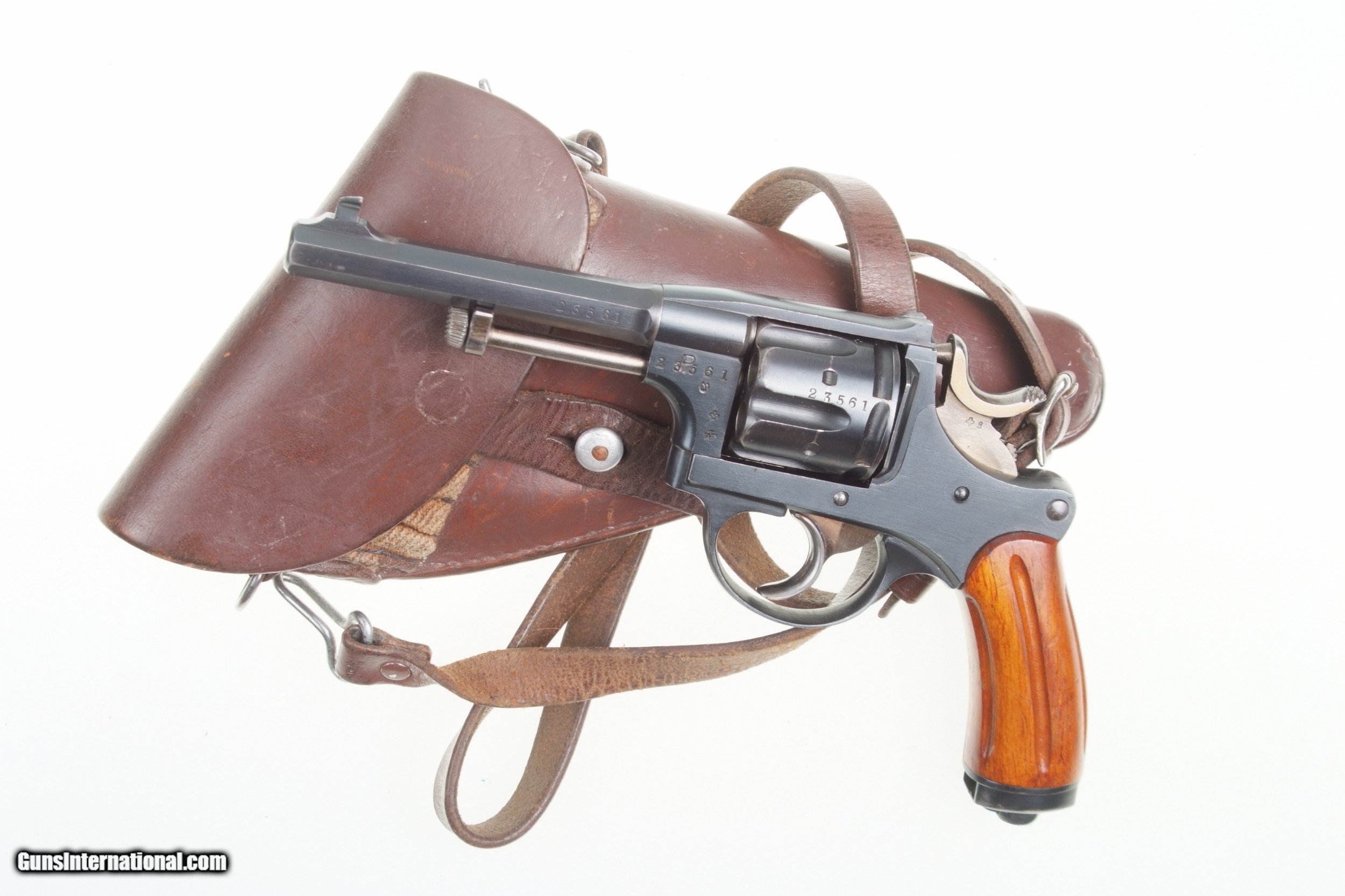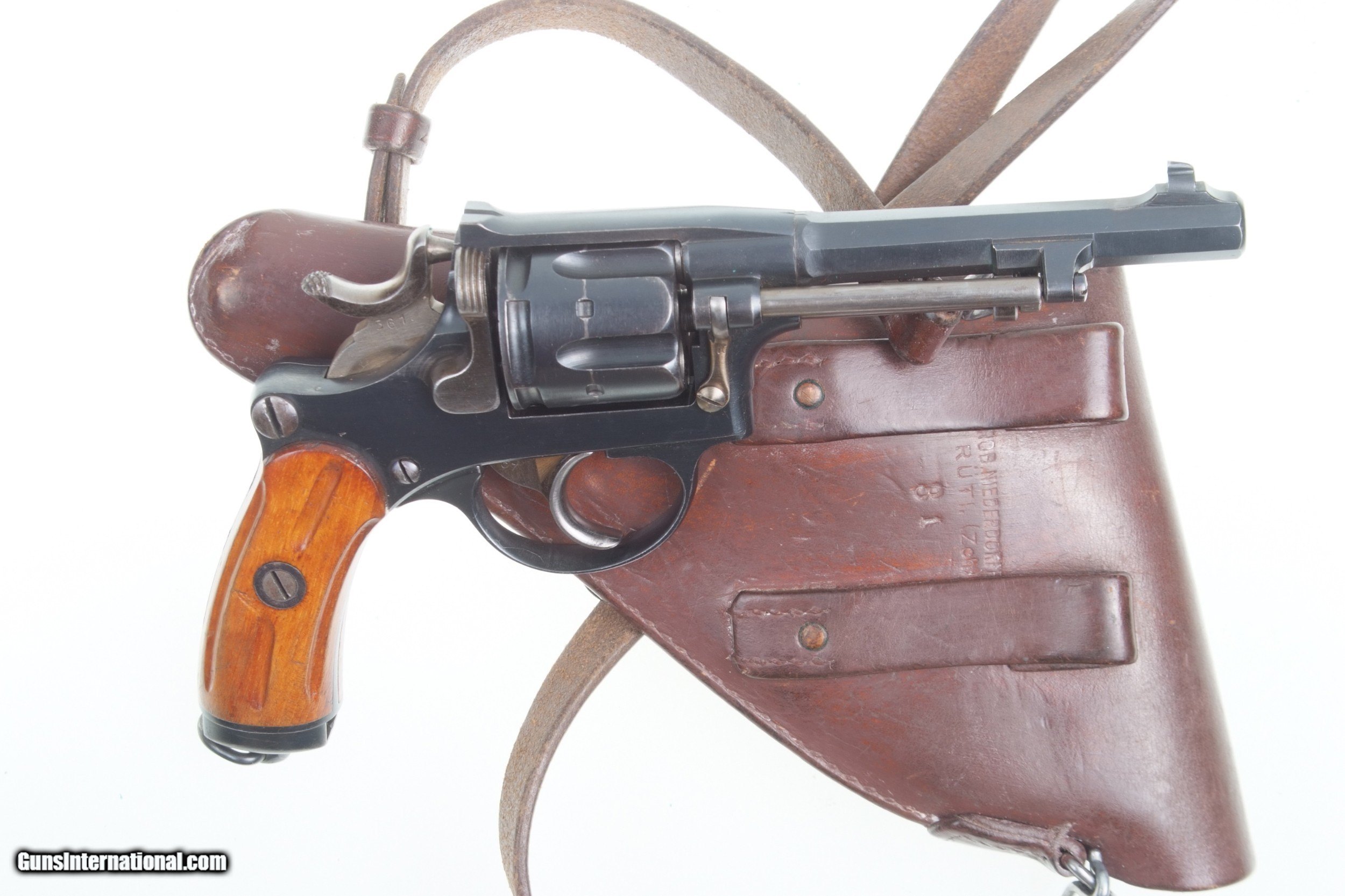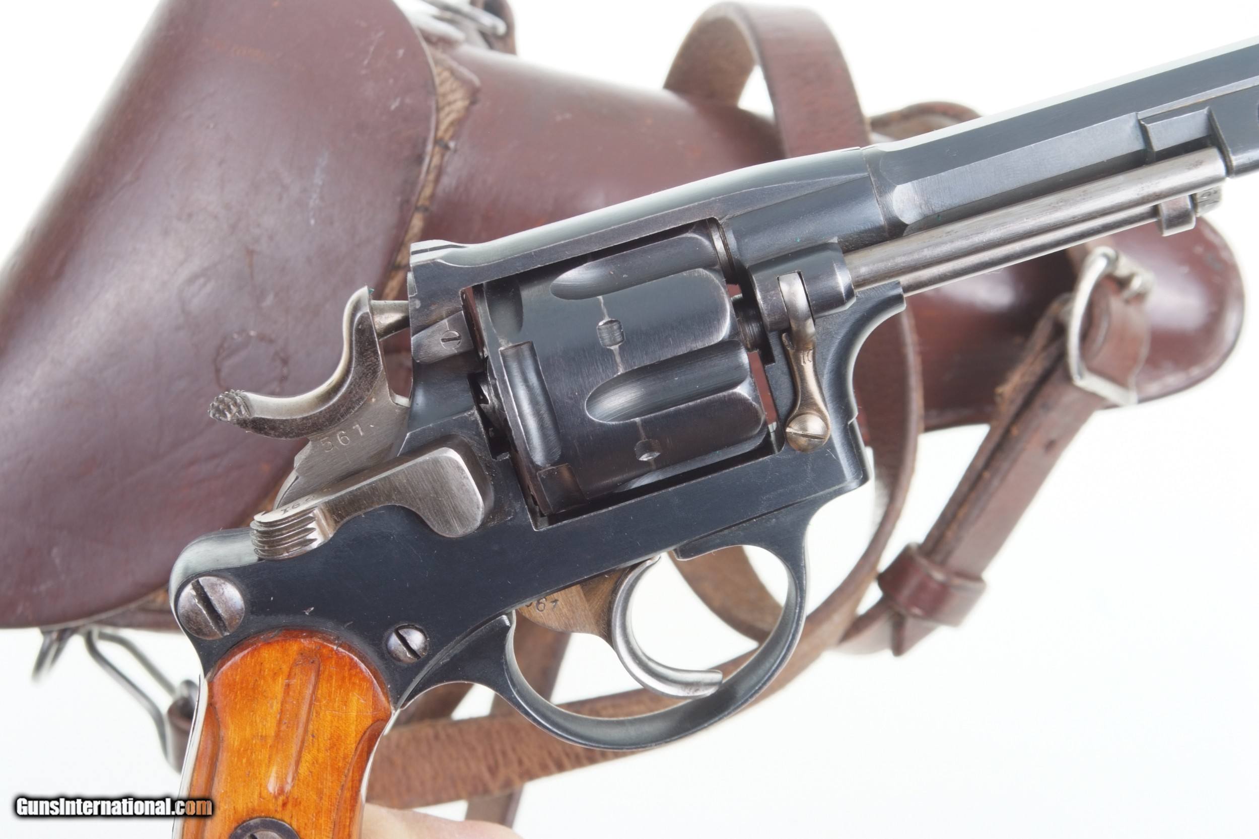 Description: Excellent, original finish, Swiss M1882 Revolver, fully matching, with holster and strap. SN: 23561. Cal: 7.5mm. Standard configuration M1882 SA/DA revolver with 4.5” barrel having fixed front and rear sights. All matching parts including barrel, frame, cylinder, hammer, trigger, loading gate, cylinder pin, ejector, etc. Discrete import marking on barrel under cylinder pin. Major parts are rust blued with strawed small parts. Varnished, fluted wood grips. Butt with rotatable lanyard ring. Military holster and strap with minor oil staining. Obverse side of holster manufacturer marked and dated “31”. Strap is unmarked. Condition: Approximately 97-98% bright original rust blue finish with minor sharp edge wear from careful use. Comparable condition strawed parts showing no evidence of enhancement. Grips with original varnish having scattered handling dings. Wear around butt cap from contact with holster. Mirror bright bore. Perfect manual mechanics. Holster and strap in VG+ condition showing no evidence of re-stitching or repair. An extremely nice mid production M1882 Swiss military revolver with a later dated holster and strap. A HISTORIC INVESTMENT! # I-475 Buyer pays $40.00 shipping SOLD Curio/Relic: Yes Manufacturer: Waffenfabrik Bern Model: 1882 |