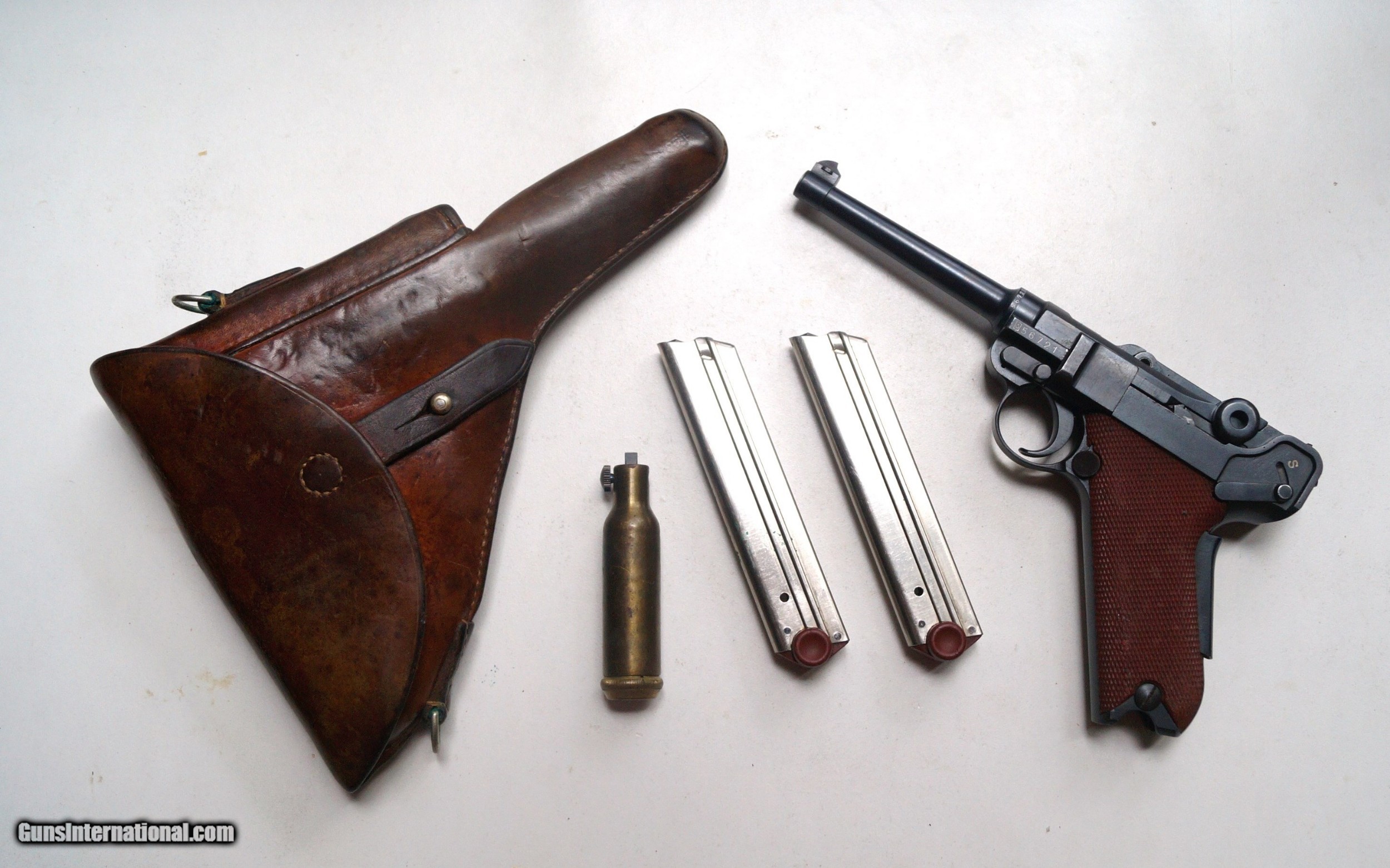 Description: THIS IS A SWISS BERN 1929 "RED GRIP" RIG,7.65MM. THE LUGER IS IN VERY GOOD CONDITION. ALL ORIGINAL, NUMBER MATCHING, VERY GOOD BORE AND GRIPS, MECHANICALLY CORRECT AND TIGHT. THE RIG CONSISTS OF THE LUGER, 2 ORIGINAL RED BOTTOM MAGAZINES, 1 ORIGINAL SWISS HOLSTER WITH CARRYING STRAP AND 1 ORIGINAL SWISS CLEANING KIT. THEY DON'T COME BETTER THAN THIS. SOLD Curio/Relic: Yes |