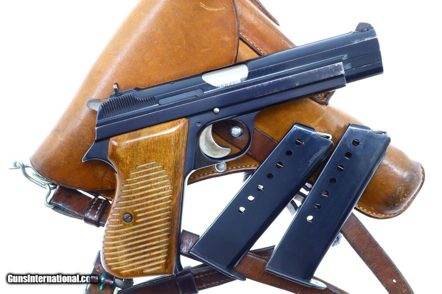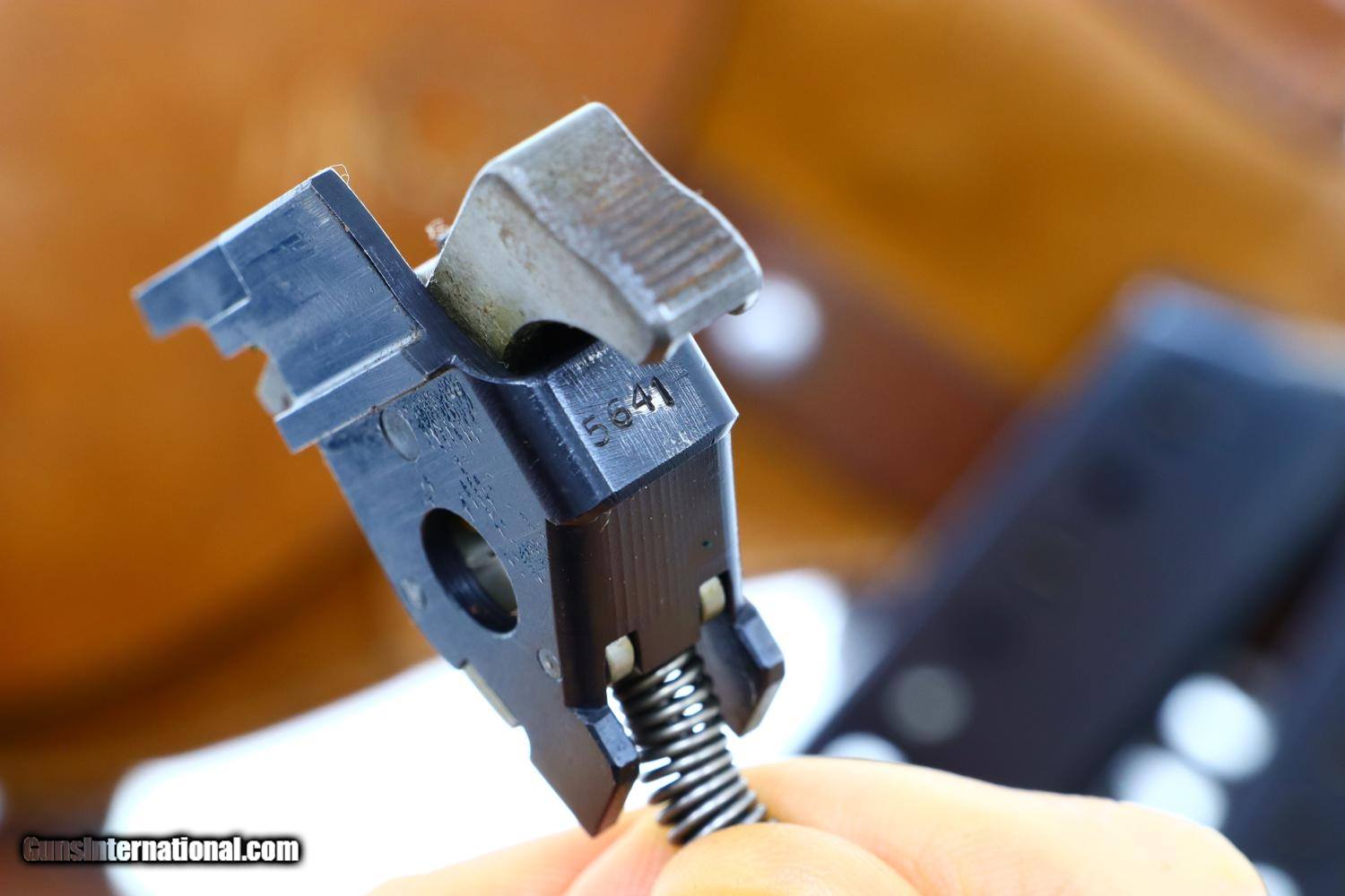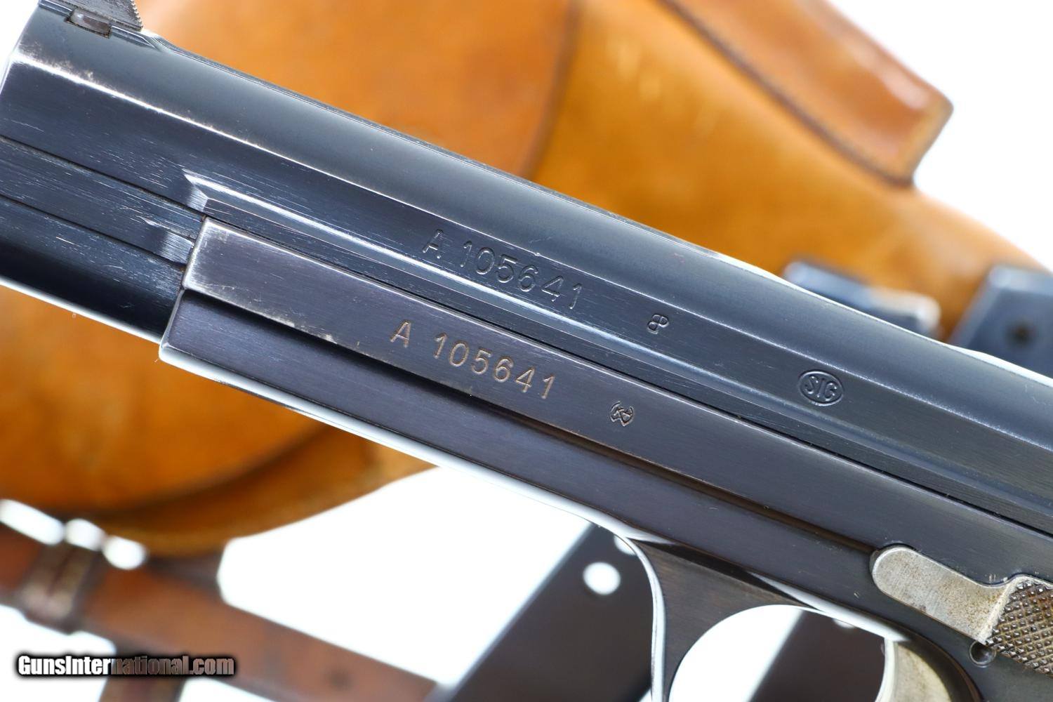 Description: Standard configuration single action pistol with 4.75” barrel and drift adjustable front and rear sight. The left side of the slide and frame are proofed and marked with the full serial number that is repeated on the right side of the barrel hood. Safety detents are marked with an “S” in white and “F” in red. “P” release on the left side of trigger guard. Disassembly shows a matching, original hammer group with no half cock. Fitted with serrated walnut grips secured with fire blued screw. Fixed lanyard ring. Complete with two high-polished magazines and a correctly dated "54" Swiss military holster with a “53” dated strap”. Synopsis: Exceptional, original, and all matching, first contract, SIG P49 Swiss military pistol, no half-cock, full rig as issued. Condition: 97-98% bright, original salt blue with holster wear as expected from a pistol that has seen mild field use. Discoloration on each side of trigger as imaged. No suggestion of touch-up. Comparable condition grips, and original finish high-polish magazines. Mirror bright bore. Perfect manual mechanics. VG+-excellent holster and strap, both with scattered scuffs and staining as photographed. Very nicely manufacturer marked and dated. A very attractive, no-excuse high polish military P49, with its matching, original hammer group, spare magazine and issue dated holster with strap. ~~Insured shipping fee of $75; most packages shipped using FedEx 2nd Day.~~ SOLD Manufacturer: SIG Serial Number: A105641 Caliber Info: 9mmP |