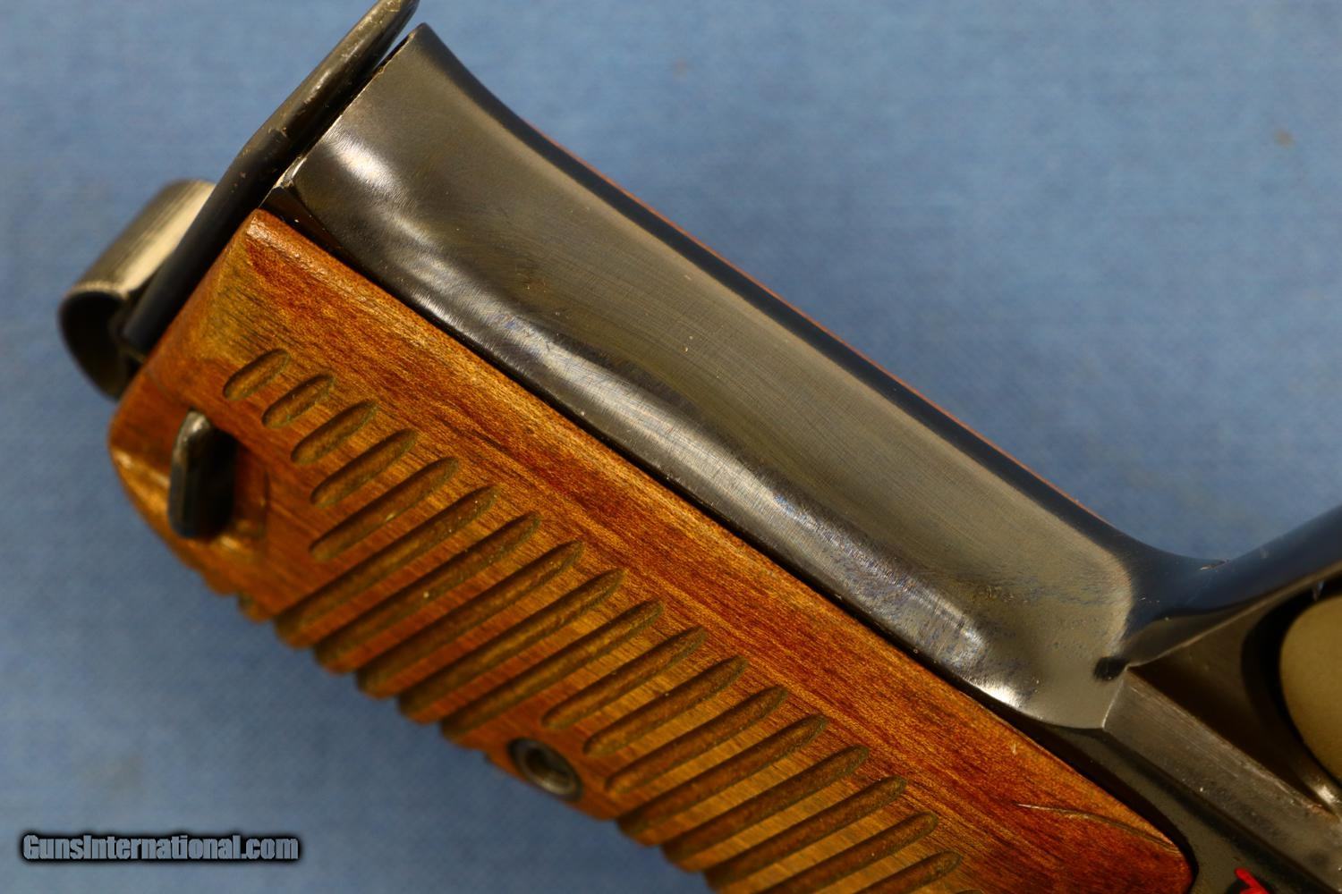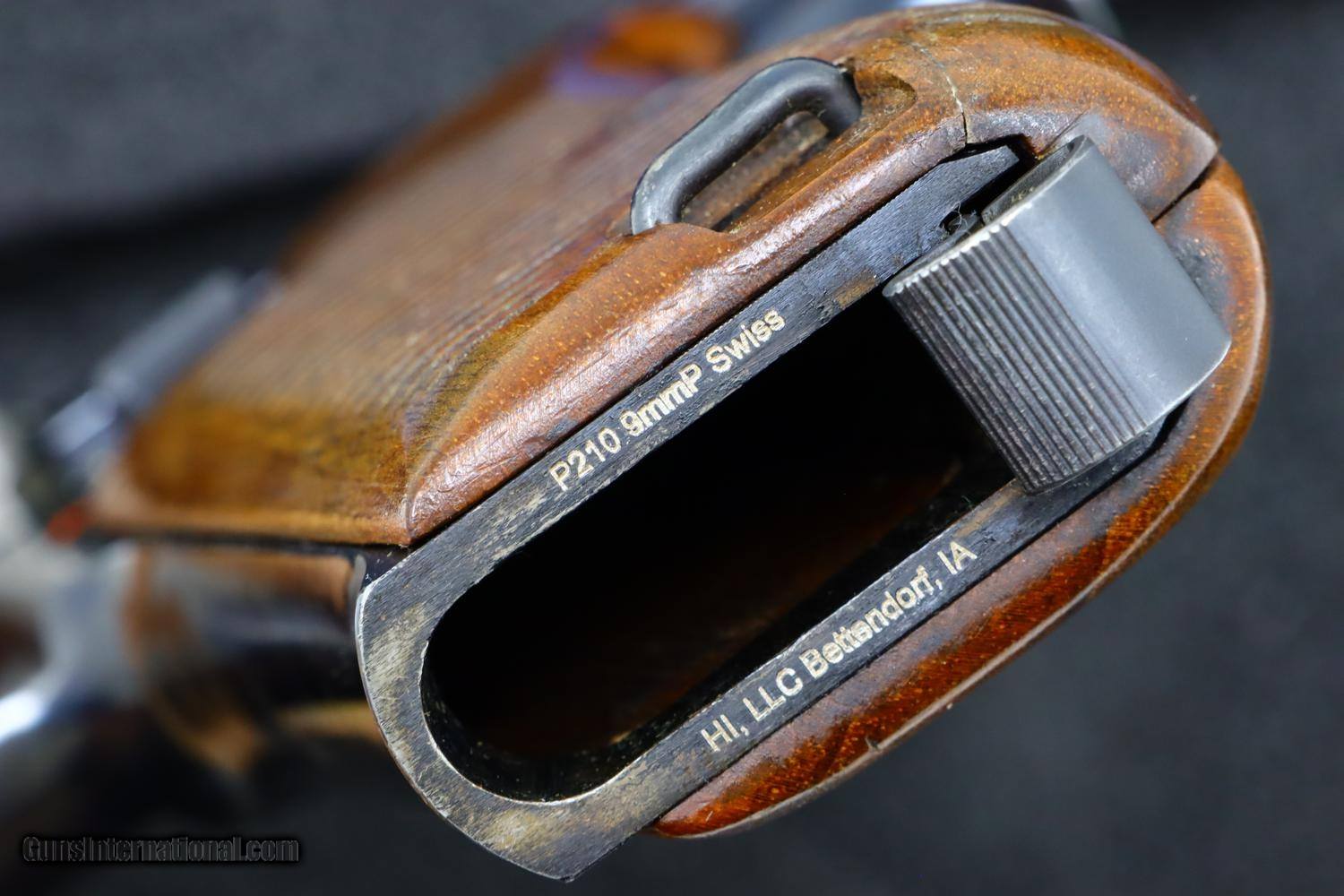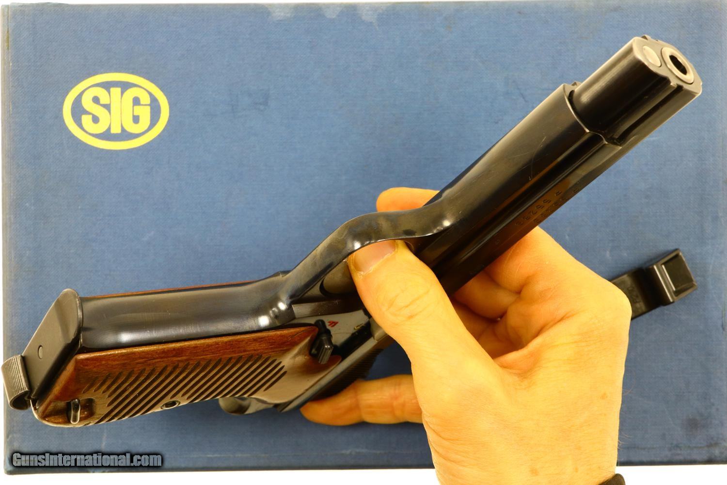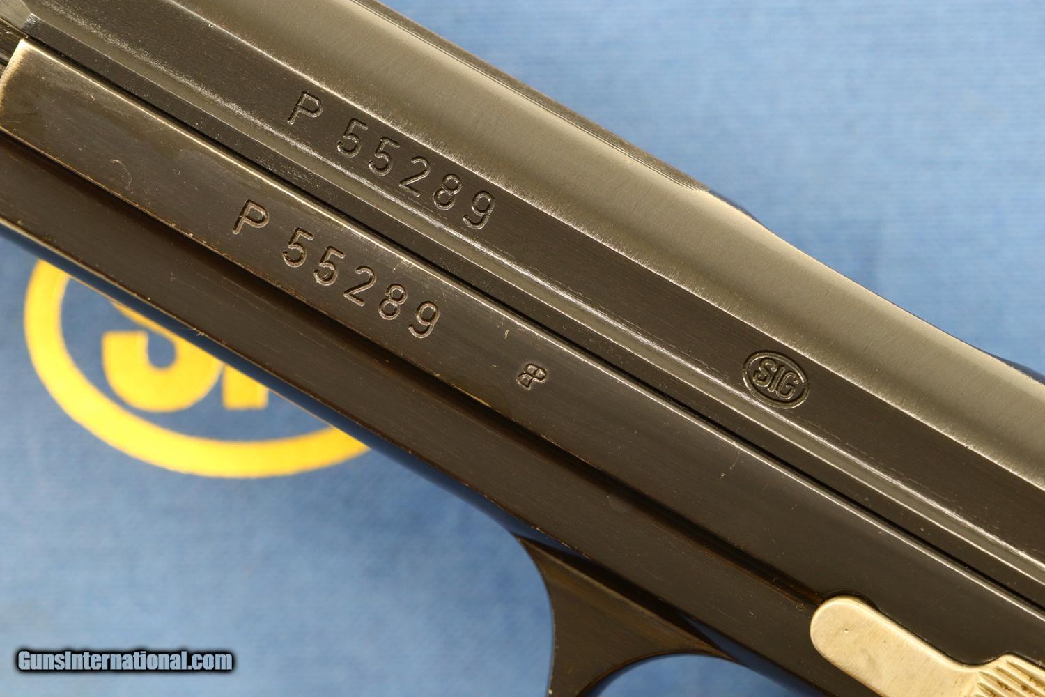 Description: Standard configuration early P210-1, high polish, serial range having been noted as issued to the Zurich Police, with drift adjustable front and rear sights. Swiss cross-in-shield on rear sight base. Left side of slide and frame with full serial number that is repeated on the exposed barrel hood. Usual white highlighted S (safe) and red highlighted F (fire). Disassembly shows a matching, half cock hammer group. Slide, frame, and safety lever are high polish blued with the barrel, hammer, trigger and slide release in the white. Walnut serrated grips secured with a single transverse screw. Unnumbered high polish magazine, original blue, as correct for this pistol. Crisp blue shipping box with relined interior, complete with a SIG marked magazine loader. Synopsis: Beautiful, early production, high polish SIG P210-1 in the commercial āPā prefix serial range, issued to Zurich Police, with walnut serrated grips, loader, blue/gold SIG box. Condition: Approximately 99% original high polish blue, with just minimal sharp edge wear as one might expect from a lightly holstered pistol. Comparable condition grips and magazine. Mirror bore. Perfect manual mechanics. Excellent loader and near excellent box with relining as previously noted. A great early SIG with just enough wear to be used on the range or displayed in your collection. ~~Insured shipping fee of $75; most packages shipped using FedEx 2nd Day.~~ SOLD Manufacturer: SIG Serial Number: P55289 Caliber Info: 9mmP |