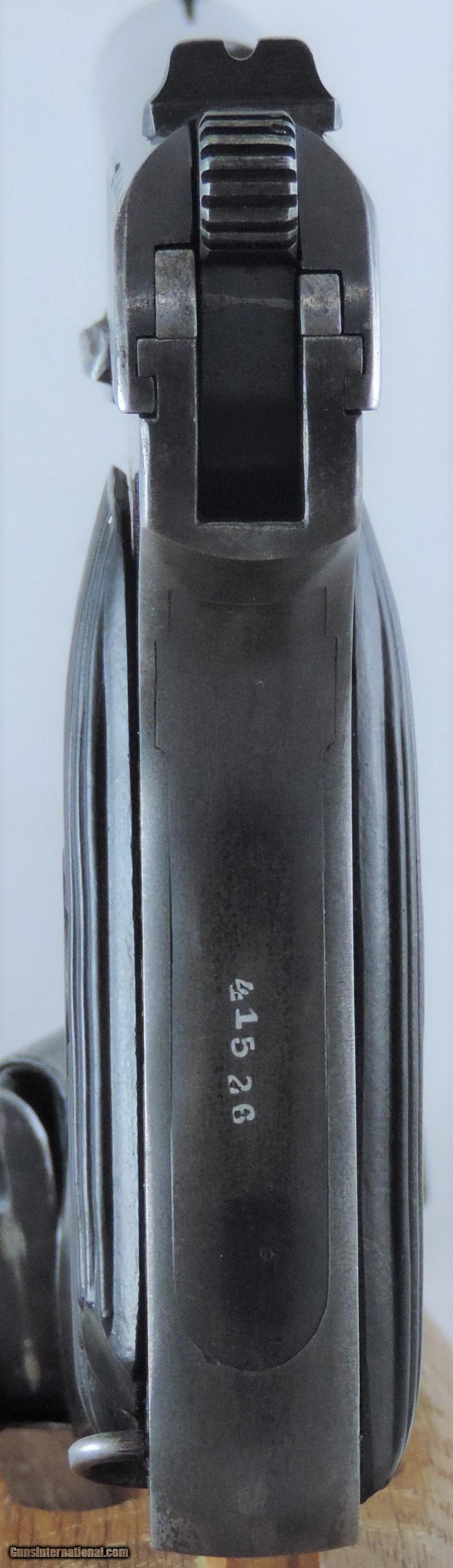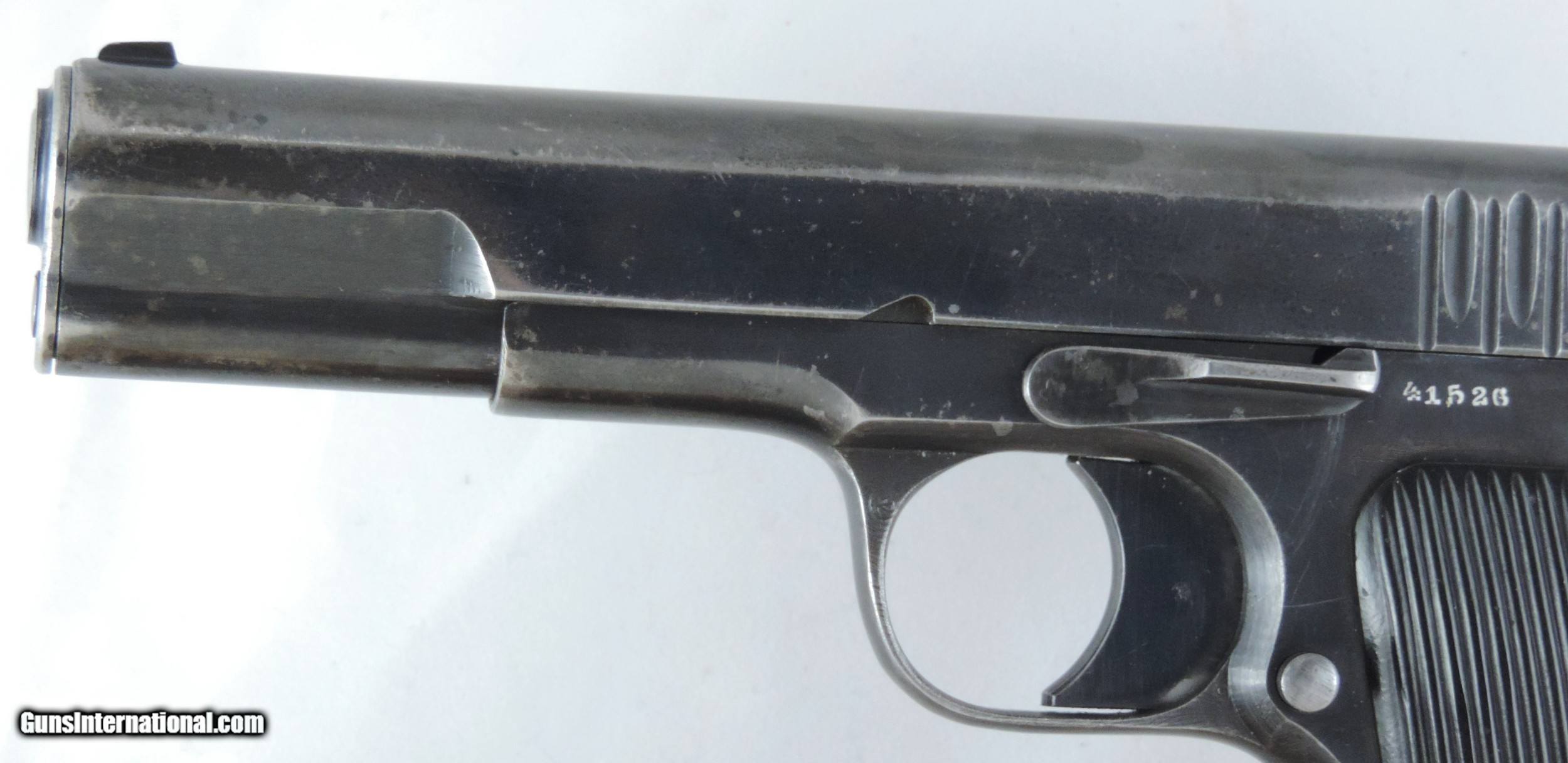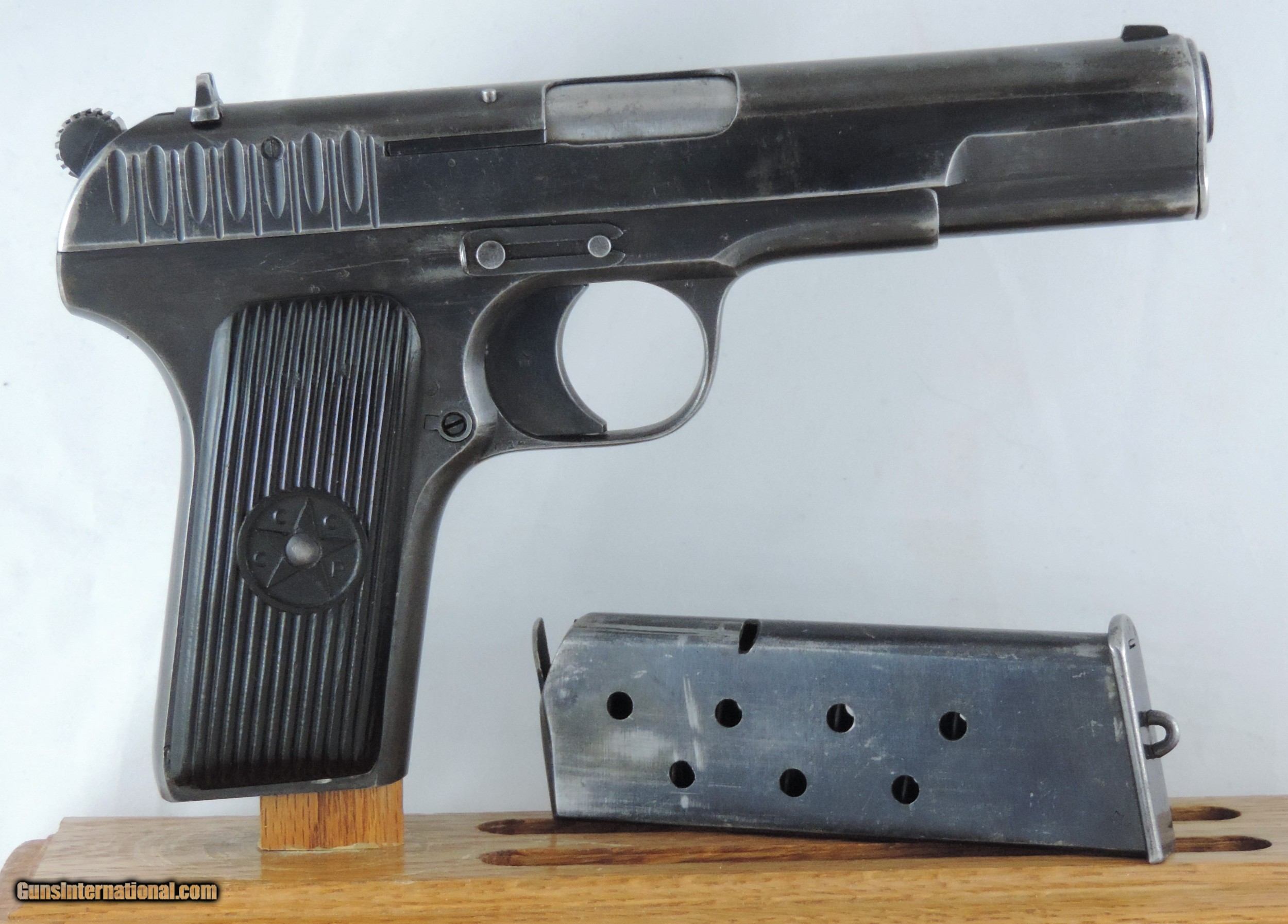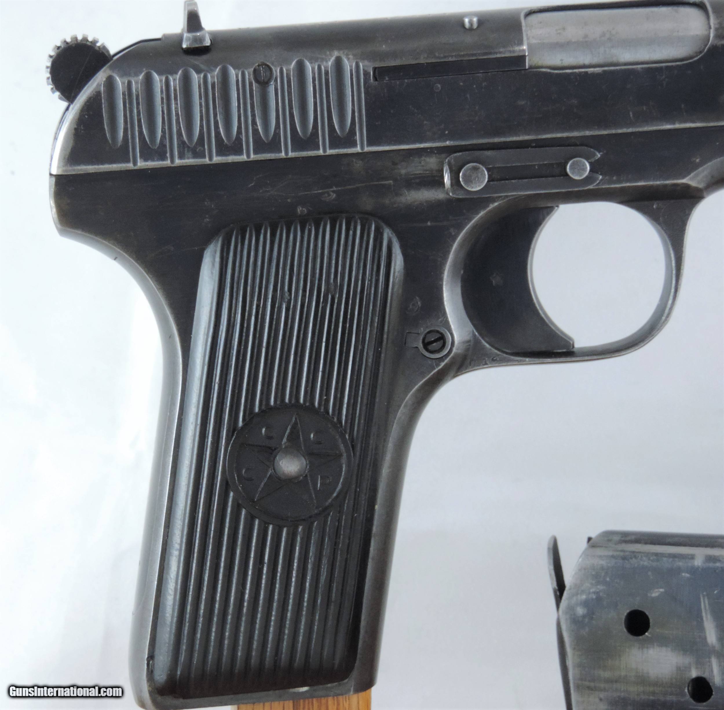 Description: Inv. 7663 Tokarev, (Tula Arsenal),TT 30, Cal. 7.62X25, Ser. 415XX, Dated 1934. Super condition, and very rare. Total production of the TT30 was 91,000 (TT 33 total production 1,700,000). The remaining original finish is at least 90+%. The only loss seems to be from some very slight fading and holster wear. There are no pits, rust spots or rub marks except for the usual one made by the slide release. The grip straps show no sign of graying. All parts match. The Bakelite grips are super showing no wear, chips or cracks. The slide rails, bolt face and feed ramp show little if any use. The bore is great, bright with super sharp rifling and touch of light scattered frost. Before and during the war it was probably an officer's "Rack Queen". It comes with one non matching TT 30 magazine. This very early first model TT30 has it all. The Conition isreally great for this 86 year old Russian warrior. It is a super find for the really critical investor/collector. Modestly priced at .....Shipped .....$3295.*** ***It comes with a "Purchase Satisfaction Guarantee". To purchase this firearm or if you want to request more information contact us at: Email ckguns[at]ymail[dot]com Phone 201-512-0002 Cell 201-575-6838 FAX 201-215-4759 We accept most major credit cards. Prices shown are Discounted 3% for Cash or Check. The buyer must be familiar with all the laws governing the purchase and the ownership of firearms in their own city and state. The Yankee Armorer, Inc is not responsible for any failure to comply with or observe these laws. The Yankee Armorer, Inc will only ship after full payment and receipt of all required documents. Shipping: Add $35.00 for handguns, $45.00 for long guns. New Jersey buyers are subject to a 7% sales tax. The Yankee Armorer, Inc offers a 3 day inspection period with full refund upon return of intact firearm and in the original condition. The Yankee Armorer, Inc offers a no interest lay away program - 25% down; 25% in 30 days; 25% in 60 days; and full payment in 90 days. Any violation of this policy is subject to restocking and forfeiture of all payments. Any variation from this policy must be agreed to in advance. Unshipped Cancelled sales are subject to a 20% restocking fee. Be advised that all firearms sold by The Yankee Armorer, Inc. or the Gun Exchange, LLC (SELLER) are sold as collector’s items. They have not been fired or tested for safety and must be examined by a license gunsmith prior to use. By purchasing any item from the (SELLER), you are agreeing to hold the (SELLER) free from any damages or lawsuits of any nature. Any item left for transfer or storage will be charged to $25.00 per month, per item from the day of its receipt. Any variation from this policy must be agreed to in advance. Store hours 10:00 am to 5:00 pm Tuesday -Saturday. It's always best to call for appointment. Store 201-512-0002, cell 201-575-6838. SOLD |