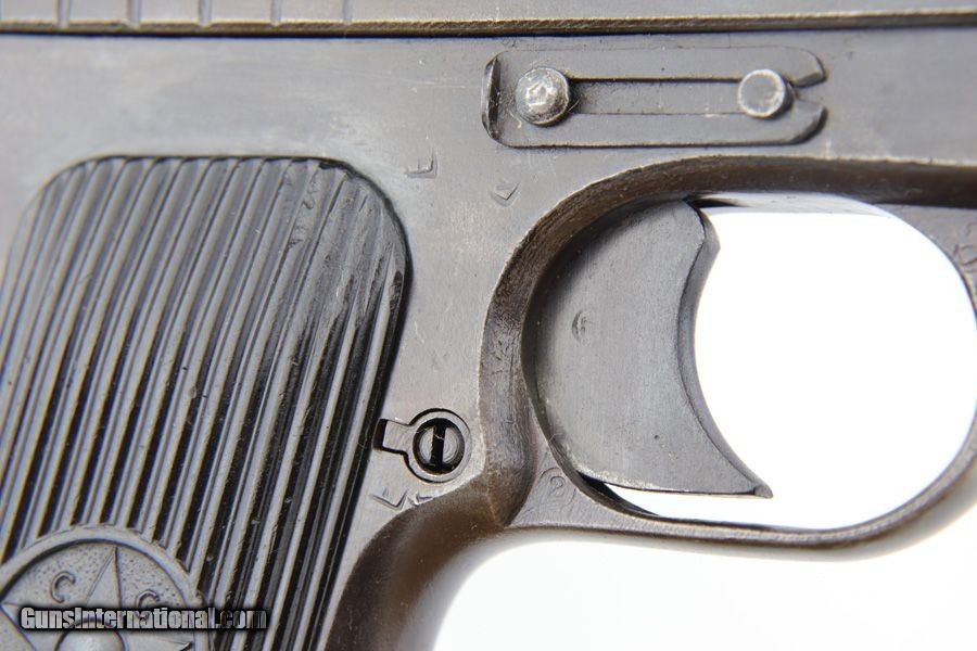 Description: This is a very scarce, 1945 production Russian Tokarev TT-33 pistol in very nice 85-90% original condition. Late-war TT33 pistols were finished with a rougher wartime blue finish and this one is all original with minor actual bluing loss, but browning to the finish throughout. It is an all matching gun, including the hammer group, barrel, slide and frame. Both mags are non matching. Made at the Izhevsk factory, the gun probably saw the battle of Berlin before ending up in the hands of an American GI, who brought it home. Comes with an all original 1937 dated and maker marked holster. Very nice grips. Bore is shiny with strong rifling, showing only minor frost. Guaranteed authentic and original. SOLD Curio/Relic: Yes Manufacturer: Tokarev Model: TT-33 Serial Number: E5660 Caliber Info: 7.62x25mm Bore: 7.5/10 Condition: 85-90% Manufacture Date: 1945 |