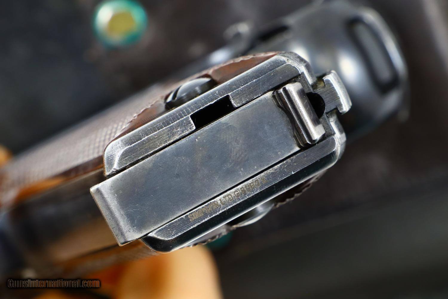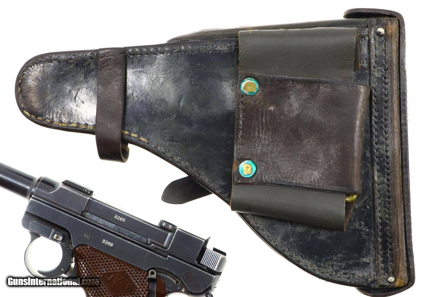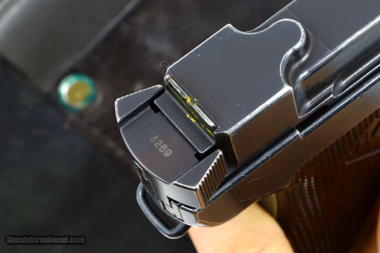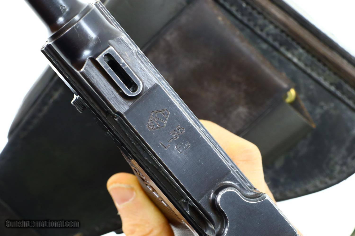 Description: Rarely offered first variation Finnish military Lahti L-35 in 9mmP, SA marked, with 4.75” barrel having drift adjustable front sight and fixed rear sight. “VKT” and “L-35” marked on top of slide, whose loaded indicator housing is missing the small parts, and that has the prominent rounded protrusion in front of rear sight. Full matching serial number on left side of slide, left side of frame and on top of bolt. Correct brown mottled plastic grips each molded with the VKT logo and secured with a single screw. Correct magazine with an in-the-white body and blued floorplate. Complete with SA marked holster, back surface equipped to hold a flat board stock, correct spare magazine, SA marked takedown tool, and SA marked cleaning rod. Synopsis: Finnish Military VKT L-35 Lahti pistol, first series, SA markings, Complete Rig Condition: Approximately 90% original finish, which is extremely nice for this type of pistol, with typical high point holster wear and thinning of the grip straps. Excellent grips with no cracks or chips. Mirror bore. Perfect manual mechanics. Comparable condition accessories. A super rare and complete Finnish military rig, especially nice in having so many components SA marked, that could be easily improved by finding/replacing the small parts in the loaded indicator housing. ~~Insured shipping fee of $155; most packages shipped using FedEx 2nd Day.~~ SOLD Antique: Yes Manufacturer: VKT Serial Number: 3269 Caliber Info: 9mmP |