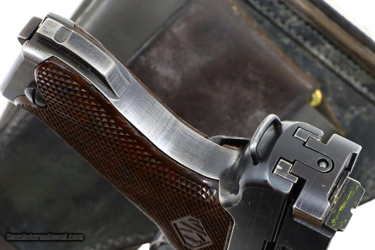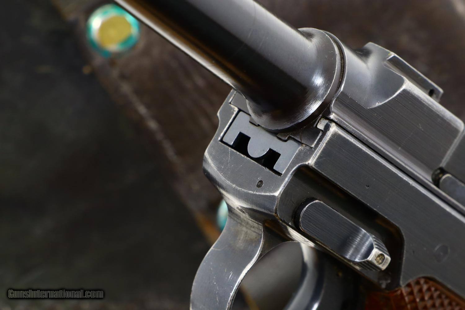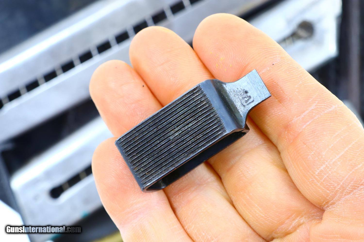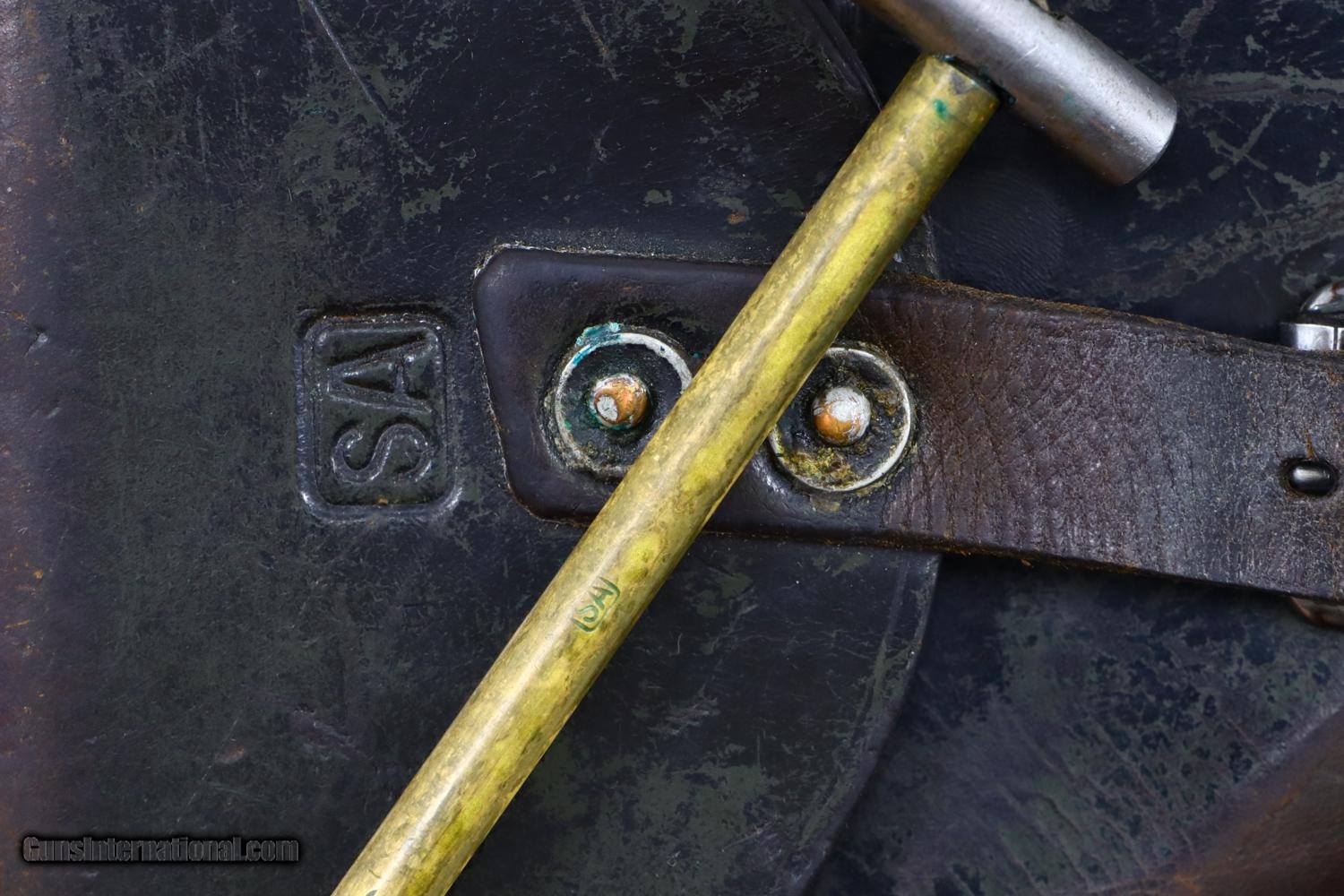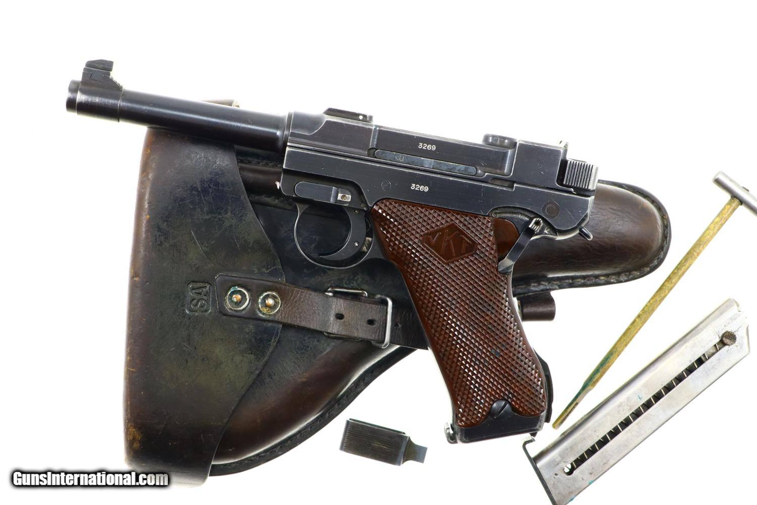 Description: Rarely offered first variation Finnish military Lahti L-35 in 9mmP, SA marked, with 4.75” barrel having drift adjustable front sight and fixed rear sight. “VKT” and “L-35” marked on top of slide, whose loaded indicator housing is missing the small parts, and that has the prominent rounded protrusion in front of rear sight. Full matching serial number on left side of slide, left side of frame and on top of bolt. Correct brown mottled plastic grips each molded with the VKT logo and secured with a single screw. Correct magazine with an in-the-white body and blued floorplate. Complete with SA marked holster, back surface equipped to hold a flat board stock, correct spare magazine, SA marked takedown tool, and SA marked cleaning rod. Synopsis: Finnish Military VKT L-35 Lahti pistol, first series, SA markings, Complete Rig Condition: Approximately 90% original finish, which is extremely nice for this type of pistol, with typical high point holster wear and thinning of the grip straps. Excellent grips with no cracks or chips. Mirror bore. Perfect manual mechanics. Comparable condition accessories. A super rare and complete Finnish military rig, especially nice in having so many components SA marked, that could be easily improved by finding/replacing the small parts in the loaded indicator housing. ~~Insured shipping fee of $155; most packages shipped using FedEx 2nd Day.~~ SOLD Antique: Yes Manufacturer: VKT Serial Number: 3269 Caliber Info: 9mmP |