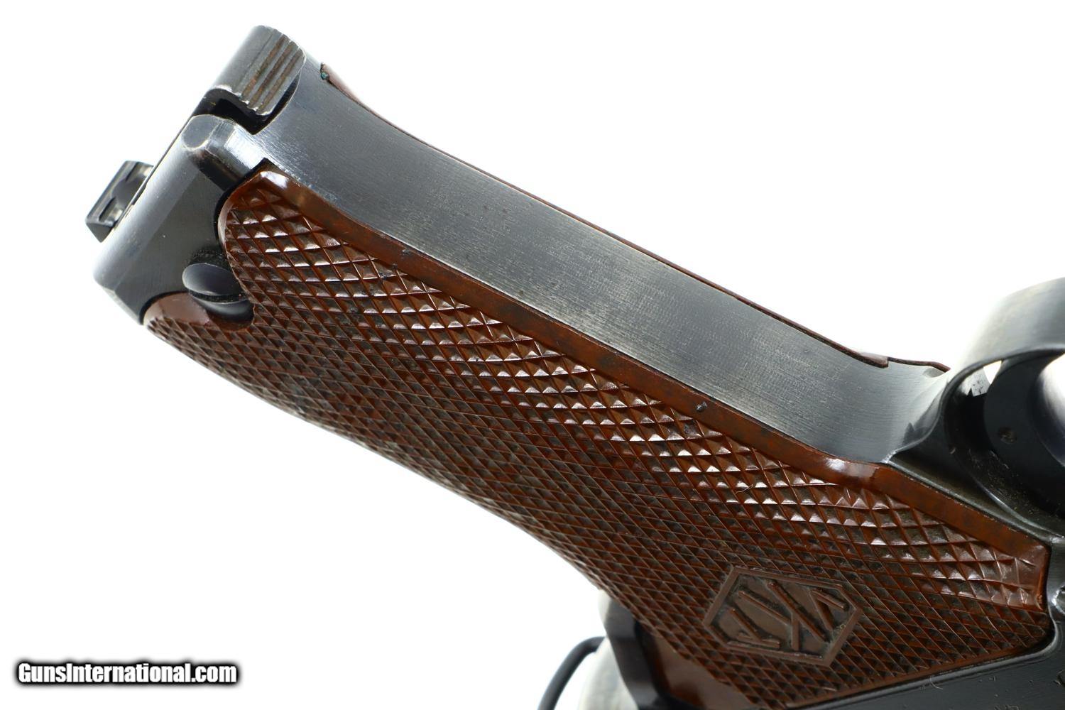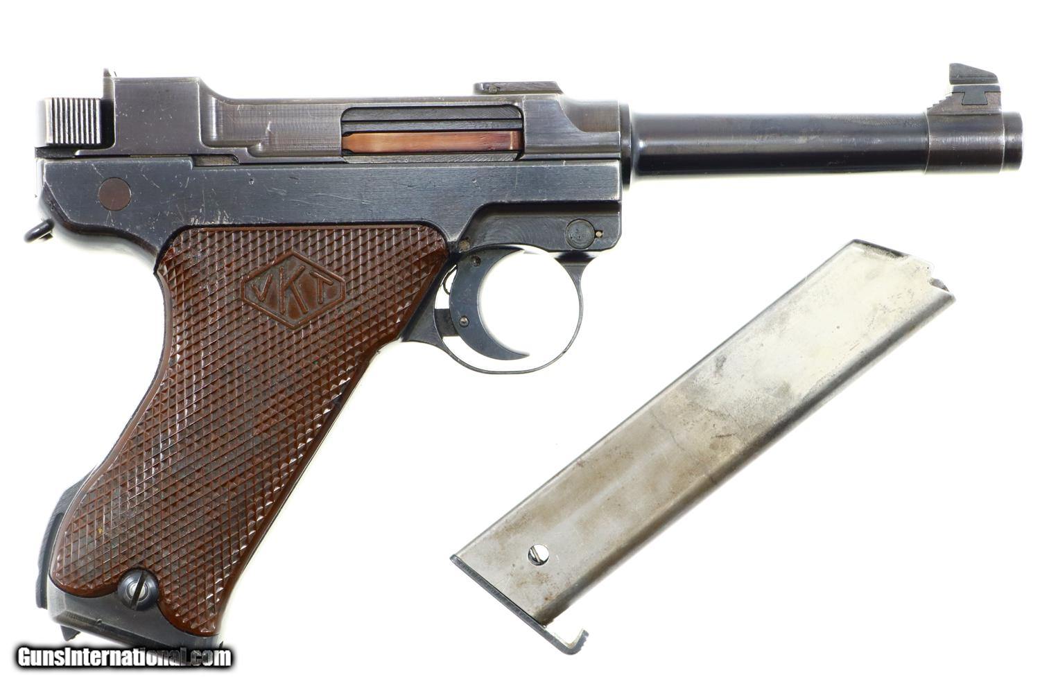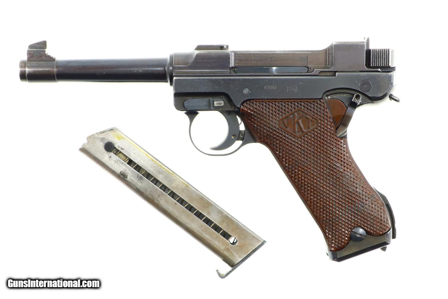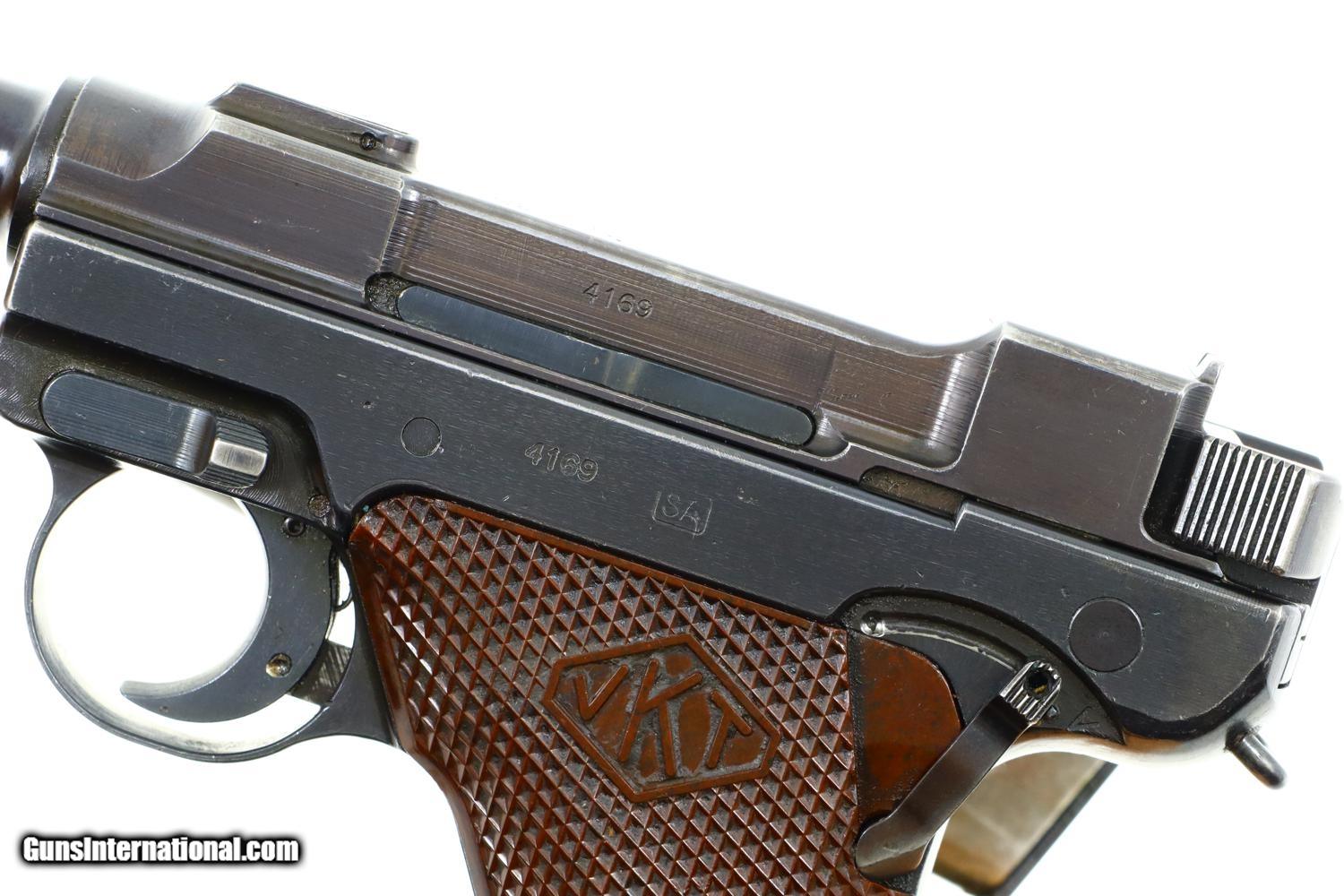 Description: One of the scarcest Finnish military Lahti L-35 pistols, production limited to approx. 1000 guns in the serial range 3700-4700, made between 1941-1942, that reflected a refinement in the slide design, eliminating several structural parts that were deemed unneccessary. This entire group of pistols have a 4.7" barrel whose barrel band has a serrated ramp. Dovetailed front sight and fixed rear sight. Early design loaded indicator. Top of slide with the usual logoed "VKT/L-35". Full serial number on left side of barrel extension, frame, and bolt. Electropenciled "E" on trigger. Chocolate brown plastic grips molded with VKT logo within a field of reversed checkering. Correct magazine with blued base and in-the-white body. Complete with boxed "SA" on left side of frame. Synopsis: Scarce Finnish military VKT L-35 Lahti pistol, second series, WWII Condition: Approximately 90% original finish with most of the wear related to the thinning of the grip straps. Excellent grips with no cracks or chips. Mirror bore. Perfect manual mechanics. A super rare, Finnish military Lahti pistol with the "SA" on the left frame, very seldom offered for sale and well suited for the most advanced Finnish military or general small arms collector. ~~Insured shipping fee of $75; most packages shipped using FedEx 2nd Day.~~ SOLD Manufacturer: VKT Serial Number: 4169 Caliber Info: 9mmP |