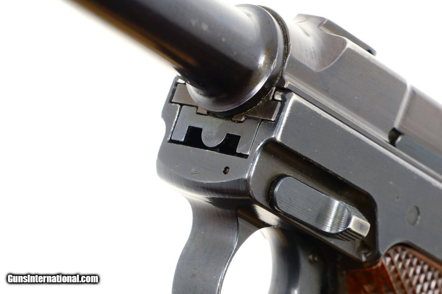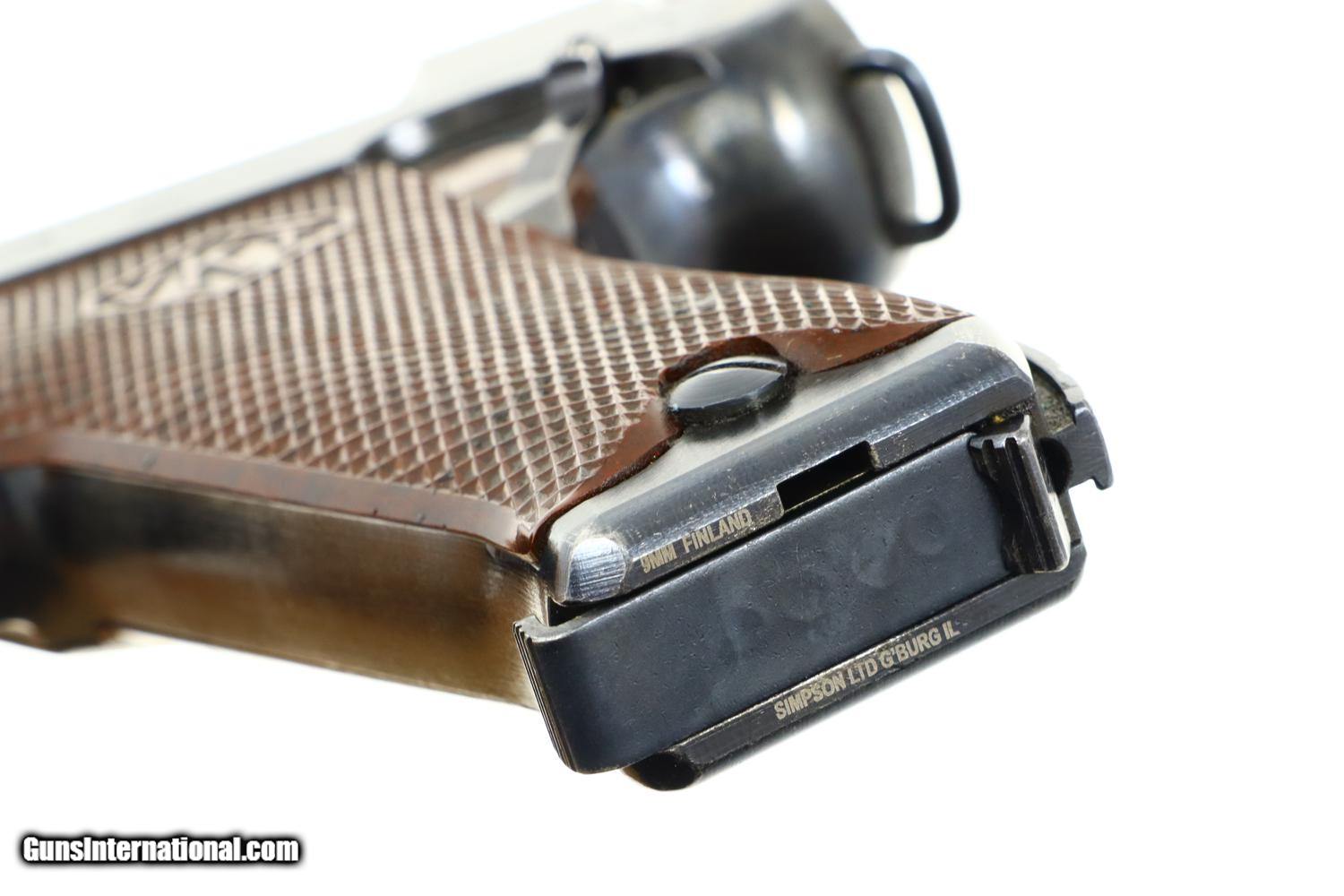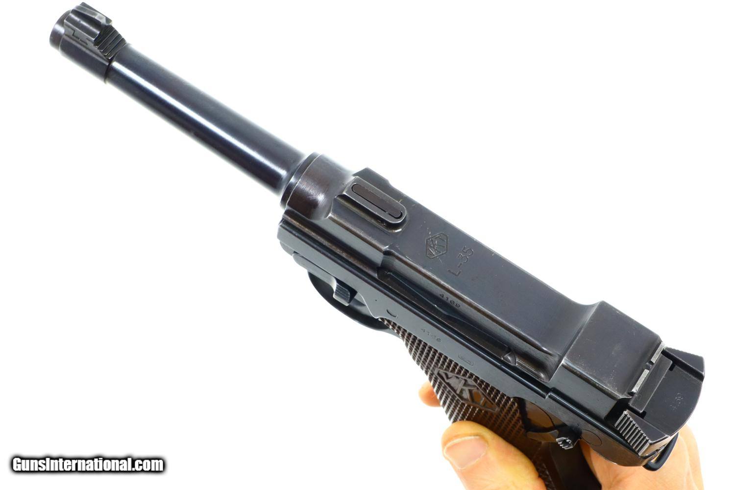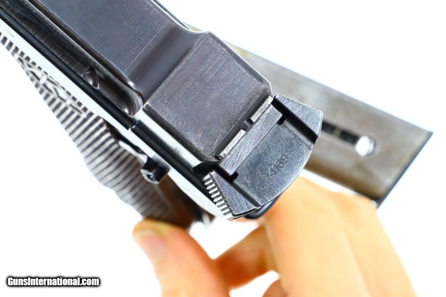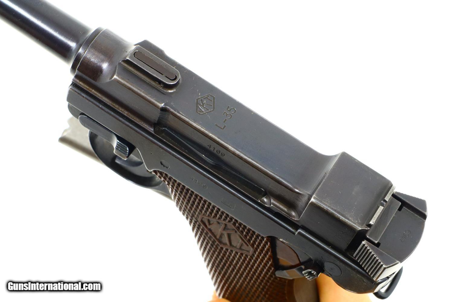 Description: One of the scarcest Finnish military Lahti L-35 pistols, production limited to approx. 1000 guns in the serial range 3700-4700, made between 1941-1942, that reflected a refinement in the slide design, eliminating several structural parts that were deemed unneccessary. This entire group of pistols have a 4.7" barrel whose barrel band has a serrated ramp. Dovetailed front sight and fixed rear sight. Early design loaded indicator. Top of slide with the usual logoed "VKT/L-35". Full serial number on left side of barrel extension, frame, and bolt. Electropenciled "E" on trigger. Chocolate brown plastic grips molded with VKT logo within a field of reversed checkering. Correct magazine with blued base and in-the-white body. Complete with boxed "SA" on left side of frame. Synopsis: Scarce Finnish military VKT L-35 Lahti pistol, second series, WWII Condition: Approximately 90% original finish with most of the wear related to the thinning of the grip straps. Excellent grips with no cracks or chips. Mirror bore. Perfect manual mechanics. A super rare, Finnish military Lahti pistol with the "SA" on the left frame, very seldom offered for sale and well suited for the most advanced Finnish military or general small arms collector. ~~Insured shipping fee of $75; most packages shipped using FedEx 2nd Day.~~ SOLD Manufacturer: VKT Serial Number: 4169 Caliber Info: 9mmP |