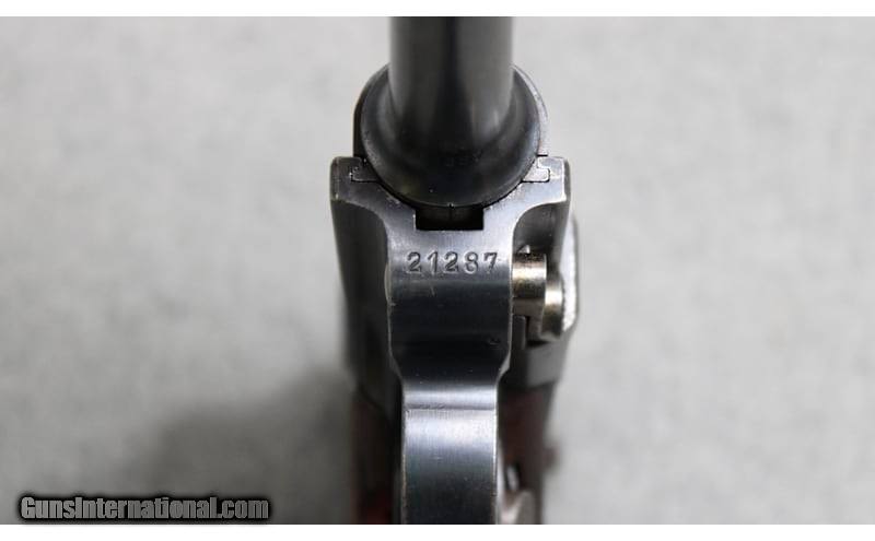 Description: Waffenfabrik Bern Model 1906 Luger semiautomatic pistol chambered in 7.65×21mm Parabellum (.30 Luger). Swiss Military issue with an estimated 1924 to 1929 year of manufacture. Swiss "Cross" and "Cross / M" proofs on the chamber, and a Birmingham proof on the underside of the barrel that dates to 1972. Comes in a brown leather Swiss military pattern holster with shoulder strap and extra magazine. .30 Luger/7.65x21 Parabellum Curio/Relic: Yes Barrels: 4.75 inch Item Location: Fort Worth, TX Price: $2,499.99 Contact Seller |