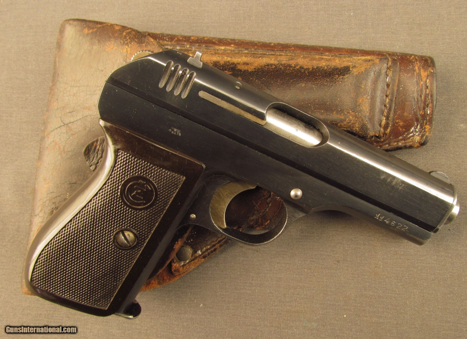 Description: Serial #114622, 7.65mm (.32 ACP), 3 1/2” barrel with an excellent, bright bore. This occupation-made pistol has matching numbers on the frame, slide, and sideplate with a small “WaA76” Waffenamt marking on the right side above the grip, and a national eagle stamp on the breech of the barrel. The metal retains about 90% of the original blue finish with the balance worn to a bright gray patina, most noticeably at the front of the slide near the muzzle. The hammer, trigger, and extractor have most of the original straw color on protected areas with some lightly mottled gray metal on the balance. The one-piece CZ resin grip has scattered small scratches and minor surface blemishes, but doesn't have any chips or cracks. A single magazine is included and the pistol is housed in an original, much-used German holster that has extensive crazing and flaking throughout. This is a fine example of a German issued Czech pistol and would make a nice representative example for a collection. FFL or C&R SOLD Curio/Relic: Yes Manufacturer: CZ Model: 1927 Serial Number: 114622 Caliber Info: 7.65mm Gauge Info: 7.65mm |
