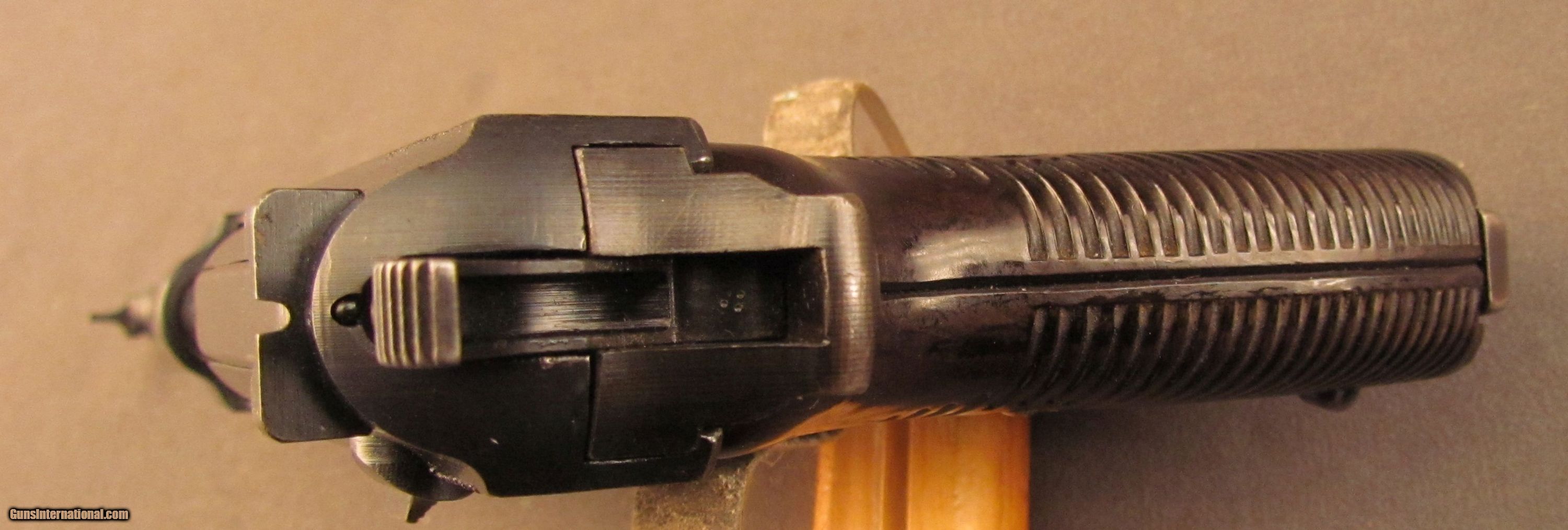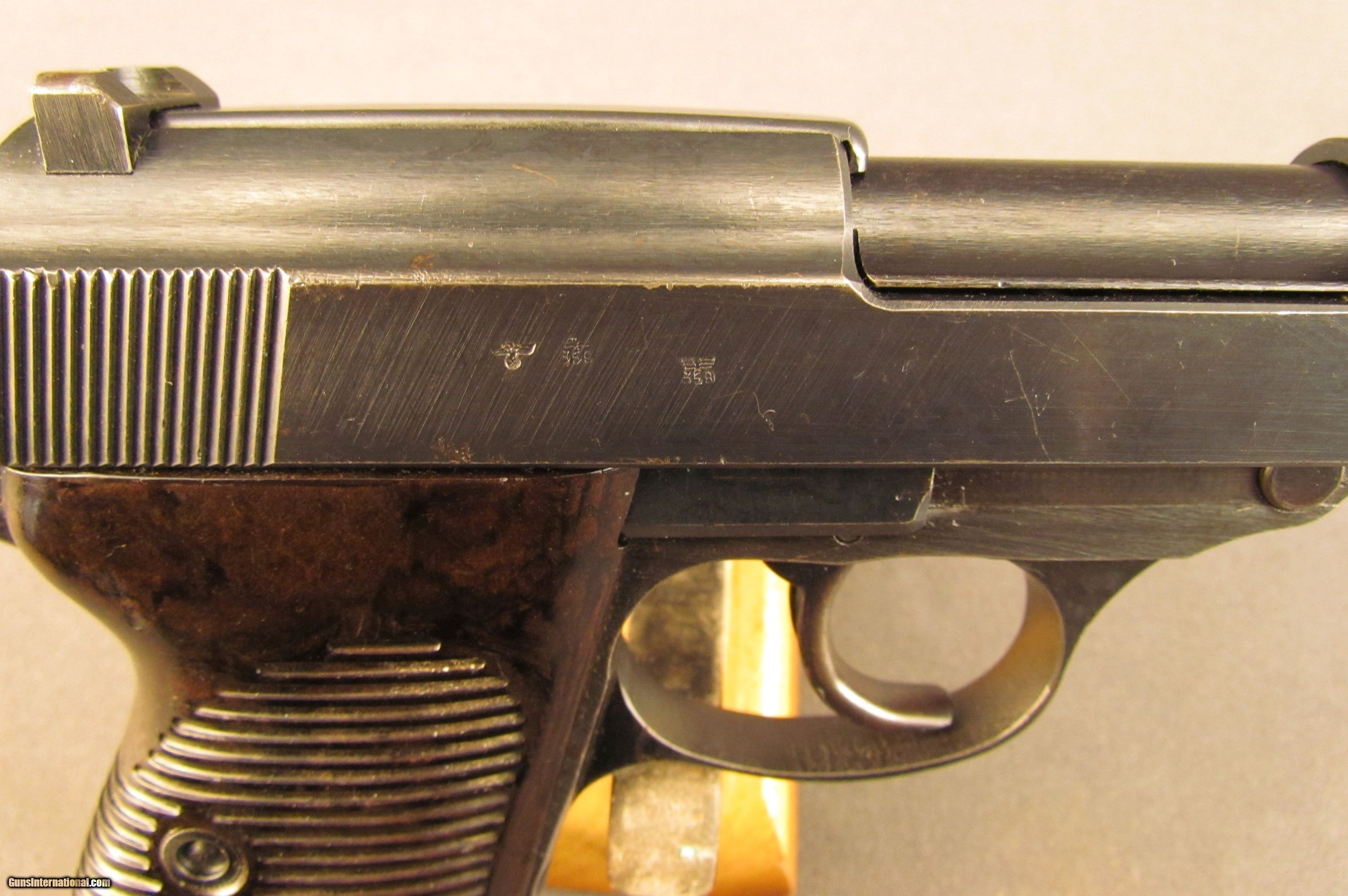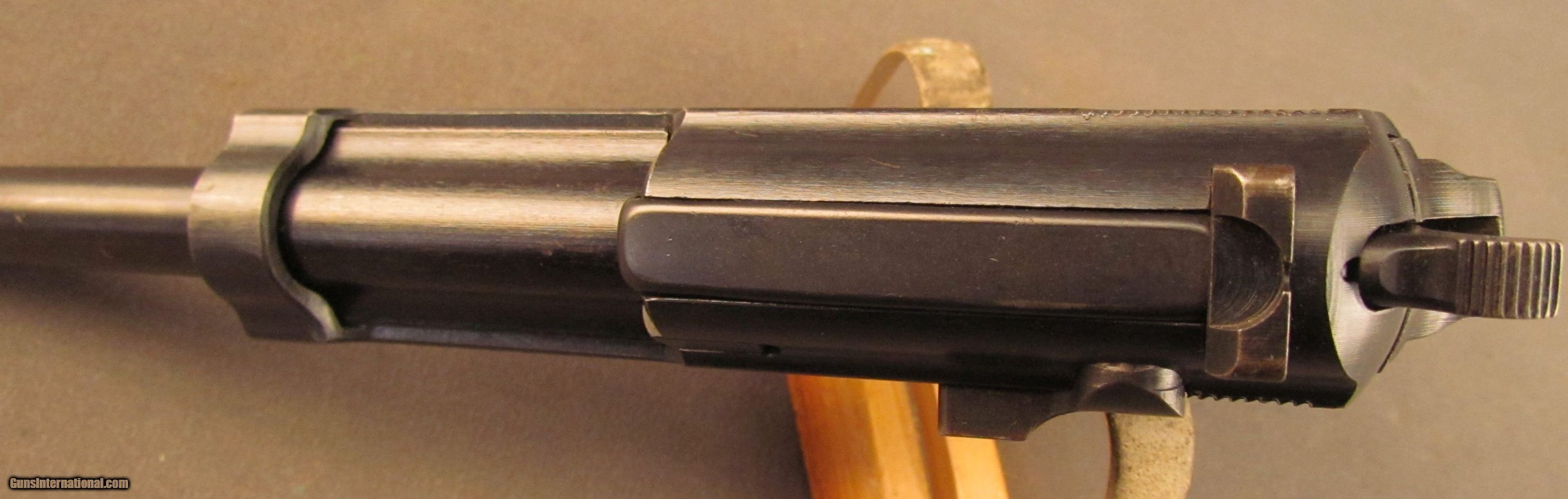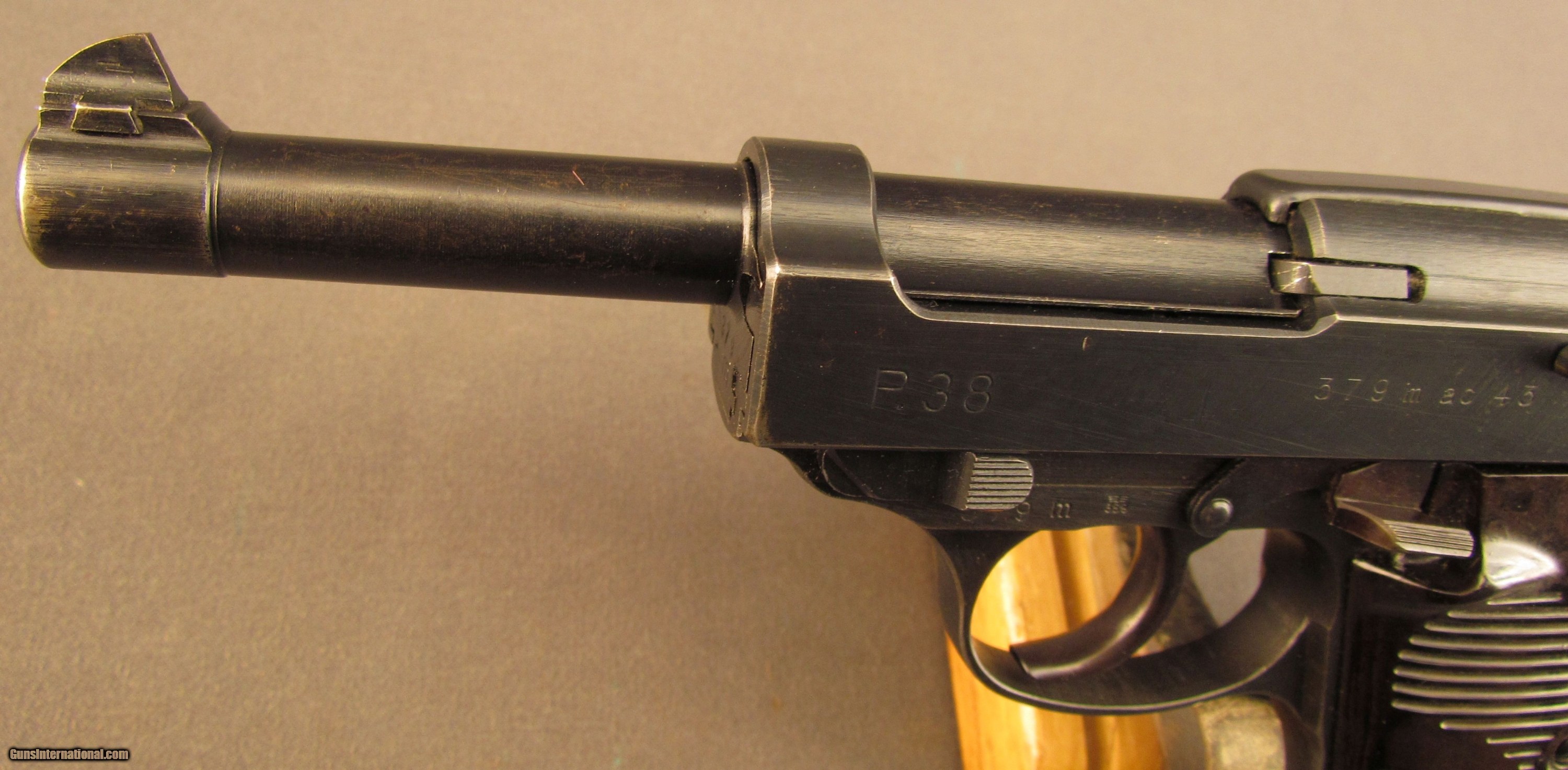 Description: Serial #378m, 9mm Para., 5” barrel with a fine, bright bore that has some mild freckling within the grooves. This is an “ac/43” coded pistol that has matching numbers on the frame, slide, barrel, and locking block with the metal retaining about 95-97% of the original blue that has faded slightly at the muzzle and projecting edges. The pistol is mechanically excellent and functions flawlessly, while the mottled dark brown phenolic resin grips are fine shape with only minor wear and negligible surface scratches presenton either side. The pistol comes with a single Waffenamt marked magazine which matches the condition of the pistol. This is a nice wartime P.38 that looks good and is in fine-near excellent overall condition. FFL or C&R SOLD Curio/Relic: Yes Manufacturer: German Model: P.38 Serial Number: 378m Caliber Info: 9mm Gauge Info: 9mm |
