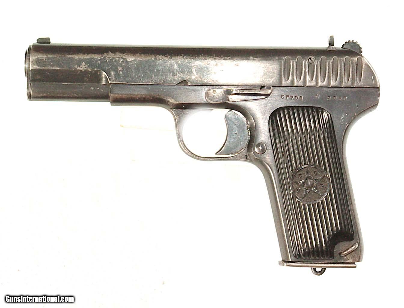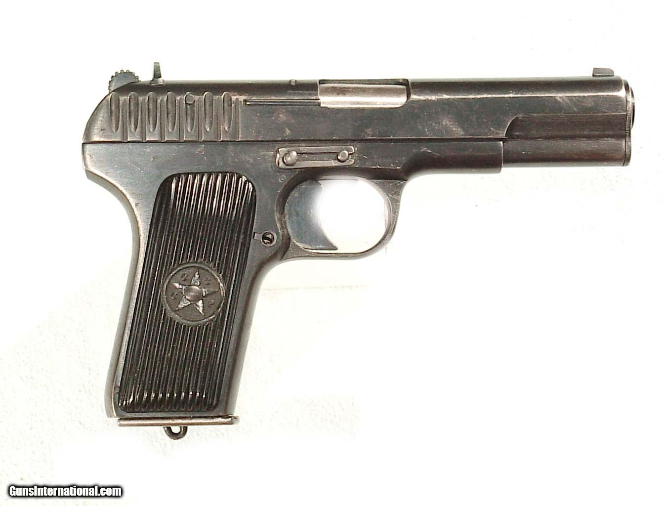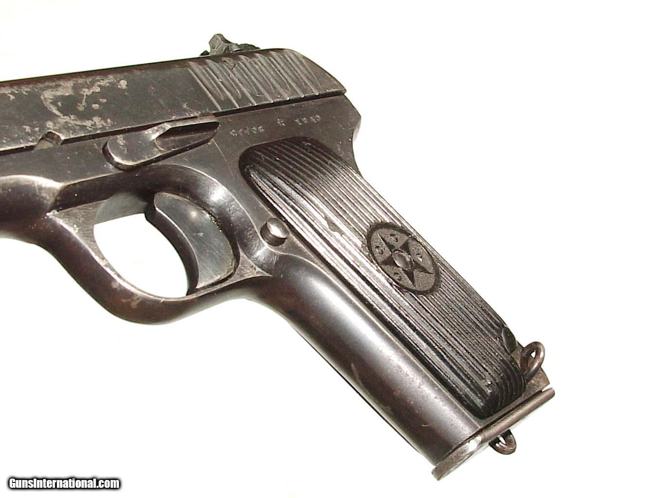 Description: 7.62x25 mm, 4.6" barrel finished blue with black composite grips bearing the Russian star. In super original condition retaining considerable amouts of the blue Excellent grips and minty bore. SOLD Curio/Relic: Yes |
