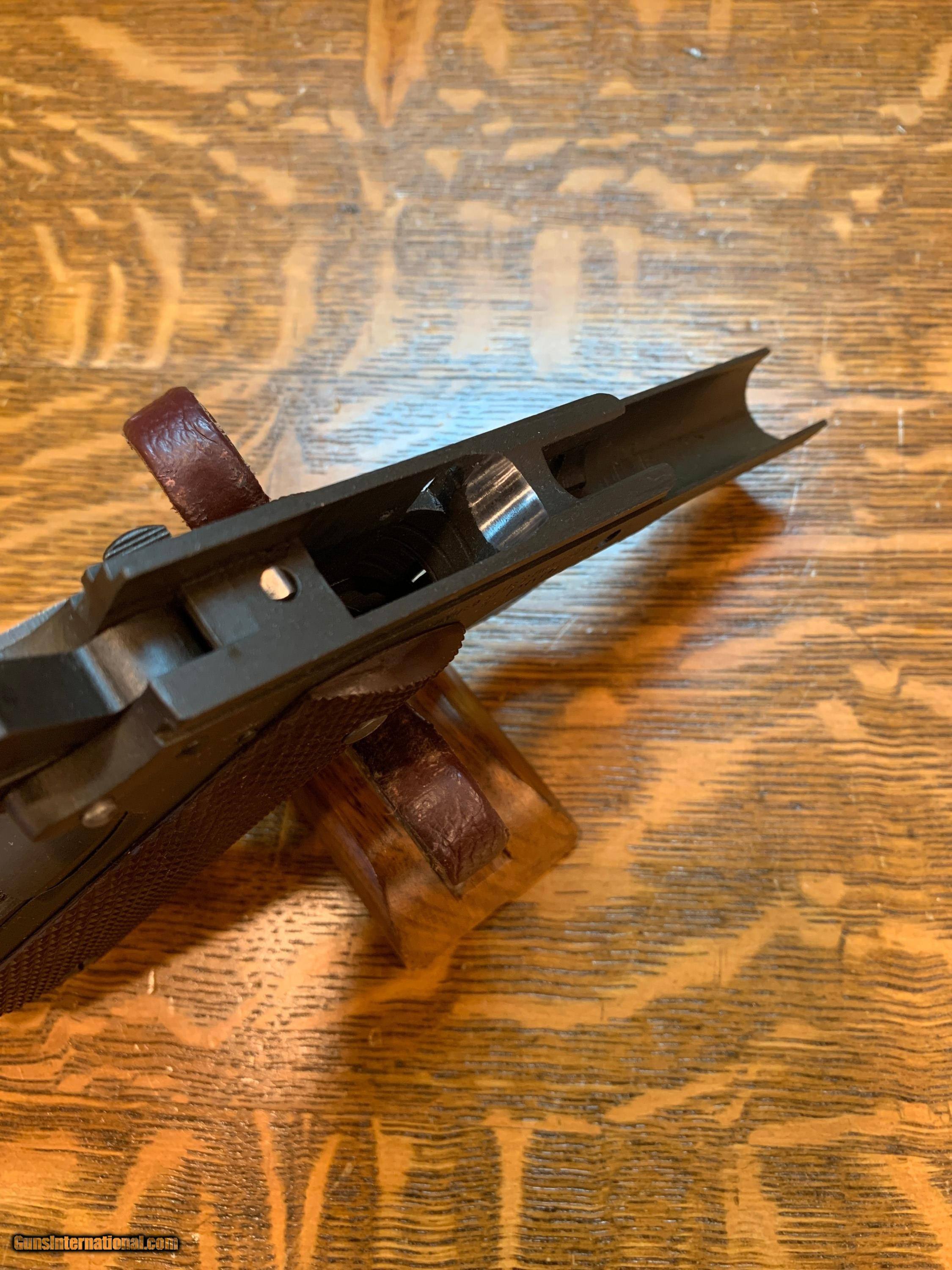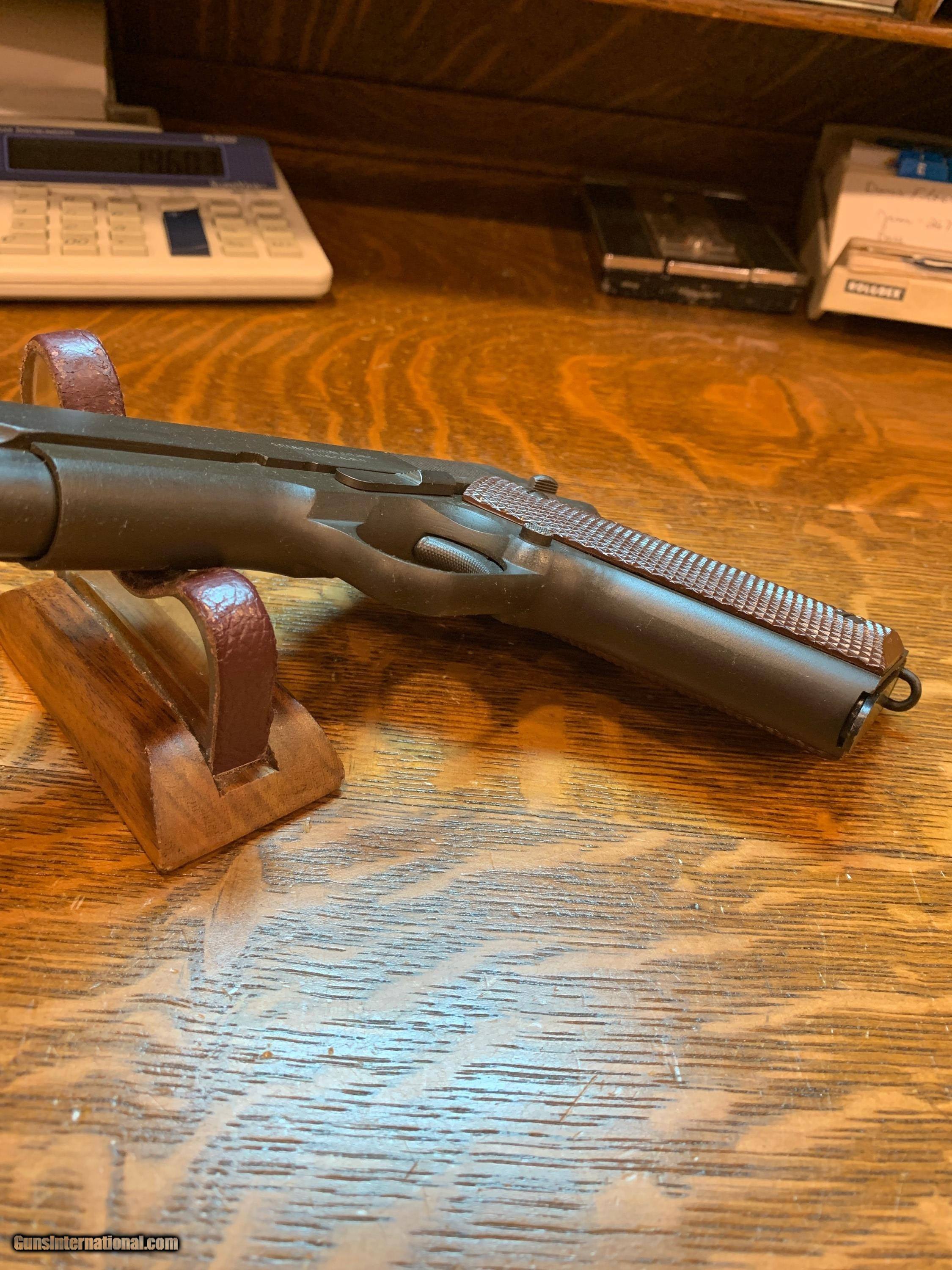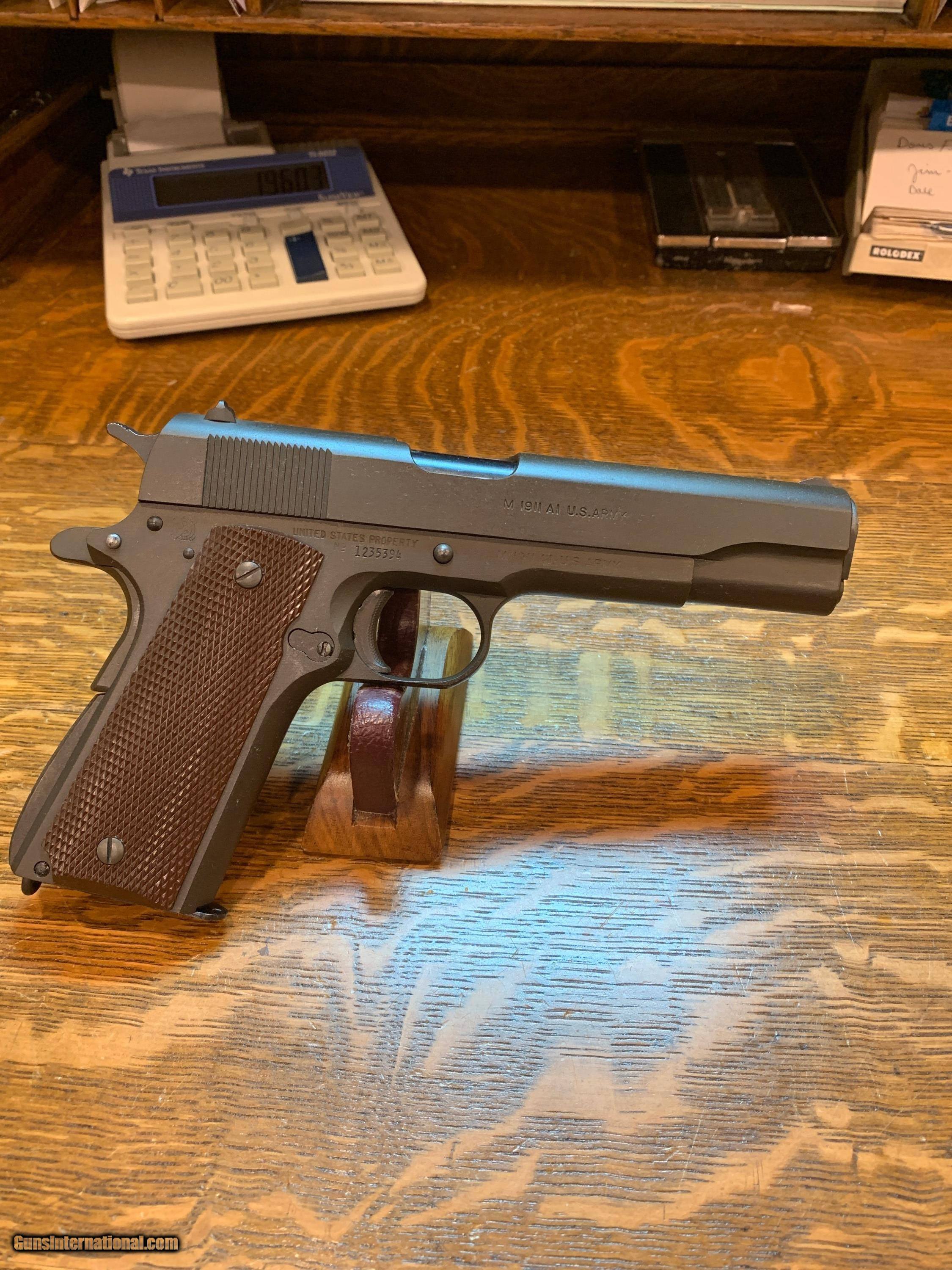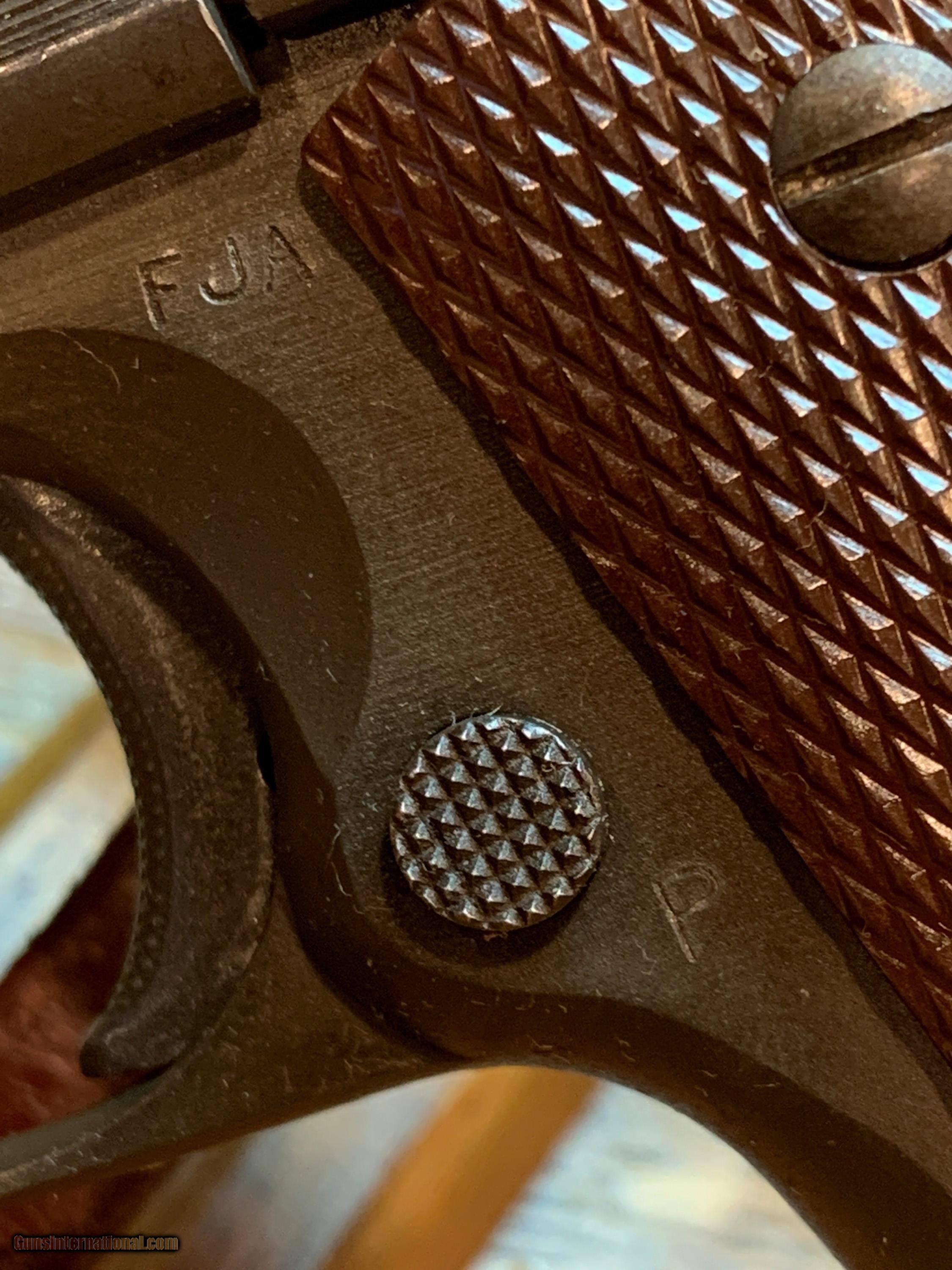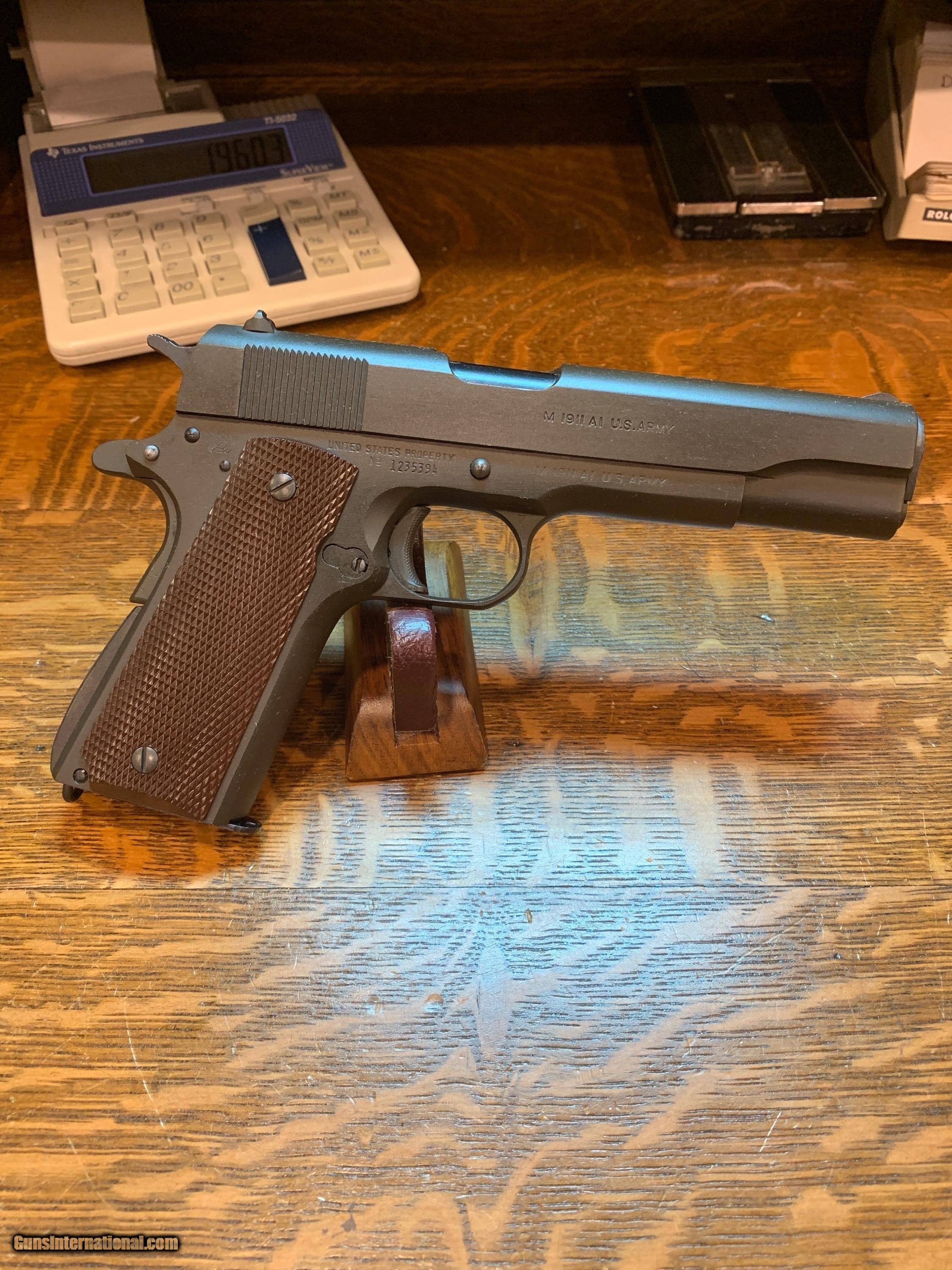 Description: Mint original 1911A1 produced by Ithaca Gun Company in late 1943 or very early 1944. Serial No.1235394. This pistol is as good as it gets for one of these.STUNNING! Everything is correct and 100% ORIGINAL. Action is fine. Flannery barrel is mint. There were two serial ranges that Ithaca used slides with "M 1911 A1 U.S.ARMY" stamped on the slide right from the factory and this pistol is in the second range. Pictures show alot of lint from my oil rag. Please call 973-214-3407 with questions. FFL Please SOLD |