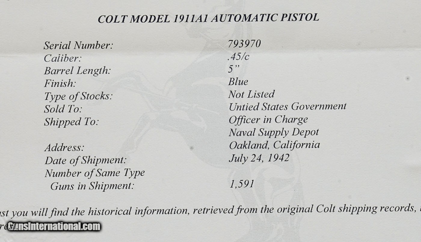 1942 Colt 1911A1 Shipped to US Navy in Oakland CA