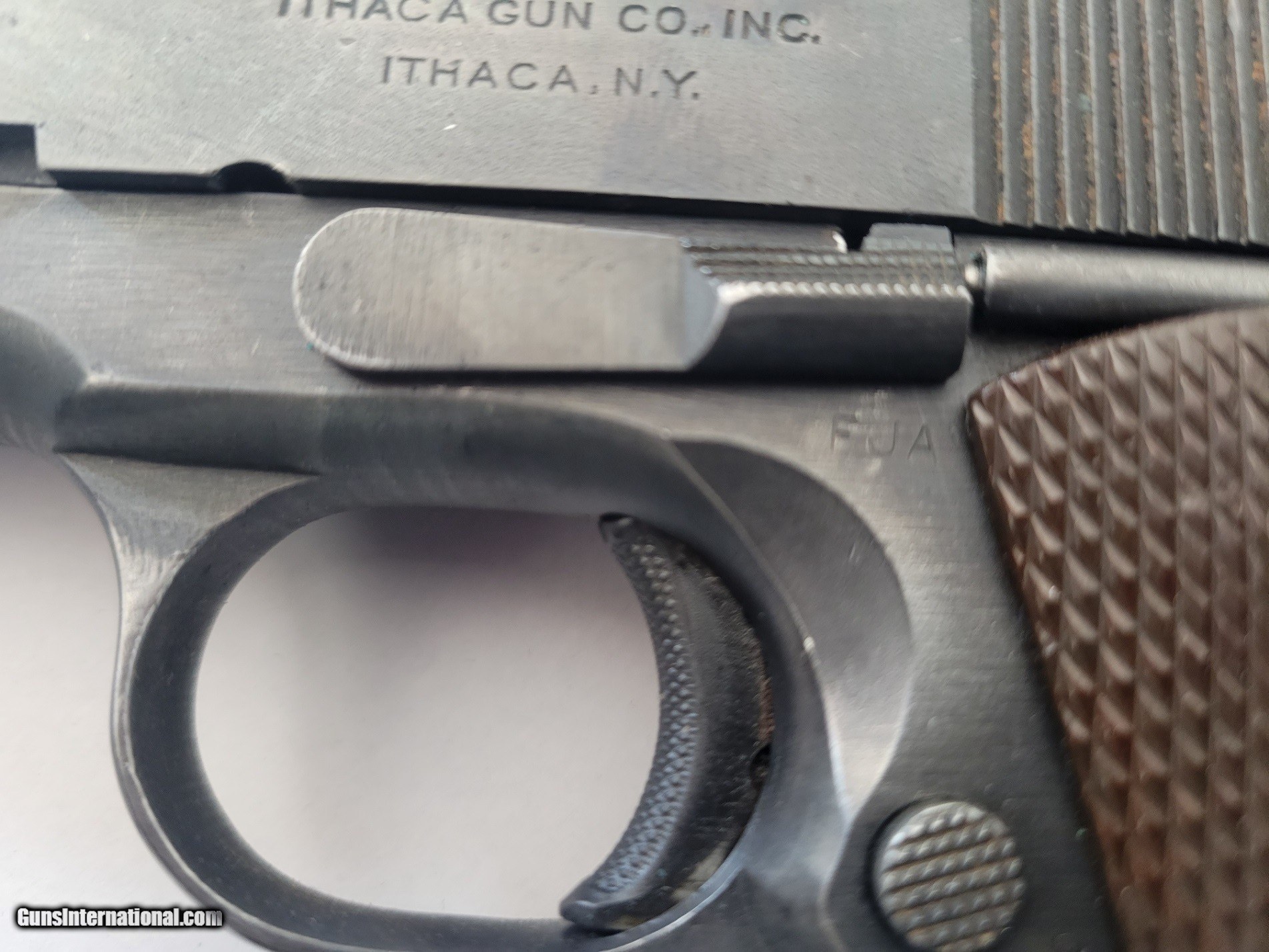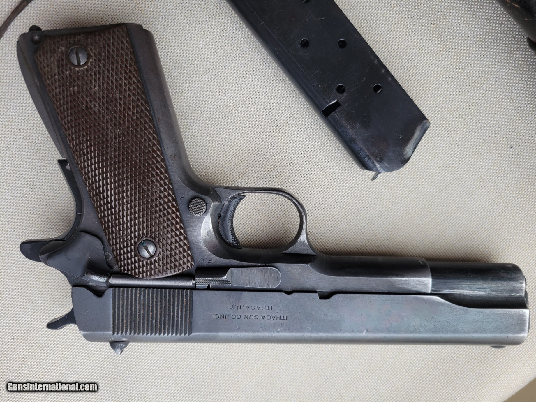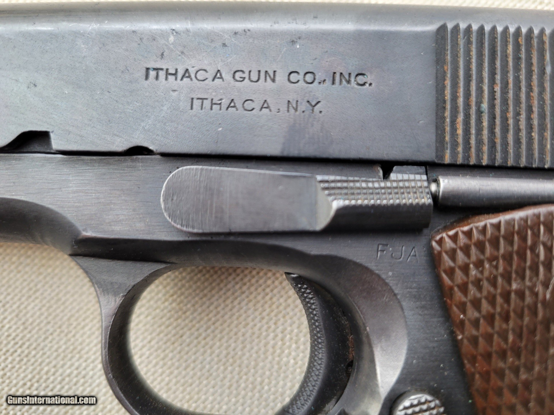Description: M1911A1 is a single-action, semi-automatic, magazine-fed, recoil-operated pistol chambered for the .45 ACP cartridge. Ithaca Gun Company of New York. Type: 1911A1 Maker: Ithaca Caliber: N/A Condition: 92-93% Bore: 9/10 Year: 1943 Close-up of ordnance inspectors mark "FJA". This is the mark of Col. Frank J. Atwood. Additionally has proof "P" on barrell at link. The frame is a 1942 Remington Rand 2nd variant. Slide is Ithaca. The grips are late Keyes Fibre grips and should be the early style. Includes original US Army holster and one clip SOLD Curio/Relic: Yes Handgun Caliber: .45 ACP (.45 Auto) Manufacturer: Ithica Model: A1911A1 Serial Number: 936713 Bore: 9/10 Condition: Great Metal Condition: Great Wood Condition: Great Bore Condition: Bright Action: Semi-Auto Manufacture Date: 1943 |
