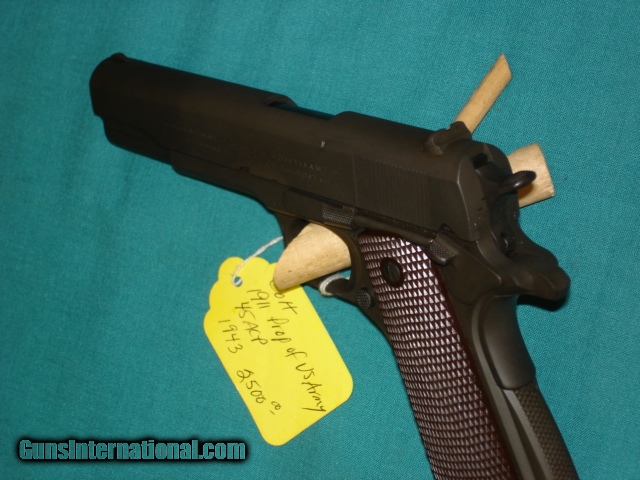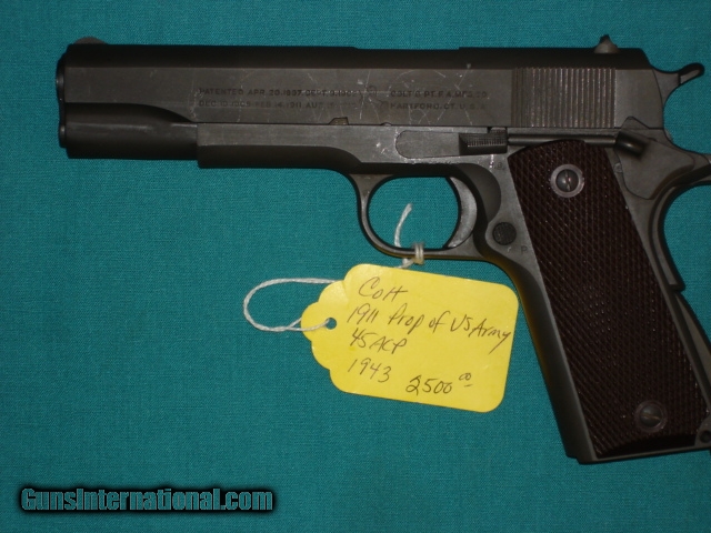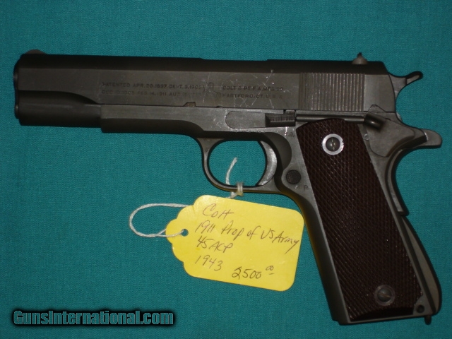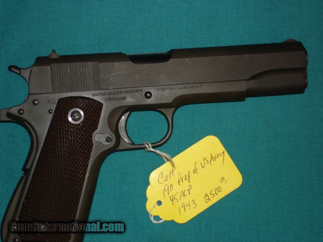 Description: Colt 1911 Property of U.S.Army. Manufactured in 1943. Very Good condition. Some slight marks around take-down lever. Serial nos. 936184. SOLD Curio/Relic: Yes |