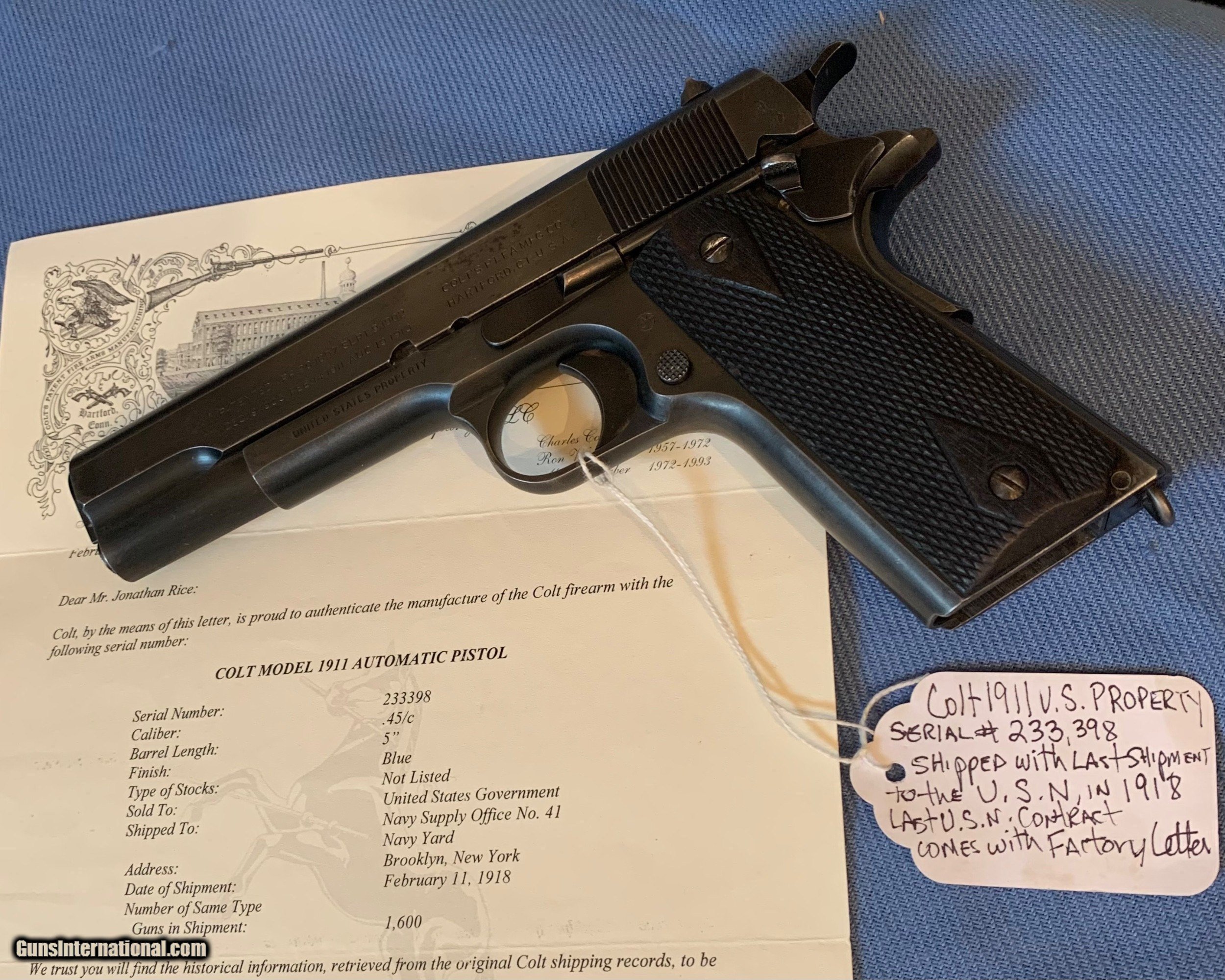 COLT 1911 U.S. NAVY CONTRACT SHIPPED FEB. 11, 1918 - ONLY 1600 GUNS SHIPPED IN THIS LAST WW1 CONTRACT TO THE U.S.N.