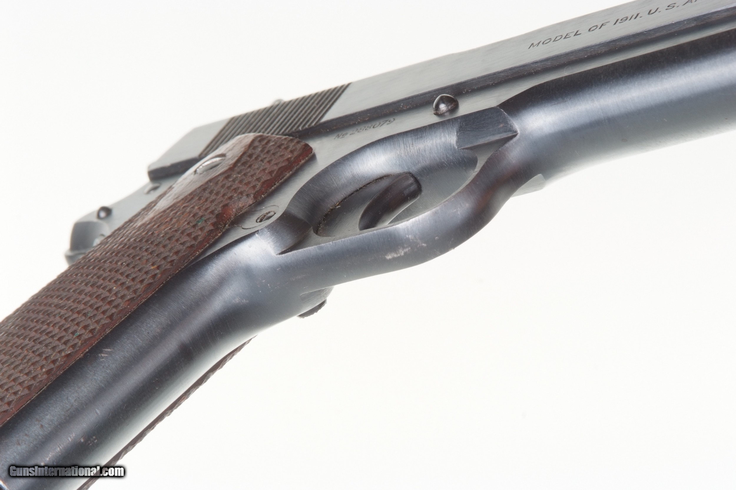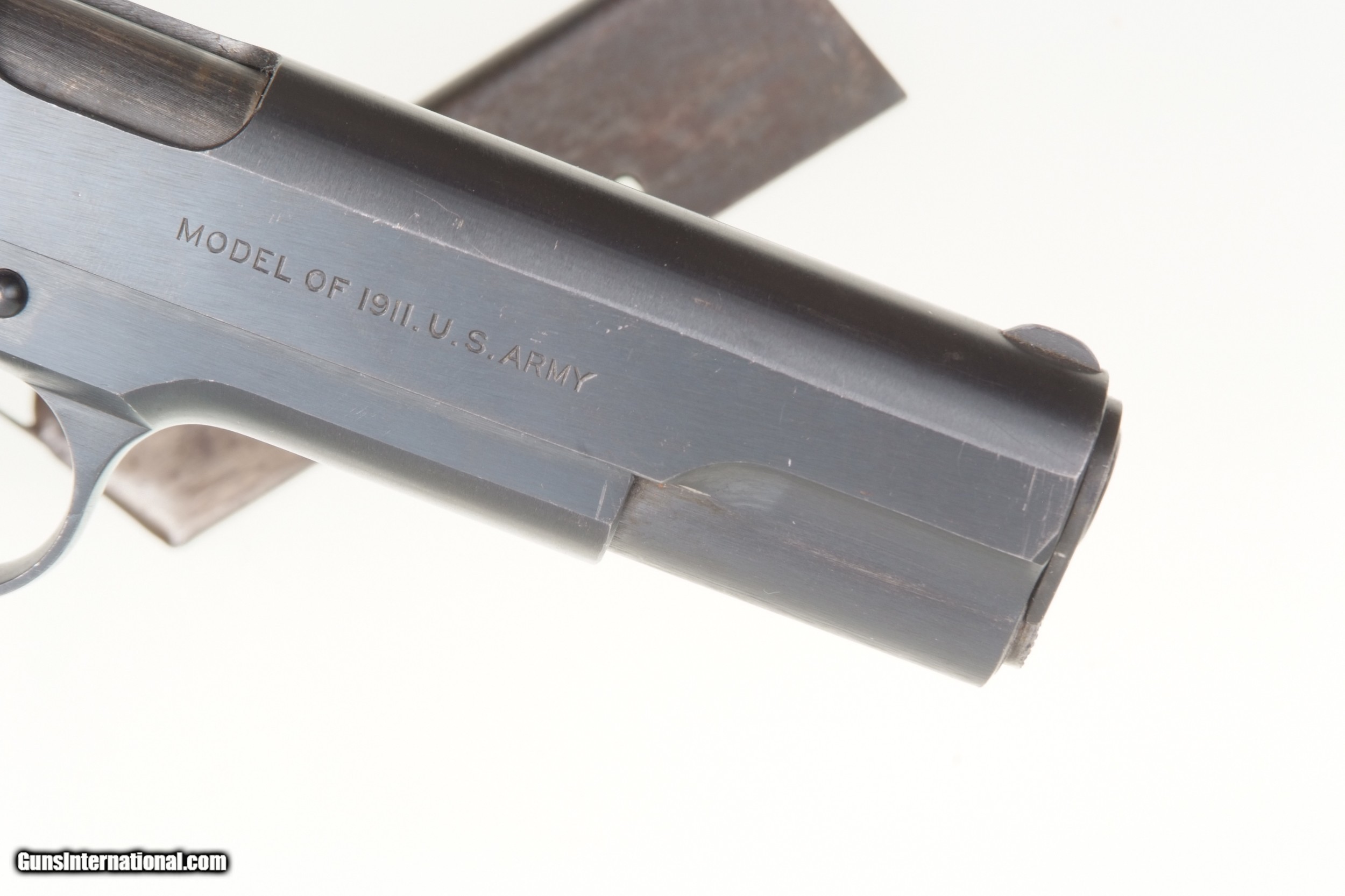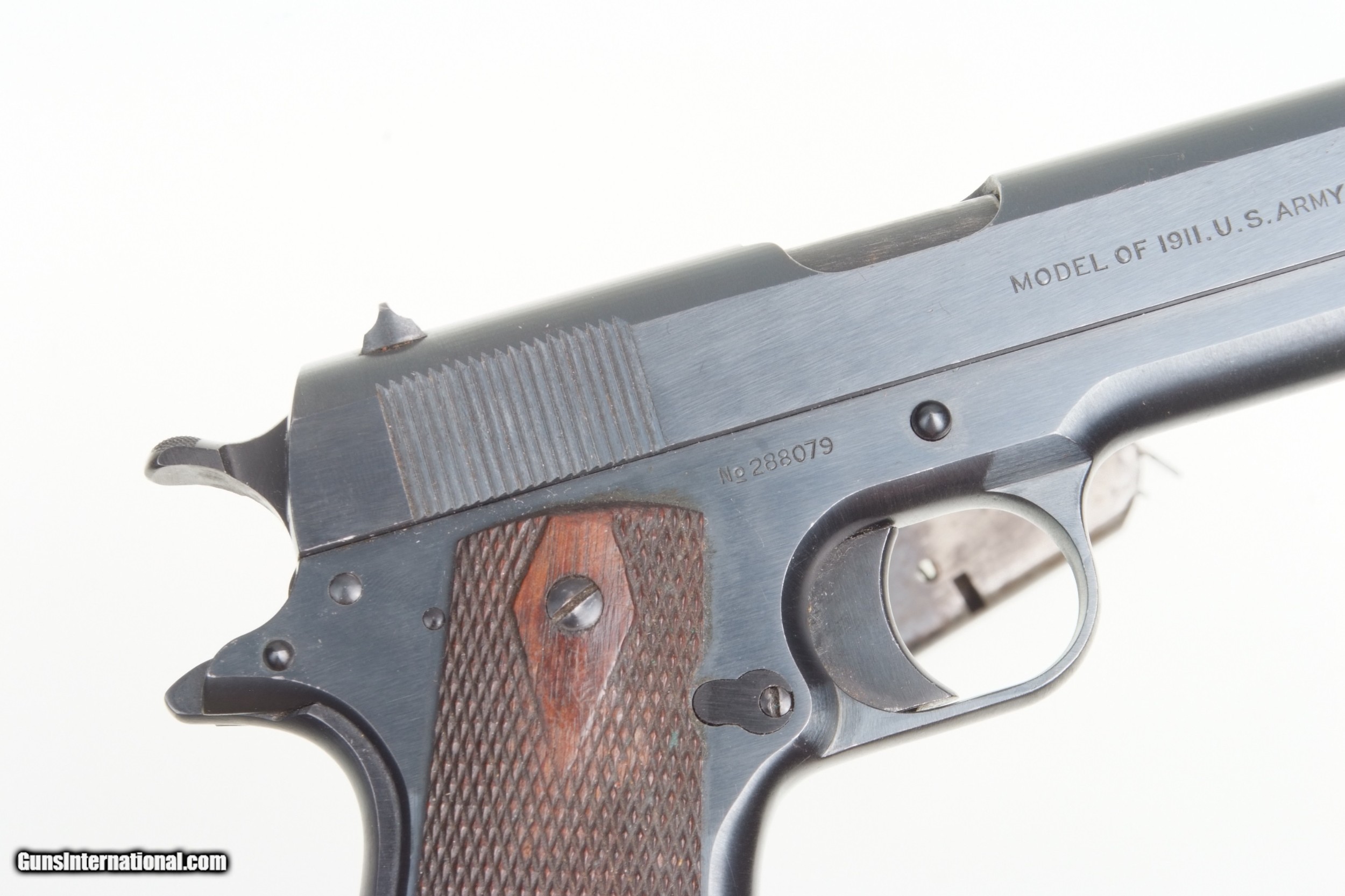 Description: Fabulous Colt 1911, Black Army pistol, as issued in WWI in 1918. SN: 288079. Cal: .45 ACP Spectacular late example of a Colt 1911 manufactured in 1918. Correct features include the borderless checkered hammer, "UNITED STATES PROPERTY" on left side of frame, Colt barrel Type 1 barrel with sideways "H" on back of chamber. Type A checkered slide-stock short tang and flat mainspring housing. Long trigger, type C magazine release. Large diamond checkered grips. Two tone magazine with 5 indicator holes marked on inner lip by American Pin Co. Spectacular original rough-milled pistol with minimal sharp-edge wear, largely on left side of muzzle, under trigger guard, and a few tiny handling marks on front and back strap. Crisp inspector marking through the blue, with raised edges. Grips a little darkened with a scattering of superficial marks, particularly the right panel. Good magazine with scattered areas of discoloration and fading as photographed. Bright bore with minimal dulling in grooves, perfect manuel mechanics. A great Colt 1911 Black Army that should satisfy any serious collector. SOLD Curio/Relic: Yes Manufacturer: Colt Model: 1911 Serial Number: 288079 |