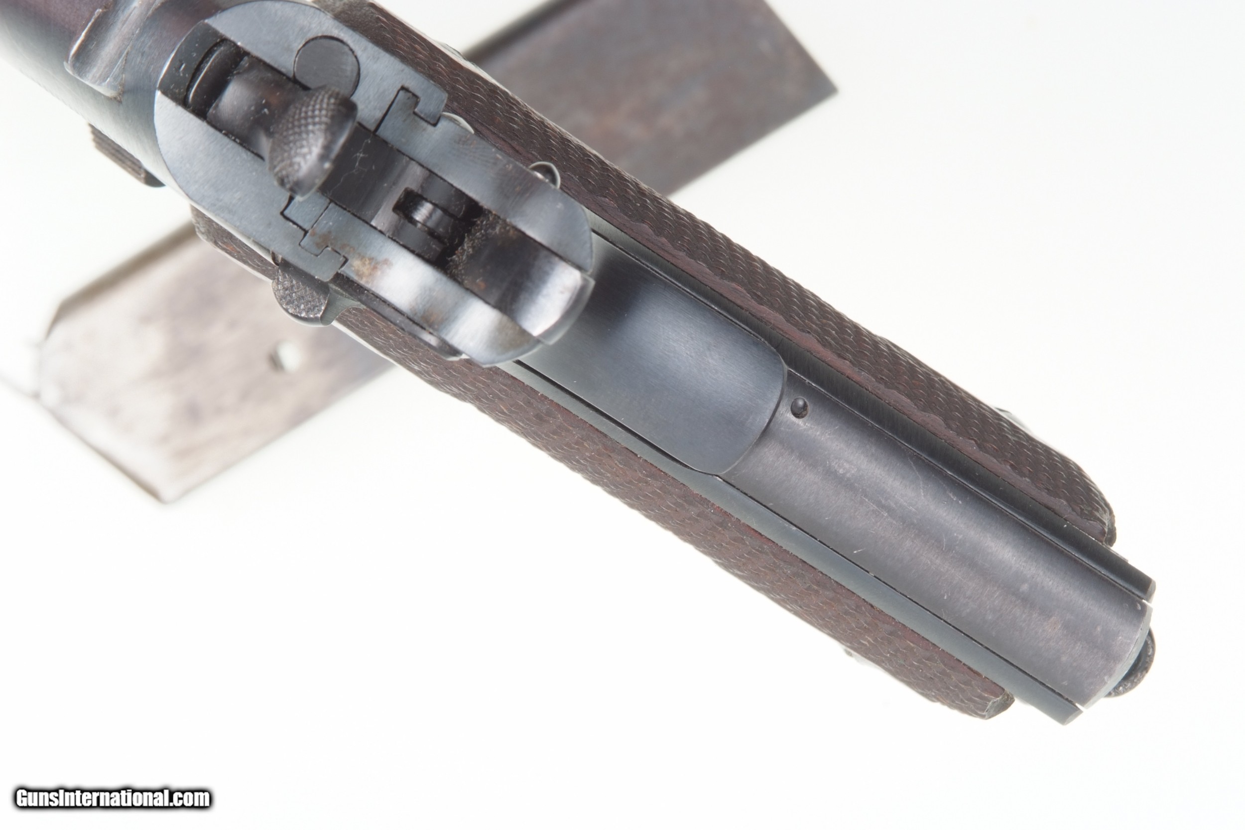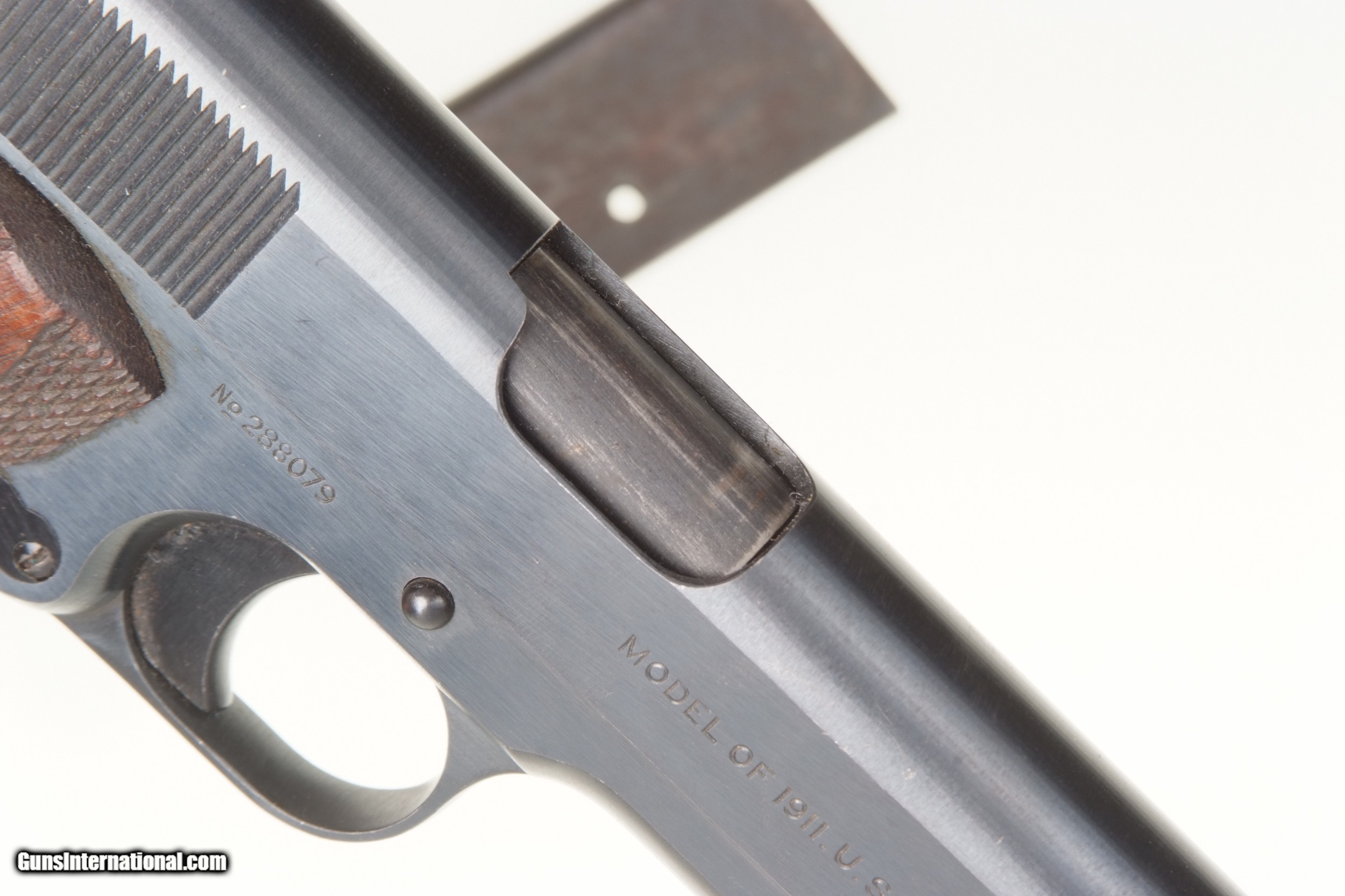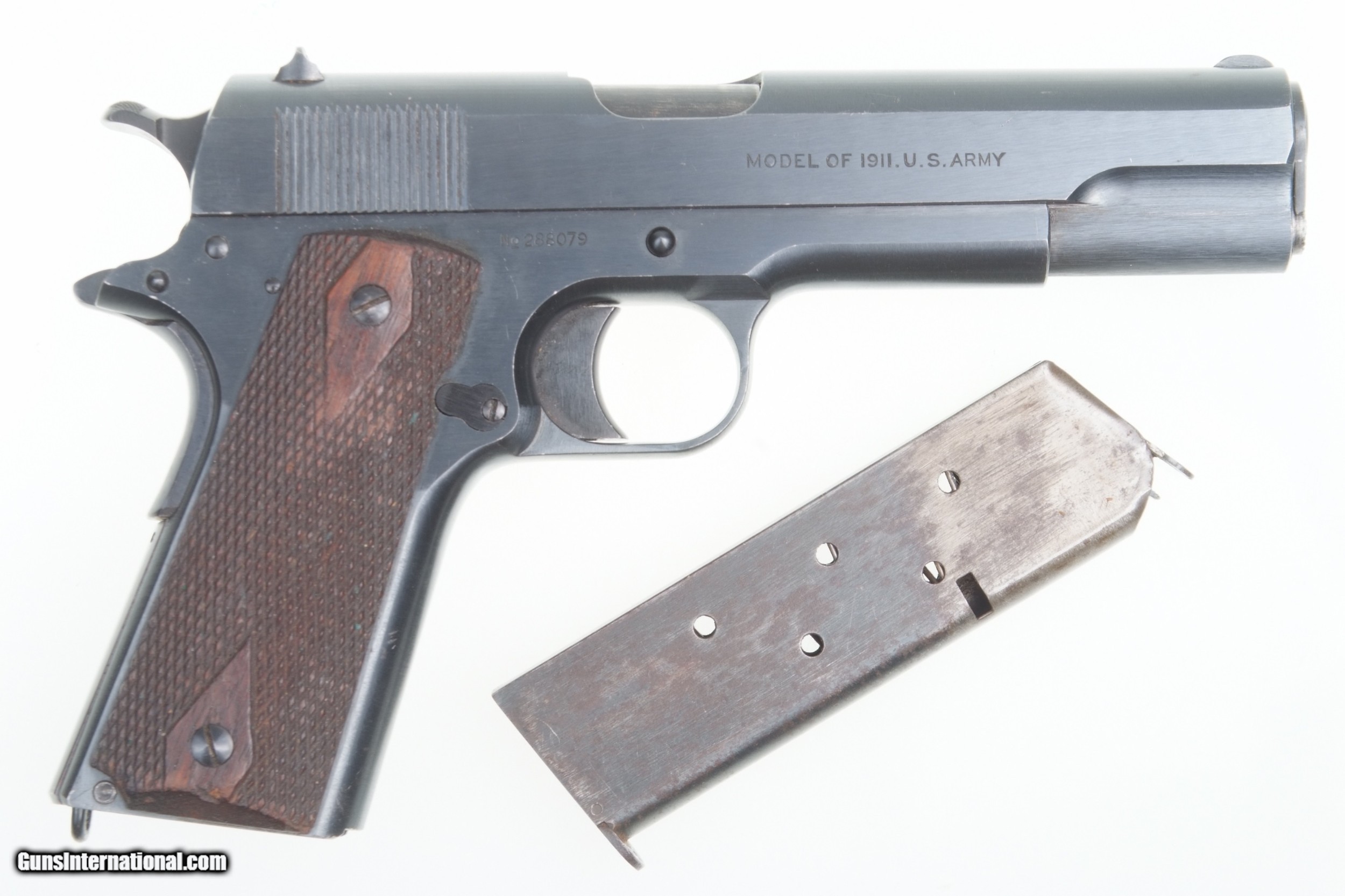 Description: Fabulous Colt 1911, Black Army pistol, as issued in WWI in 1918. SN: 288079. Cal: .45 ACP Spectacular late example of a Colt 1911 manufactured in 1918. Correct features include the borderless checkered hammer, "UNITED STATES PROPERTY" on left side of frame, Colt barrel Type 1 barrel with sideways "H" on back of chamber. Type A checkered slide-stock short tang and flat mainspring housing. Long trigger, type C magazine release. Large diamond checkered grips. Two tone magazine with 5 indicator holes marked on inner lip by American Pin Co. Spectacular original rough-milled pistol with minimal sharp-edge wear, largely on left side of muzzle, under trigger guard, and a few tiny handling marks on front and back strap. Crisp inspector marking through the blue, with raised edges. Grips a little darkened with a scattering of superficial marks, particularly the right panel. Good magazine with scattered areas of discoloration and fading as photographed. Bright bore with minimal dulling in grooves, perfect manuel mechanics. A great Colt 1911 Black Army that should satisfy any serious collector. SOLD Curio/Relic: Yes Manufacturer: Colt Model: 1911 Serial Number: 288079 |