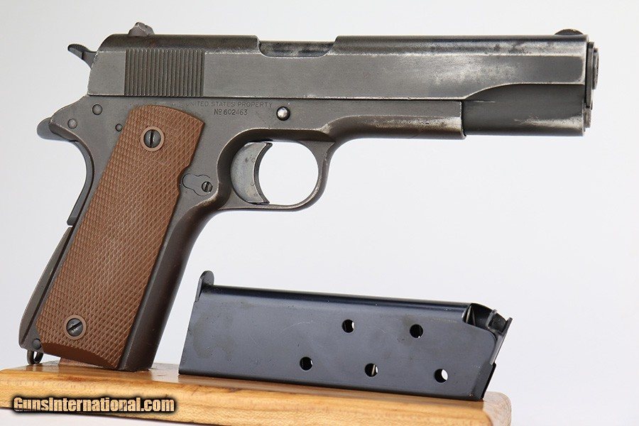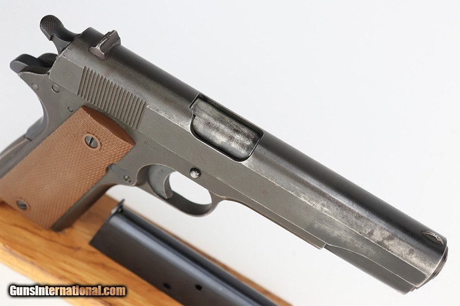 Description: This is a very nice example of a Colt 1911 that was reworked, possibly for re-issue during WW2. The frame was made by Colt and dates to 1919. WW2 Colt slide. WW2-era High Standard barrel. The gun has a parkerized finish and it has retained roughly 85%. There is wear around the high edges, most noticeable around the muzzle and on the right side of the slide. Light spotty discoloration here and there. Fitted with nice brownish plastic grips. Comes with a reproduction magazine. The bore has decent rifling, but there is pin-pricking throughout. SOLD Curio/Relic: Yes Handgun Caliber: .45 ACP (.45 Auto) |
