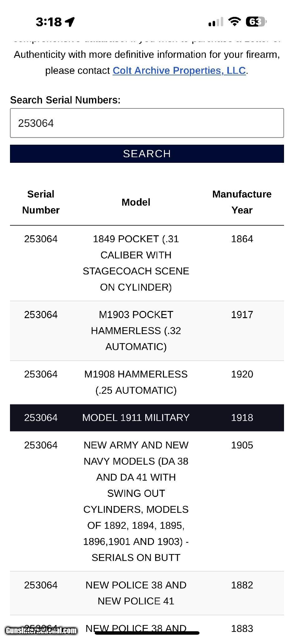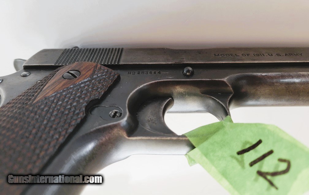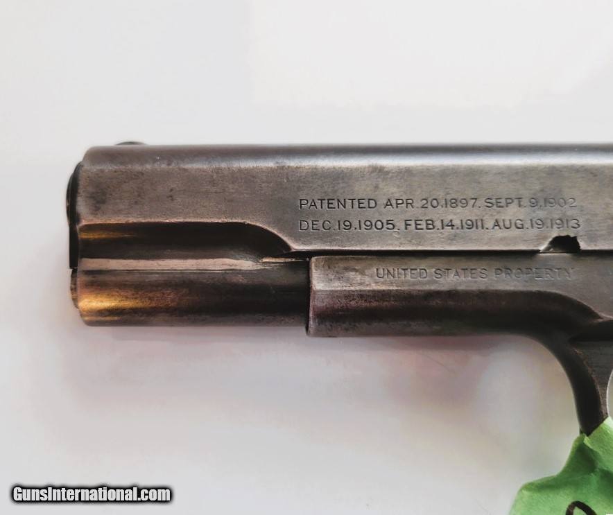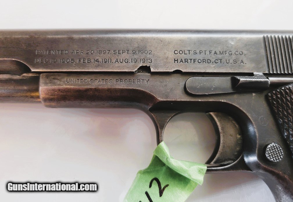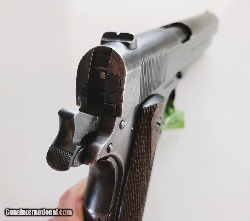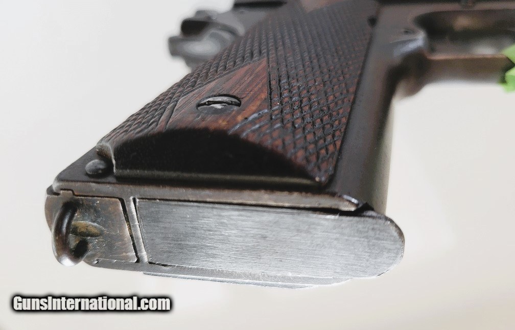 Description: Now here is an interesting piece of military hardware. We have a Colt's model 1911 issued by the US Government on a verified date (I have 2 sources one is Colt Archives shown below) of 1918. The pistol is in exceptionally good condition, is as tight as a drum with a seriously strong recoil spring. The finish is a gray patina with most all the bluing gone. There is no rust or corrosion. The wood grips are nice and clean with vibrant checkering, no chips no cracks. The mag well slick and clean. The firearm is C&R qualified. The little snippet of info provided me is that the pistol was manufactured near the end of WWI. It went into gov't storage and then re-issued for WWII. I do not know what theater of the war. Once returned to post WWII stateside gov't possession, it was refitted and then re-issued for the Korean war. After returning post Korea, it gets dim and found its way into the hand of a collector. I do not pretend to be an expert on war time firearms - I'm just the seller and this is a consignment item. If you have questions, if I can't answer, I'll gladly forward to the owner where hopefully the info can be provided for you. I tried to include as much of the stamped information as possible. Let me know if I have missed something. The sale includes the 1911 pistol and one steel magazine of unknown origin ONLY. Please review and the images and email with any questions you might have. I am a licensed FFL dealer with many years experience selling nationally, internationally and on the Internet. Shipping to your FFL in the lower 48 is $40 (lower 48) insurance is EXTRA but highly RECOMMENDED. Absolutely NO California, New York or Maryland Sales. No exceptions. No face to face sales - must ship to your FFL - NO EXCEPTIONS- I ship USA only - I live in a remote area and cell service is spotty. The best way to contact me is using the Guns International email that you can access at the upper right panel that says: Email Seller. NO TRADES. ******IMPORTANT**** PLEASE REMEMBER TO REFERENCE MY INVENTORY NUMBER THAT WILL INDENTIFY THE FIREARM YOU ARE WANTING TO PURCHASE. Accepted methods of payment are USPS Money order or cashier's check drawn on your bank. NO CREDIT CARDS Please include a copy of your dealers FFL with payment. Please contact me with any questions you might have. Mail payment and FFL to: Gary Martin 601 Hale St. Llano, TX 78643 Handgun Caliber: .45 ACP (.45 Auto) Manufacturer: Colt Model: 1911 Barrel Length: 5 Condition: Very Good Metal Condition: Very Good Wood Condition: Very good Bore Condition: Very good Action: Double/Single Sights: Fixed Manufacture Date: 1918 Grips: Wood Price: $3,000.00 Shipping: $40.00 Contact Seller |