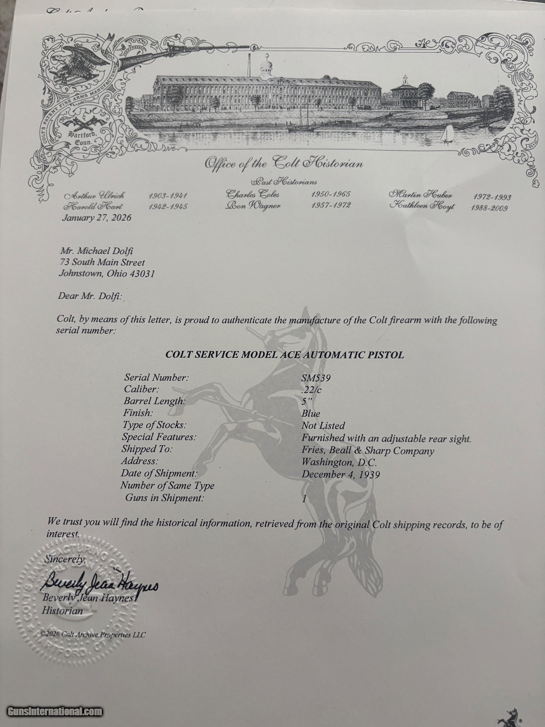 Description: Offered for sale is a fair example of a very hard to find pistol, the Colt Service Model Ace. This model was the most expensive pistol that Colt sold costing about $60, that's $20 more than a .45 at the time. They had hand honed match grade actions and were equal to the National Match and Super Match's. The early guns like this one had a unique roll mark which was essentially the standard ACE roll mark with the words "Service" and "Model" added. At around SN SM 700 the model got its own roll markings. First model Service Aces like this are very rare. Most were shipped to the US Military. Many were known to have been issued to the US Navy and are certainly lost at sea during WW2. This pistol is one of the only 500 that were shipped commercially. Factory letter is on order and will show commercial shipment in 1938. This example would be a good candidate for a Turnbull quality restoration. The pistol is complete with all original parts, grips, matching serial numbered slide and early correct magazine. A rare gun! Price: $3,699.00 Shipping: $45.00 Contact Seller |