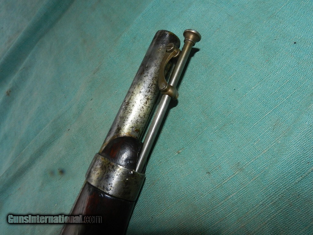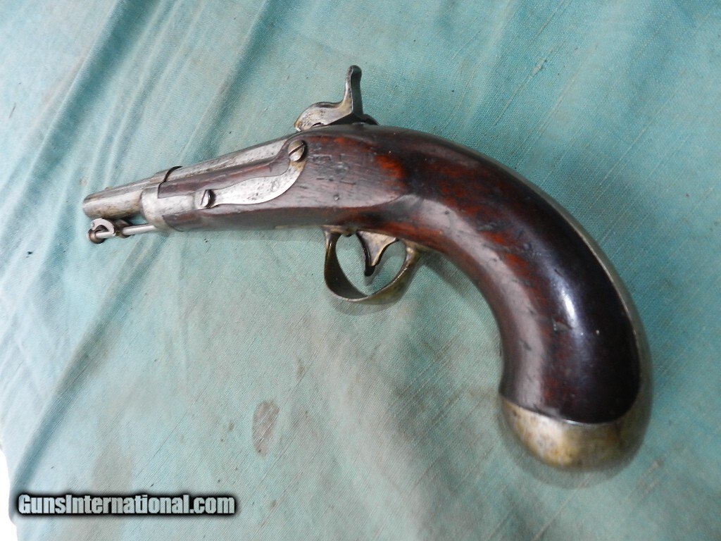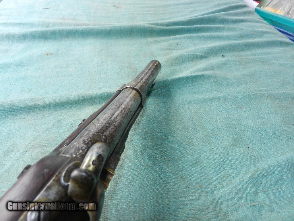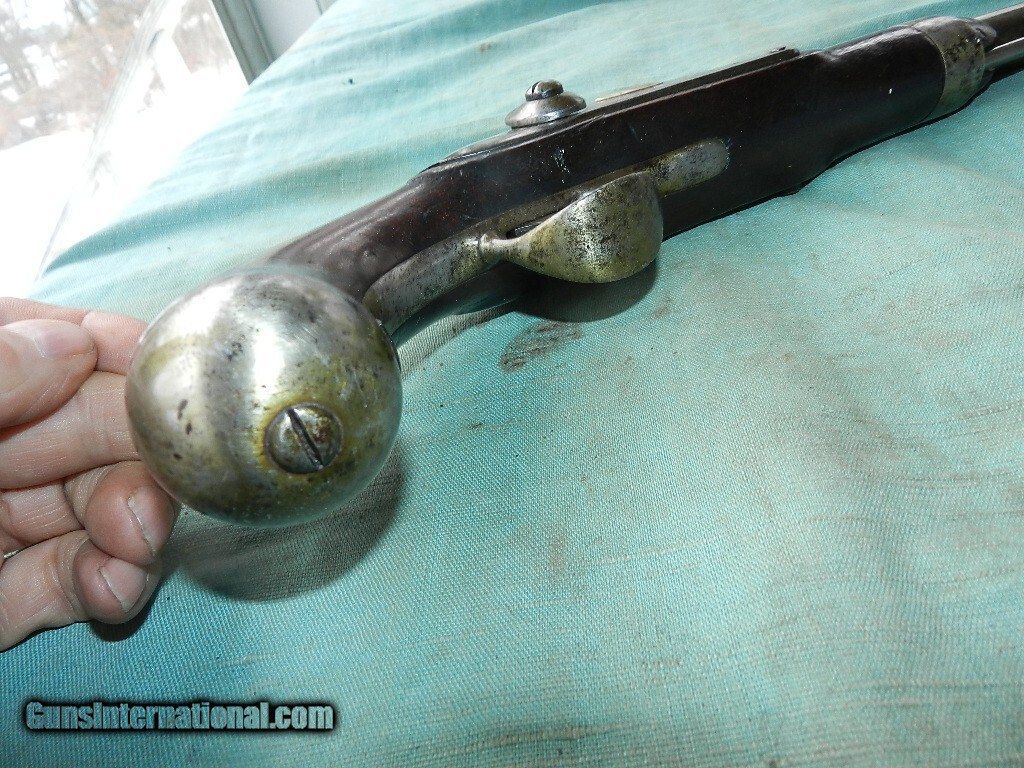 Description: At .54 cal, with an 8 1/2” round barrel with a moderately oxidized bore. This pistol was converted using the Belgian method,and has the conversion of the Confederacy as the lock-plate marking about removed and the hammer was shaped and bent over from anothewr weapon with shallow dents from heating, and bending, and not U,S. Armory type workmanship duting that time.. And the metal surfaces mostly pewter gunmetal patina with areas of salr & pepper pitting near the breech from extended usage. The hammer appears to be from a Maynard system firearm and the swiveling ramrod assembly parts are later replacements. Markings have mostly been removed, with lockplate showing legible but faint, “US” And the brass pan toned to goldenrod. The smooth walnut stock rates about very good with some old cracks and thin shallow chips behind lockplate and near lock screw with old added finish and scattered dings. The left flat and the lock seems to be functional , and the nipple is clogged will try to replace it soon. When buying a gun always have it examined by a competent gunsmith before shooting. To buy a gun from me you must get a direct email for me, with details, and shipping cost. We don’t have a web site .I prefer money orders or a check. Item ships when funds come in. I try to keep guns affordable, which means I make less money than most dealers. You won’t get altitude sickness, or nose bleed, with my prices! I consistently have the best selection of older guns If you attempt to buy, you must still contact us for details . Best to email to buy. Sometimes a local person can stop buy and purchase before the gun is removed. Sometimes not home to get calls. Some guns are required shipment to a gun dealer near you for a transfer to you when it arrives. Otherwise many older or black powder guns ship to your door. With the widest selection of older guns at great prices, We don’t have a store, and sell on the internet only. I’m easy to get along with. Thank You Antique: Yes Price: $1,495.00 Contact Seller |